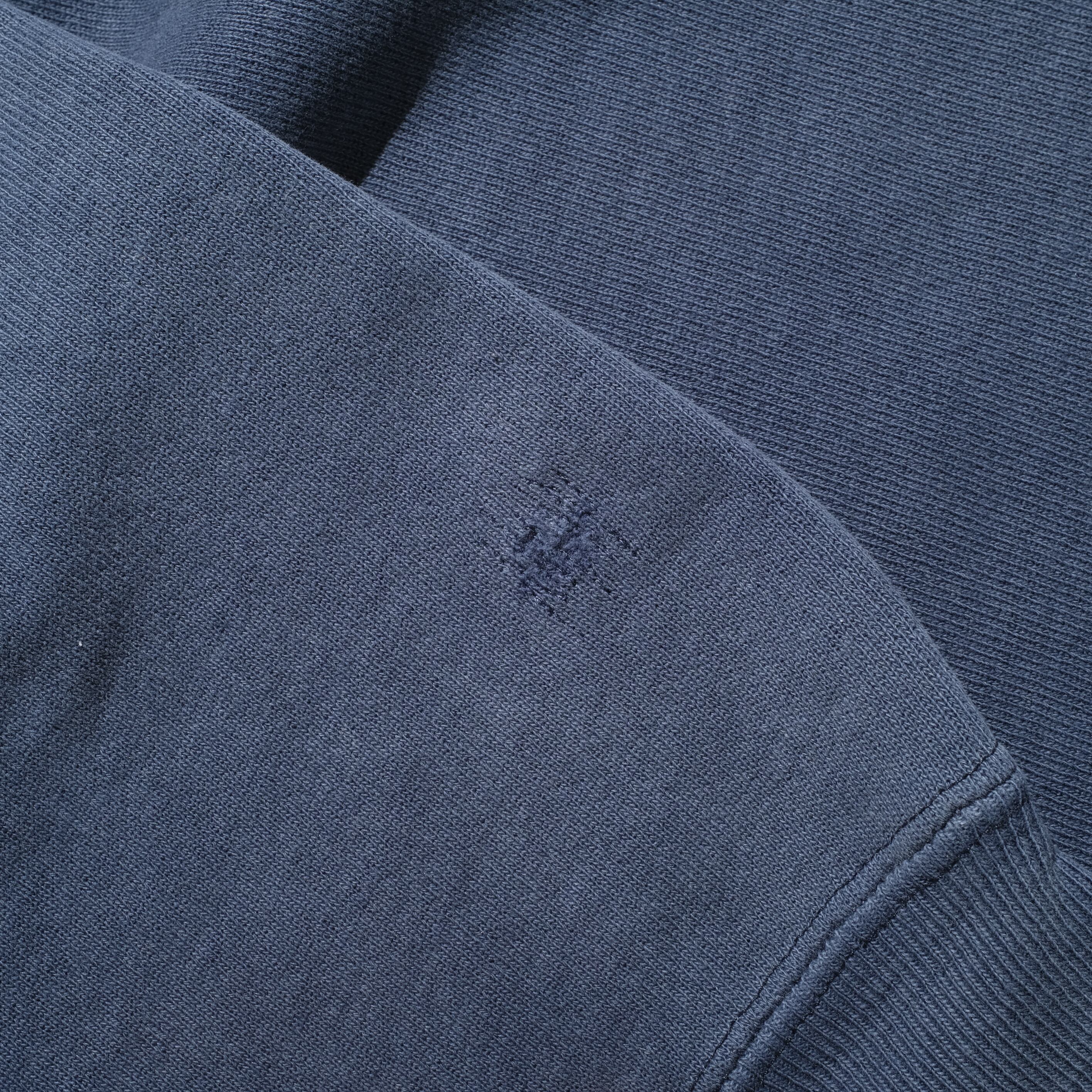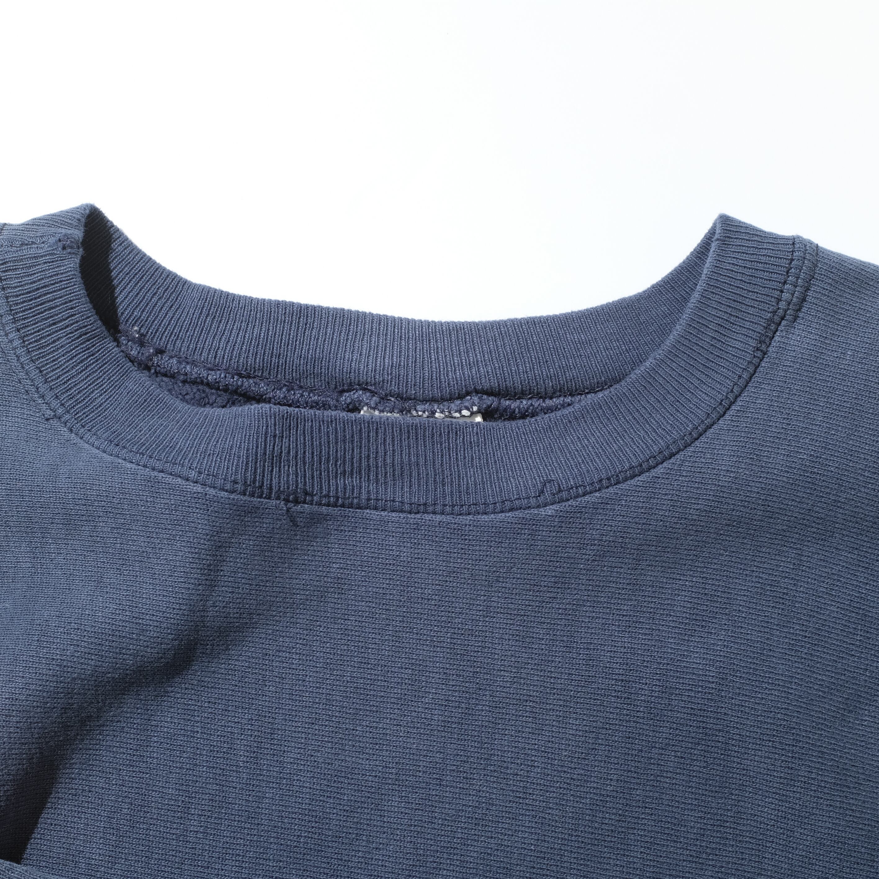 カラーはネイビー、サイズもLと抜群の一枚。もはやデニムのアイテムと同じようにフェードやヨゴレ、ダメージも味になるリバースウィーブですが、右腕にダメージがございましたのでリペアいたしました。