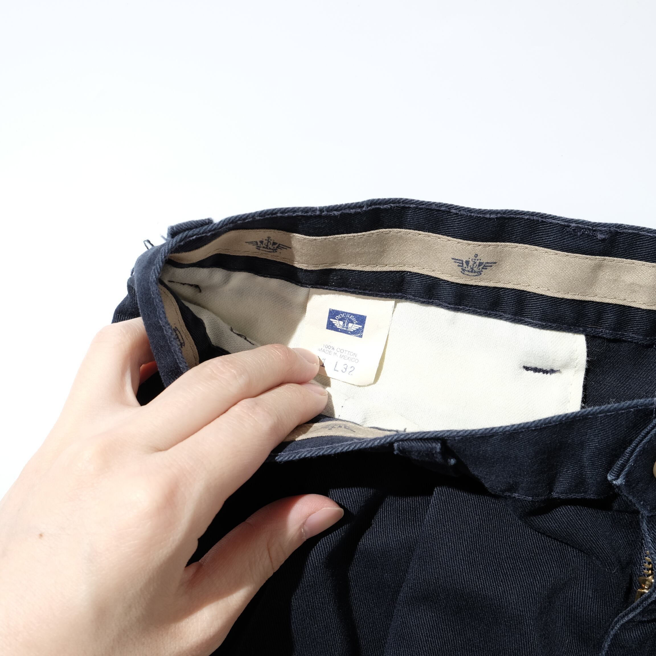 99年メキシコ製とこのモデルのなかですと古めの一本。そのクオリティの高さから近年注目度の高まっているDOCKERSですが、この個体も例に漏れません。ネイビーのカラーに光沢感のあるチノクロス、オールシーズン活躍すること間違いなしの一本です。サイズの合う方は少しめずらしいメキシコ製の一本を選んでみるのはいかがでしょうか。