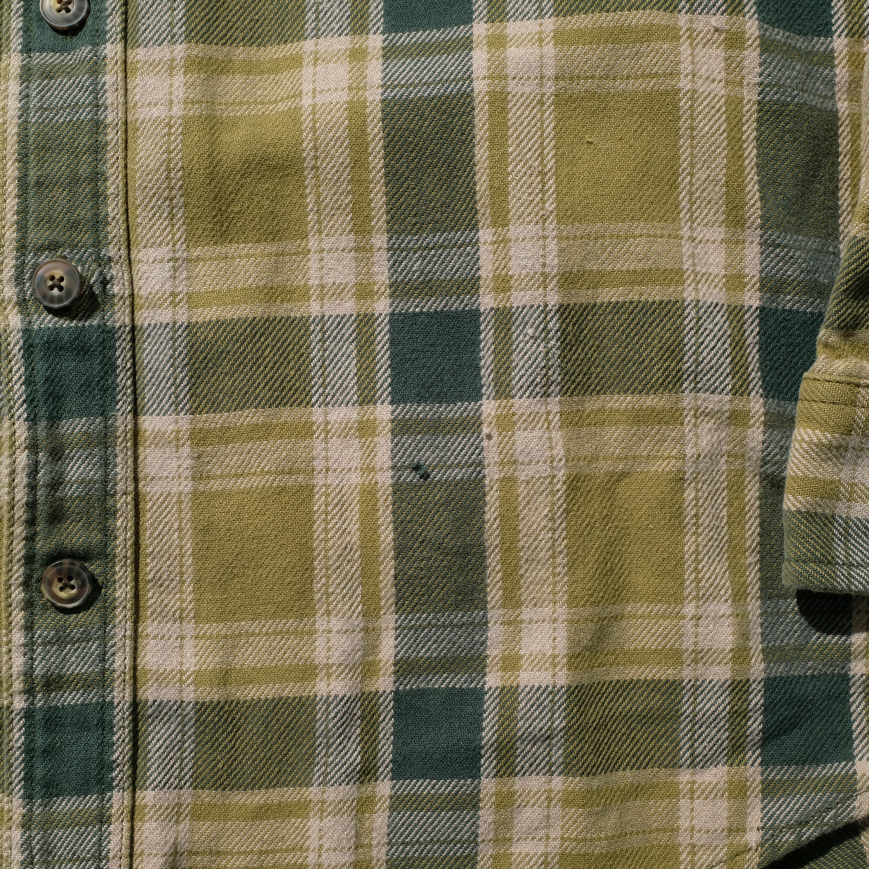 全体的に糸飛び、ヨゴレなど着用感のある個体ですが、元来ワークがルーツのネルシャツというアイテムですし、個人的には好きな雰囲気です。