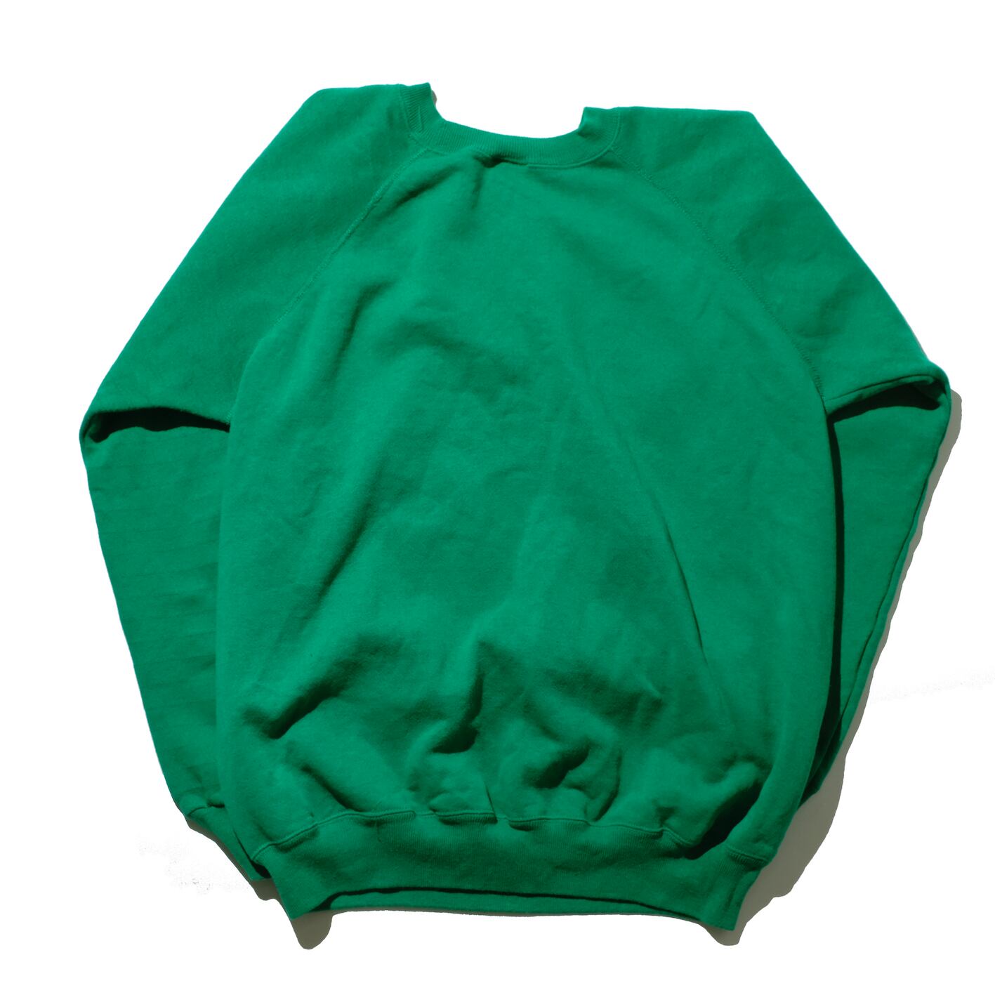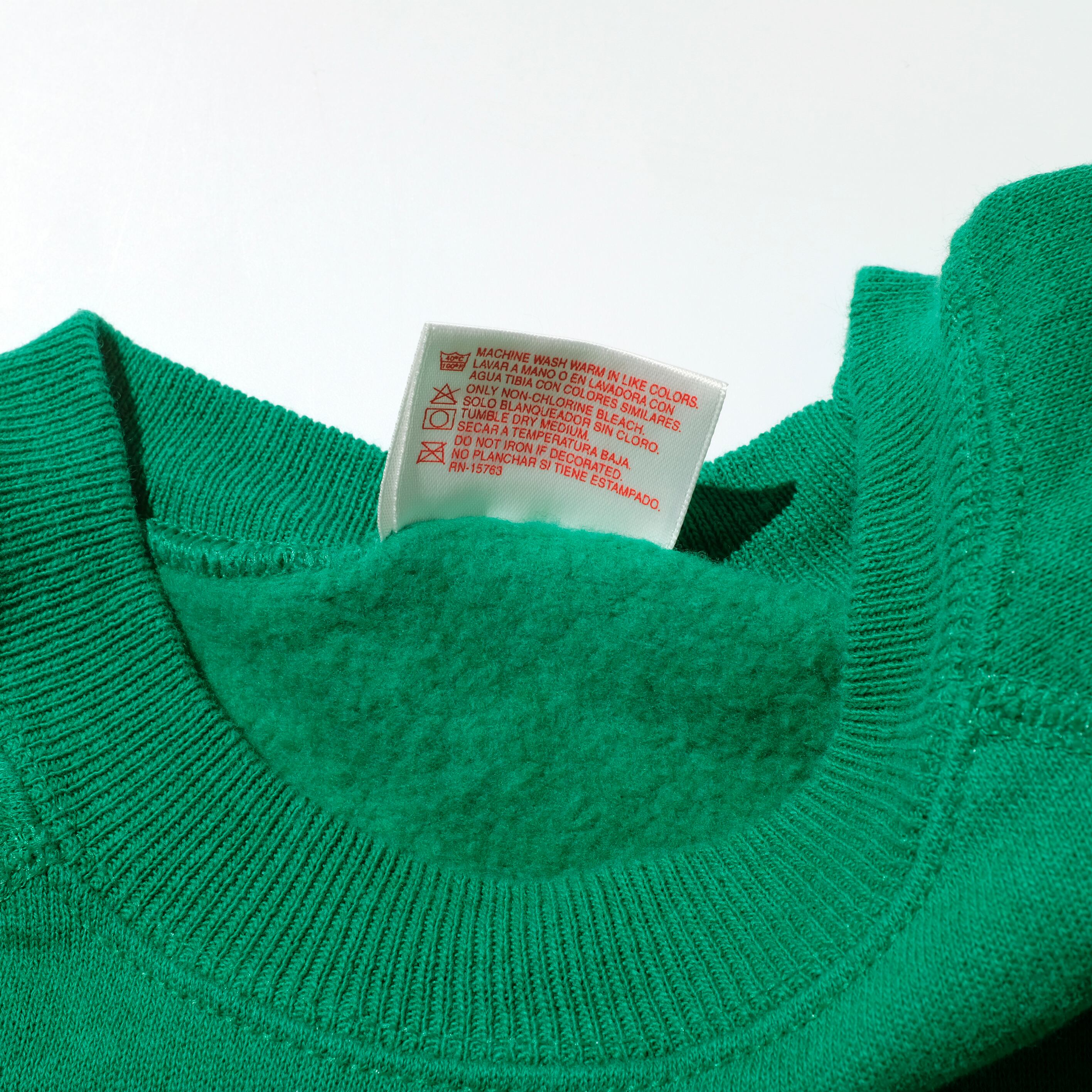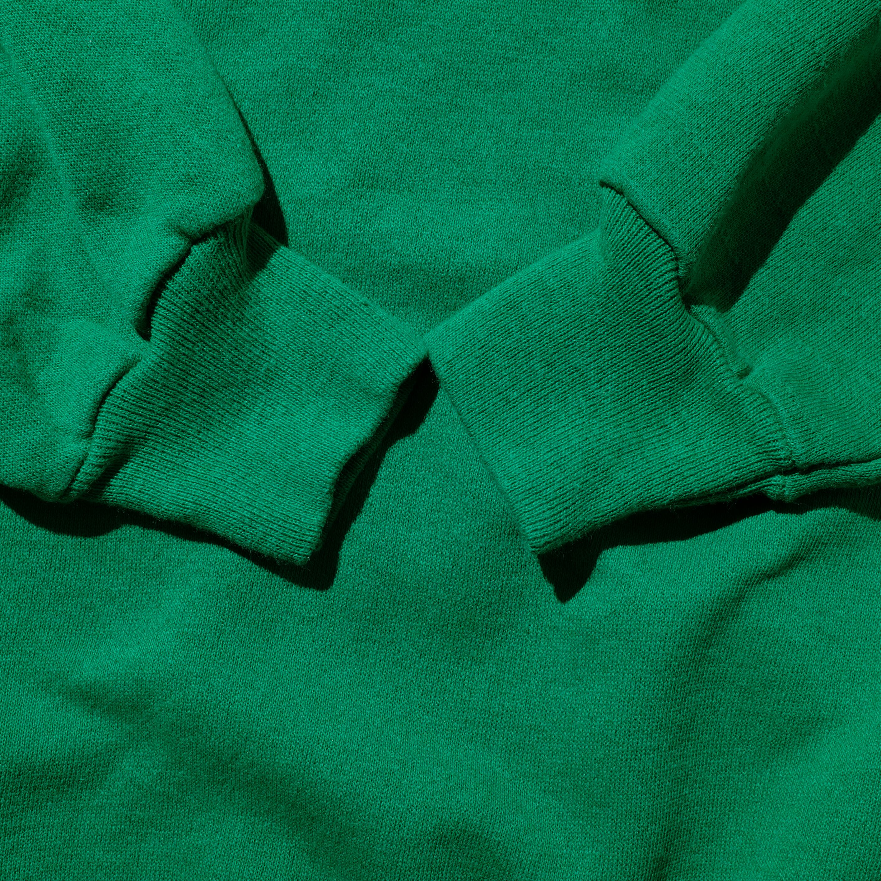 貴重なUSA製の一枚。チャンピオンのリバースウィーブが高騰しきったなか、やはり注目するべきがこのUSA製のスウェットたち。こちらはその中でもラグランスリーブのディテールにグリーンのカラー、そしてXLのサイズが魅力的な一枚。また狙ったものなのか不明ですが左袖のみ生地に縞状の模様の見える生地にになっており、そちらも良いデザイン的アクセントになっております。お探しだった方は是非ご検討ください。