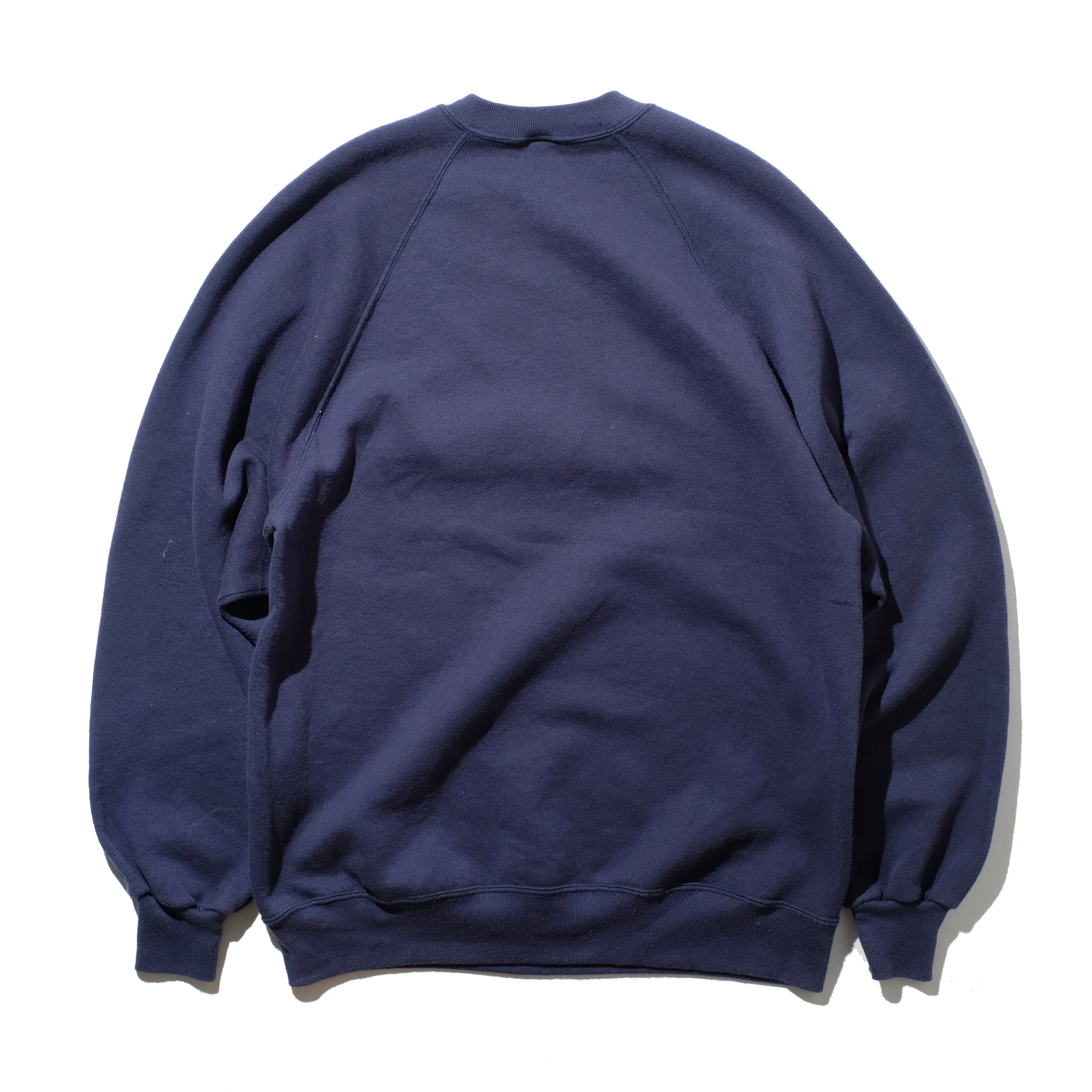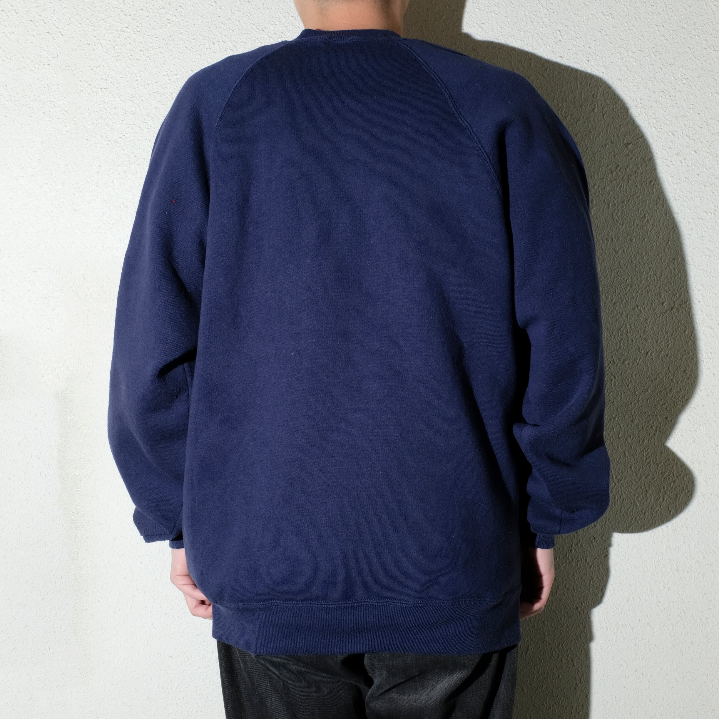 こちらはUSA製、ラグランスリーブのディテールの一枚。セットインのものに比べ、若干着丈が長く身幅が細まった印象の一枚。XXLの表記サイズですのでゆったりと着れることに違いはありませんが、アウターとのバランスなどでこちらを選択するのもアリでしょう。ネイビーの色目も合わせやすく魅力的です。おすすめのUSA製スウェットですが、なかでもラッセルの手がけるJERZEESは特におすすめです。是非ご検討ください。