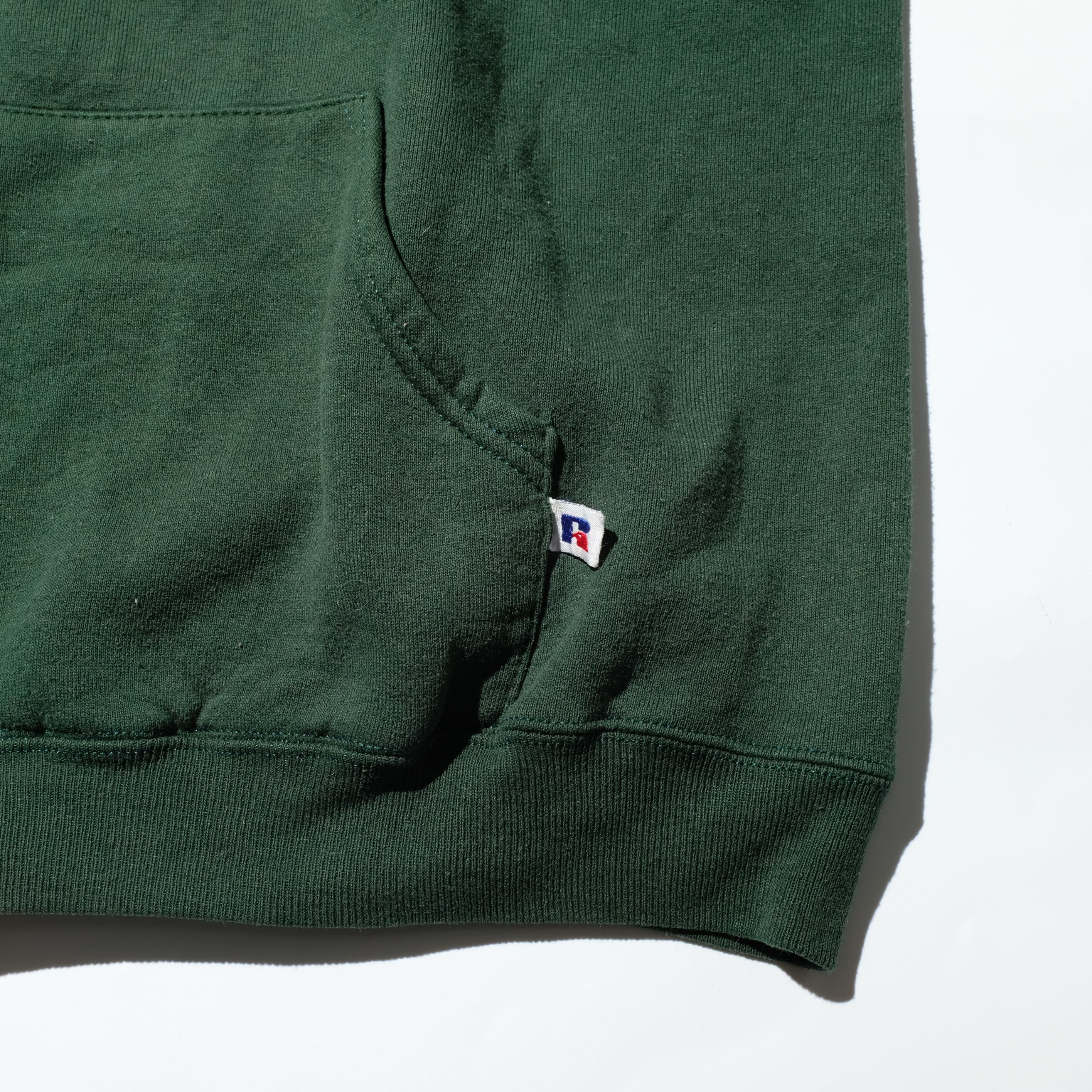 チャンピオンリバースウィーブの高騰、流行もあり、近年人気の高まっているラッセルのスウェット/パーカー。こちらは80年代のプリントタイプのタグのつく、グリーンのカラーに3段プリントが秀逸な一枚。着丈の短く身幅、肩幅のある横に長いシルエットが素晴らしいです。