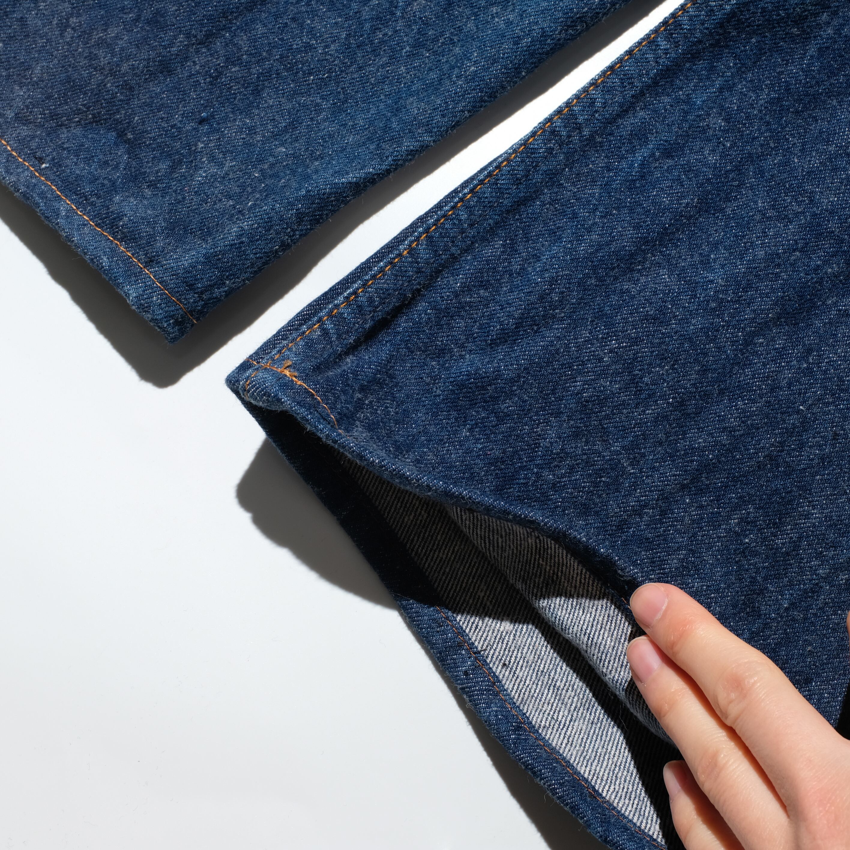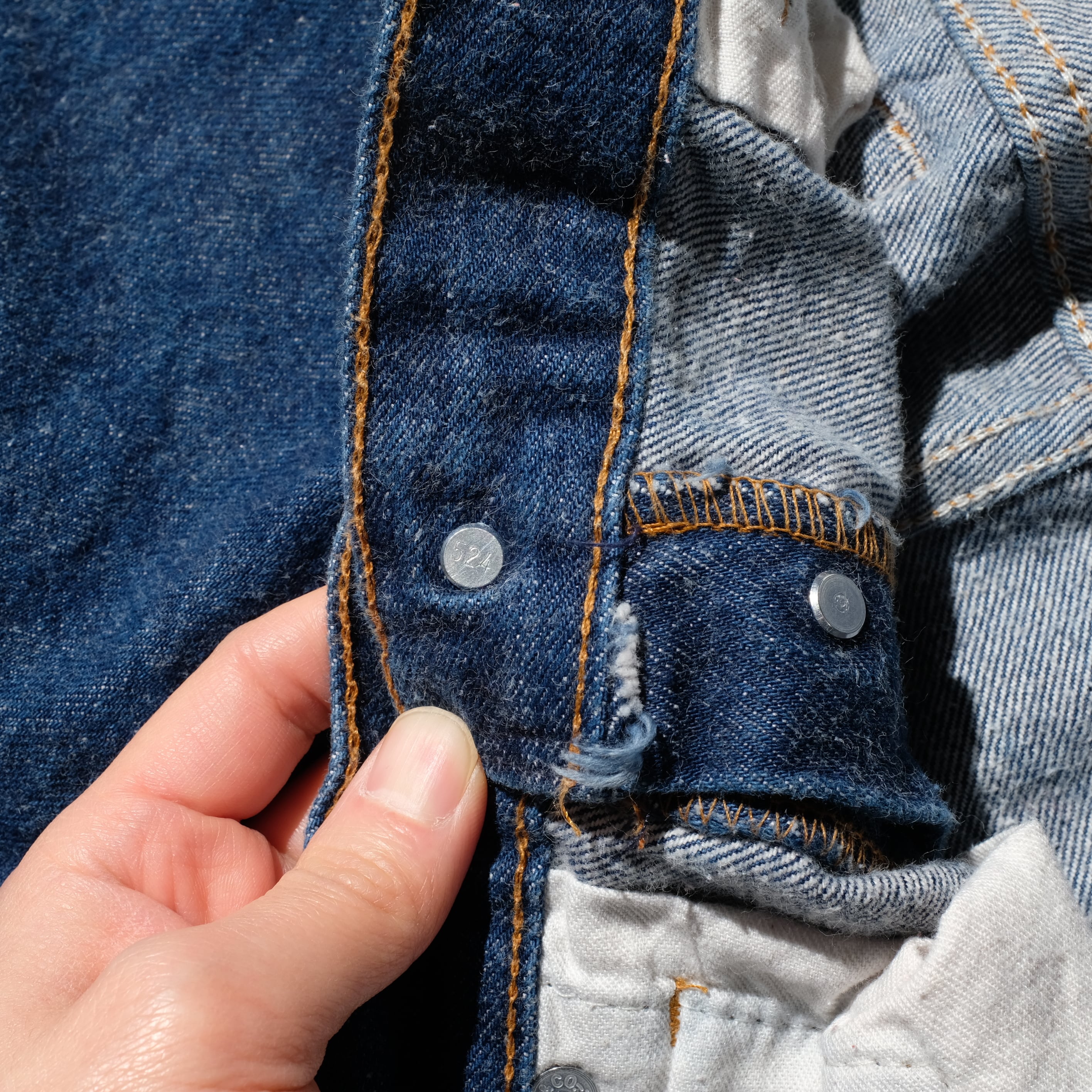 ただ、こちらの個体、実寸でもわかりますとおり36×30のサイズからいわゆるクロップド丈でカットオフされておりましたので、なるべくレングスの残るよう当店の方で丈直しを入れた個体となります。80'sの501のインディゴの質感などもちろん素晴らしいですし、レングスが表記通りのオリジナルサイズであれば2倍以上のプライスとなってまいりますので、この丈感でお探しの方にはかなり狙い目の一本となっております。