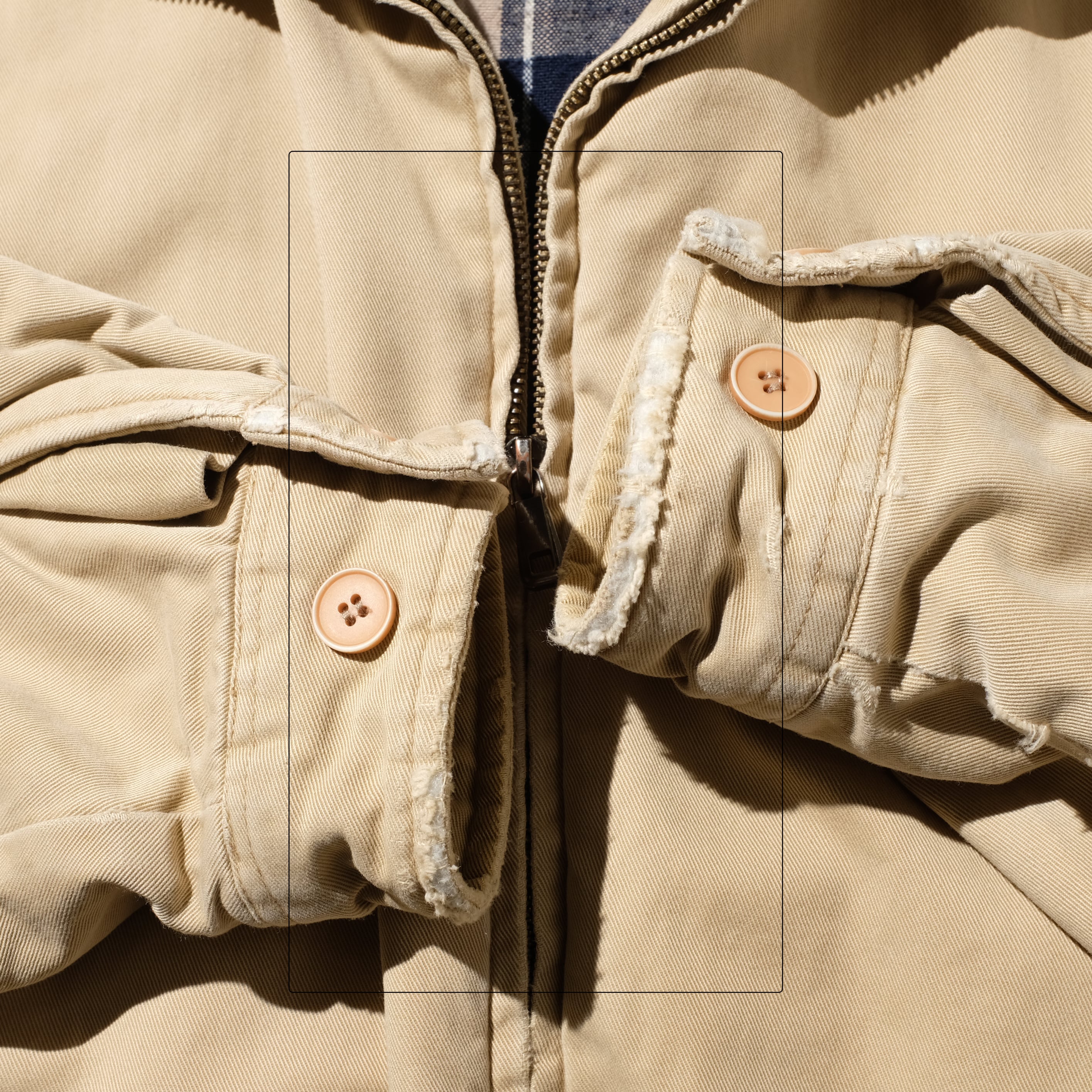 中綿の詰まった防寒性のある一枚。スタンドカラーの仕様に襟内側がコーデュロイの気の利いた仕様です。全所有者が襟部を半分に折って着用しており、首元と袖部分にダメージがございますので、抑えたプライス設定でのご案内となっております。