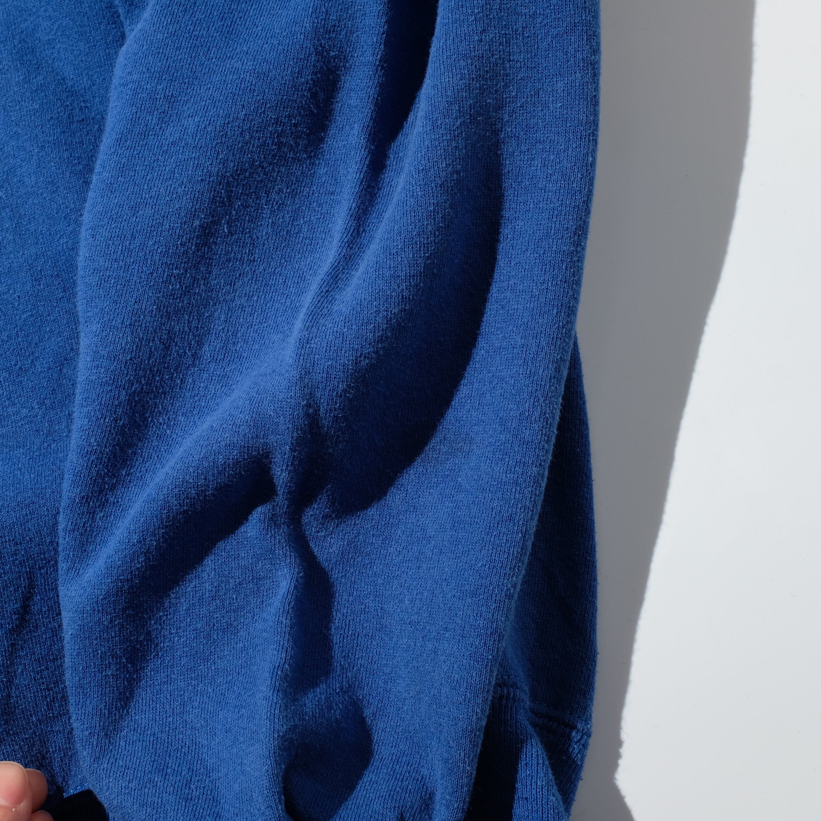 ブルーの合わせやすいカラーがインナーとしても、一枚で着るにも万能な一枚。
