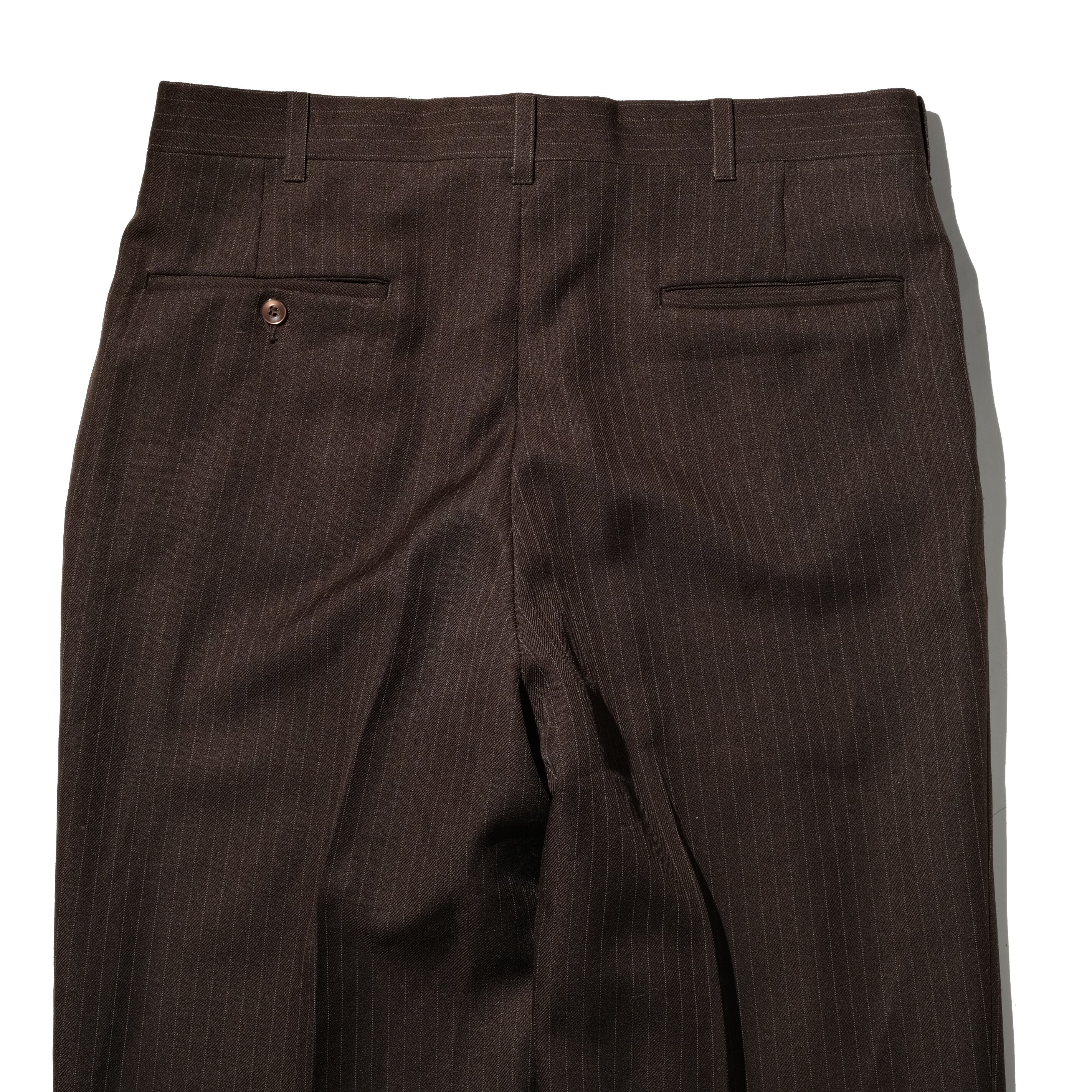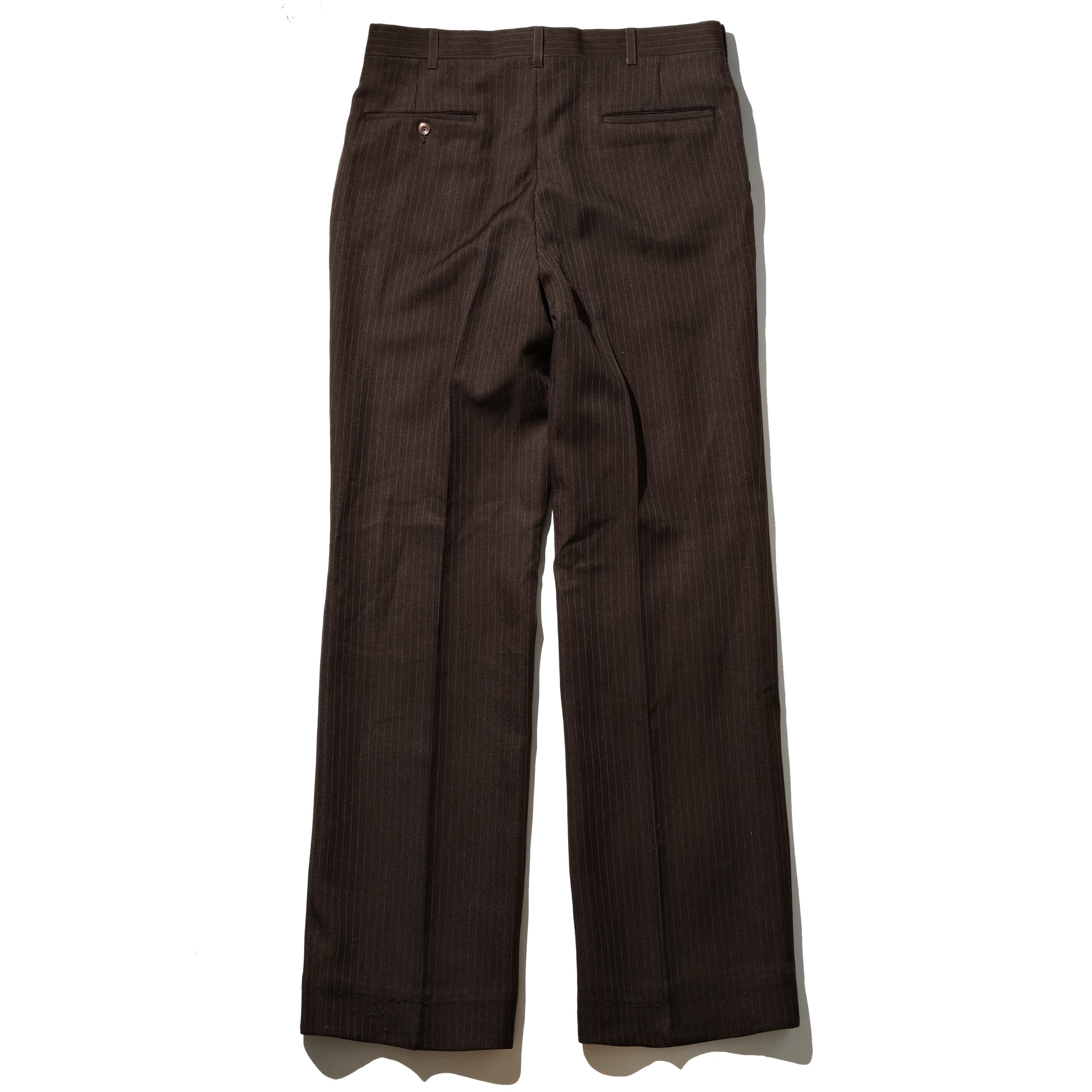 濃いブラウンのカラーに控えめなストライプの入る、良いデザインのフレアスラックス。