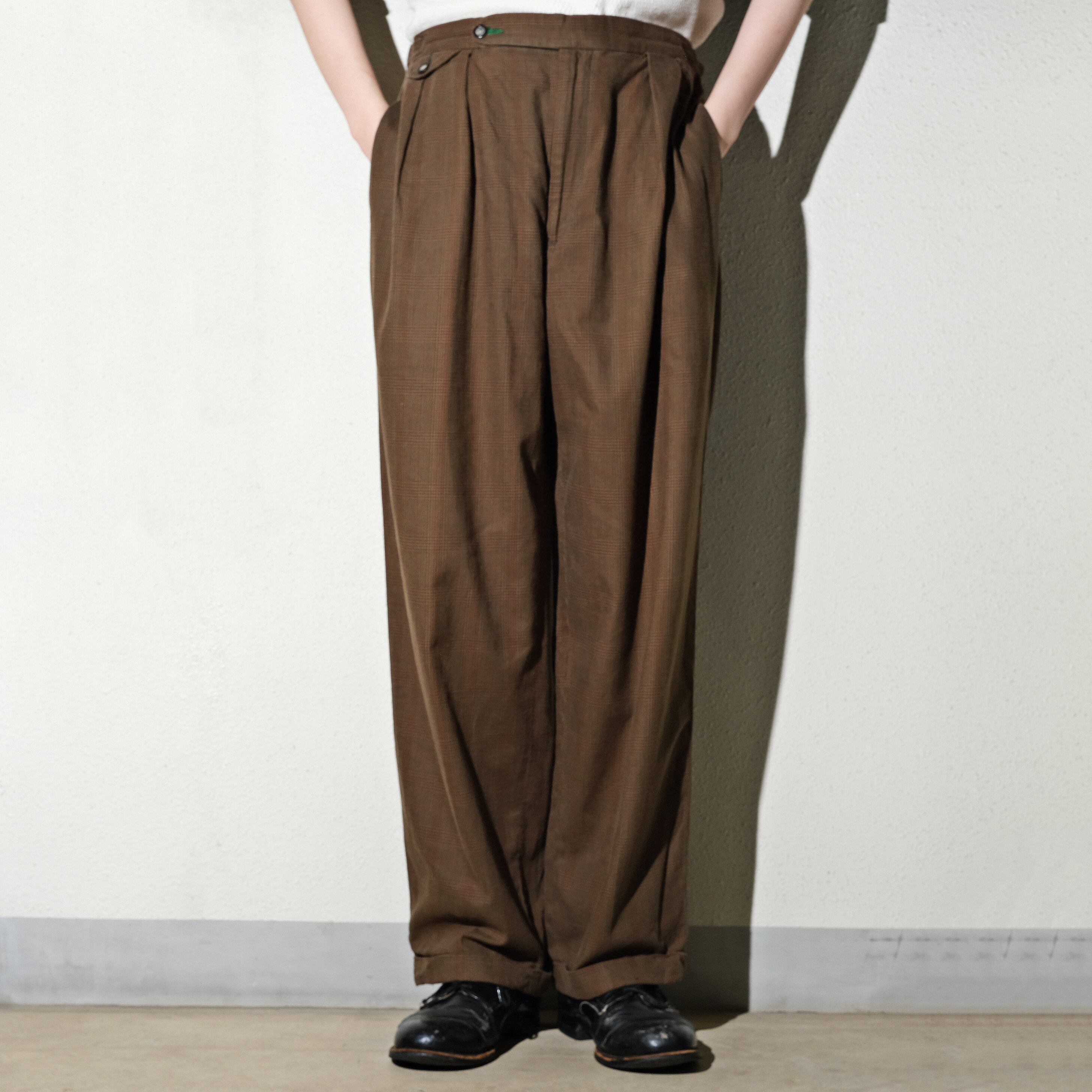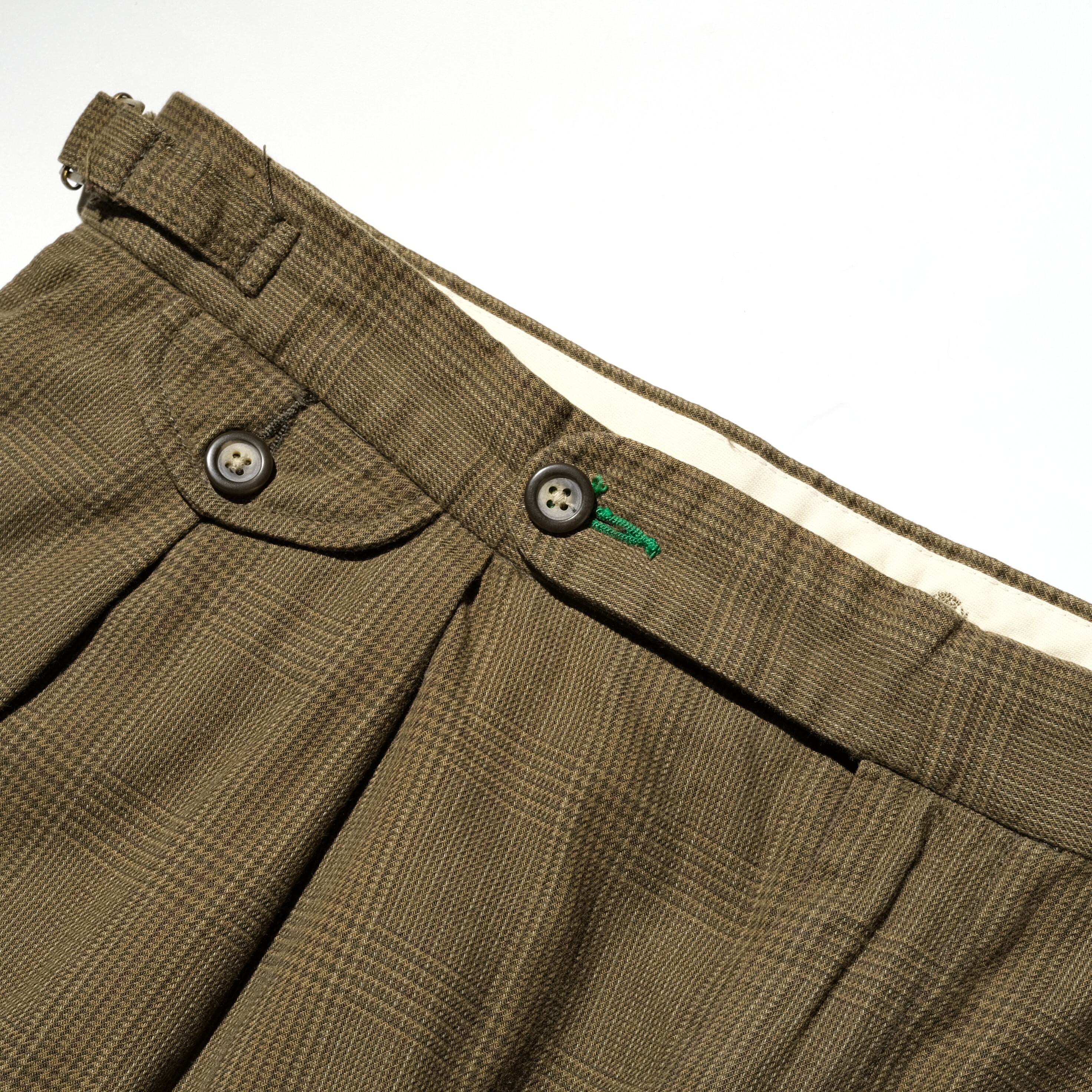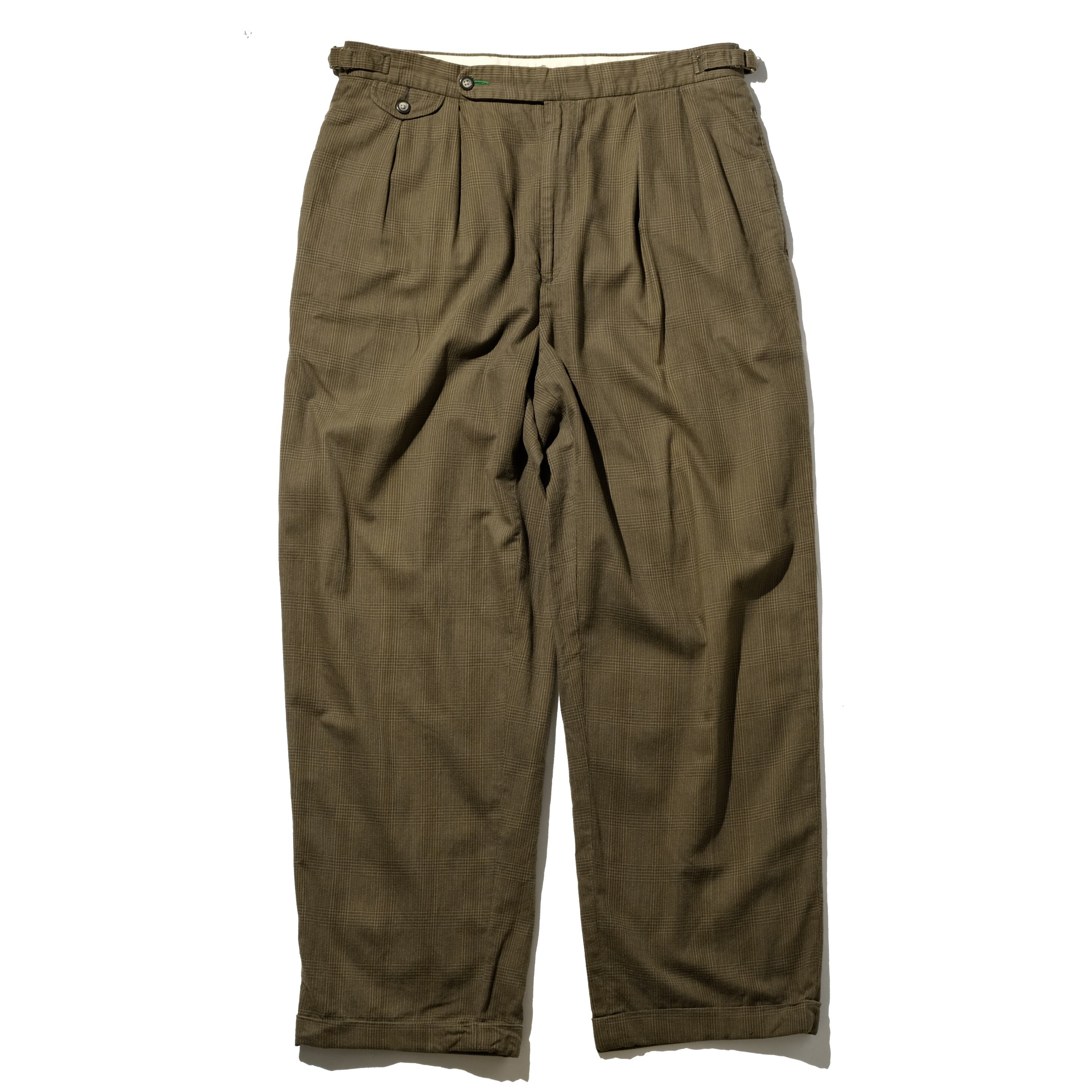 オリーブカラーに上品な細かいチェック柄、そして太いシルエットが印象的な一本。サイドにアジャスターがつき、ベルトループのないクラシカルなデザインのアイテムになります。