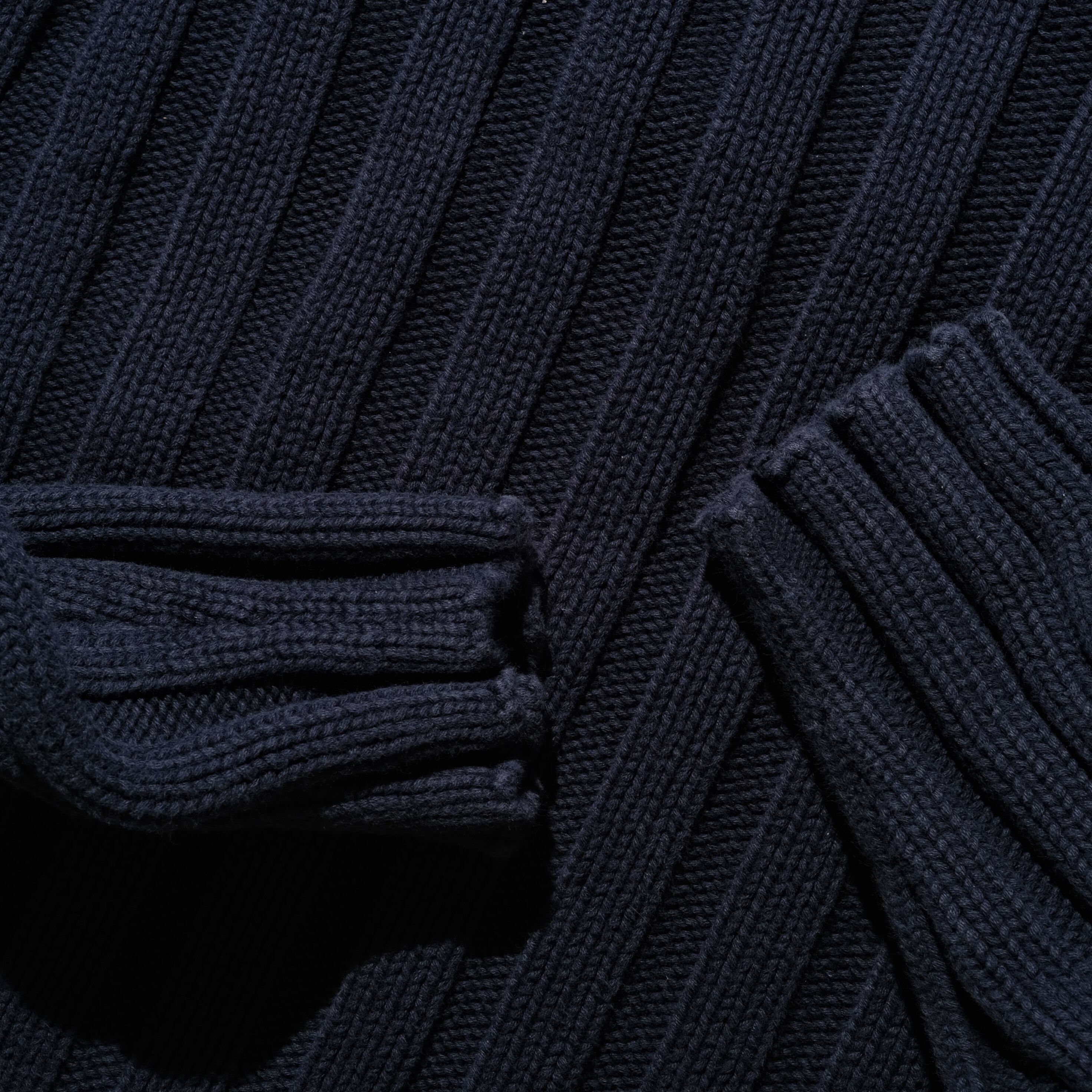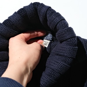 ネイビーの色味に肉厚なコットンの質感が魅力的な一枚。首元までこの厚手の生地があるとデザイン的にもアクセントになりますし、保温性という意味でも嬉しいです。