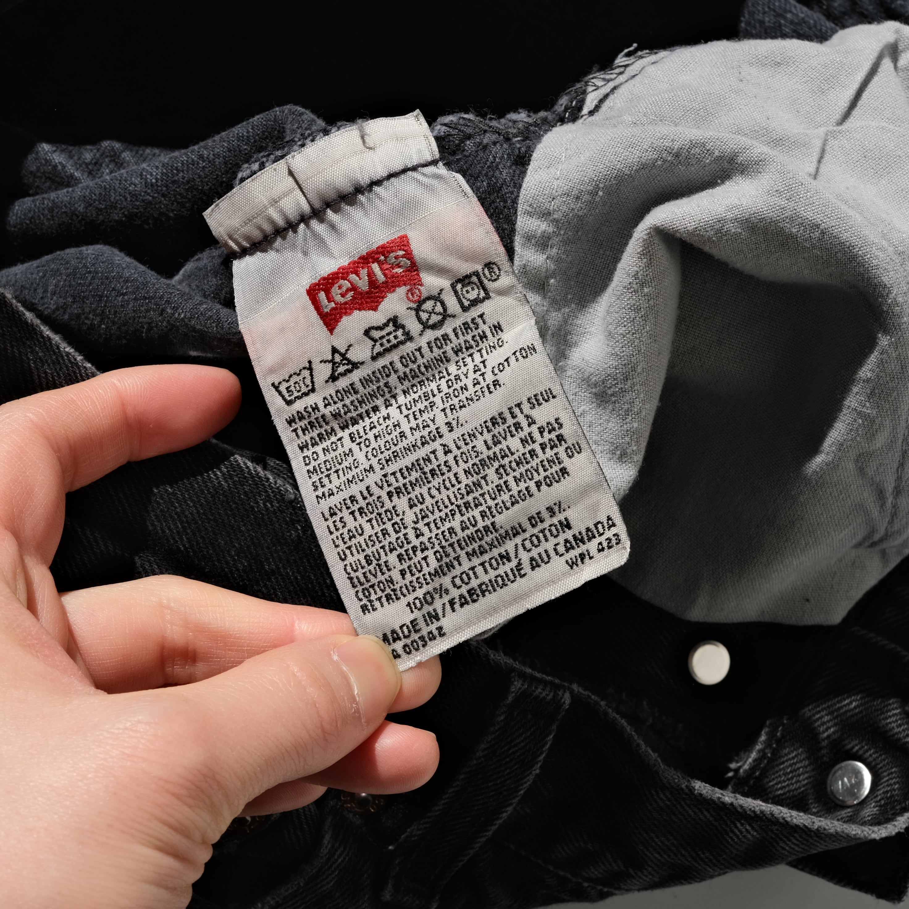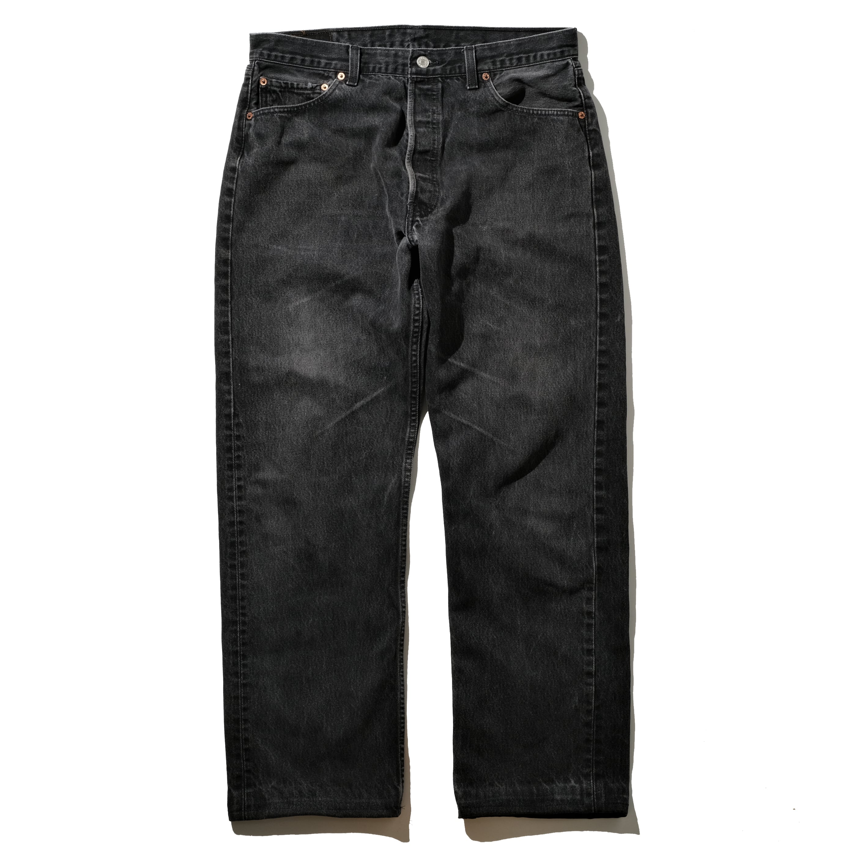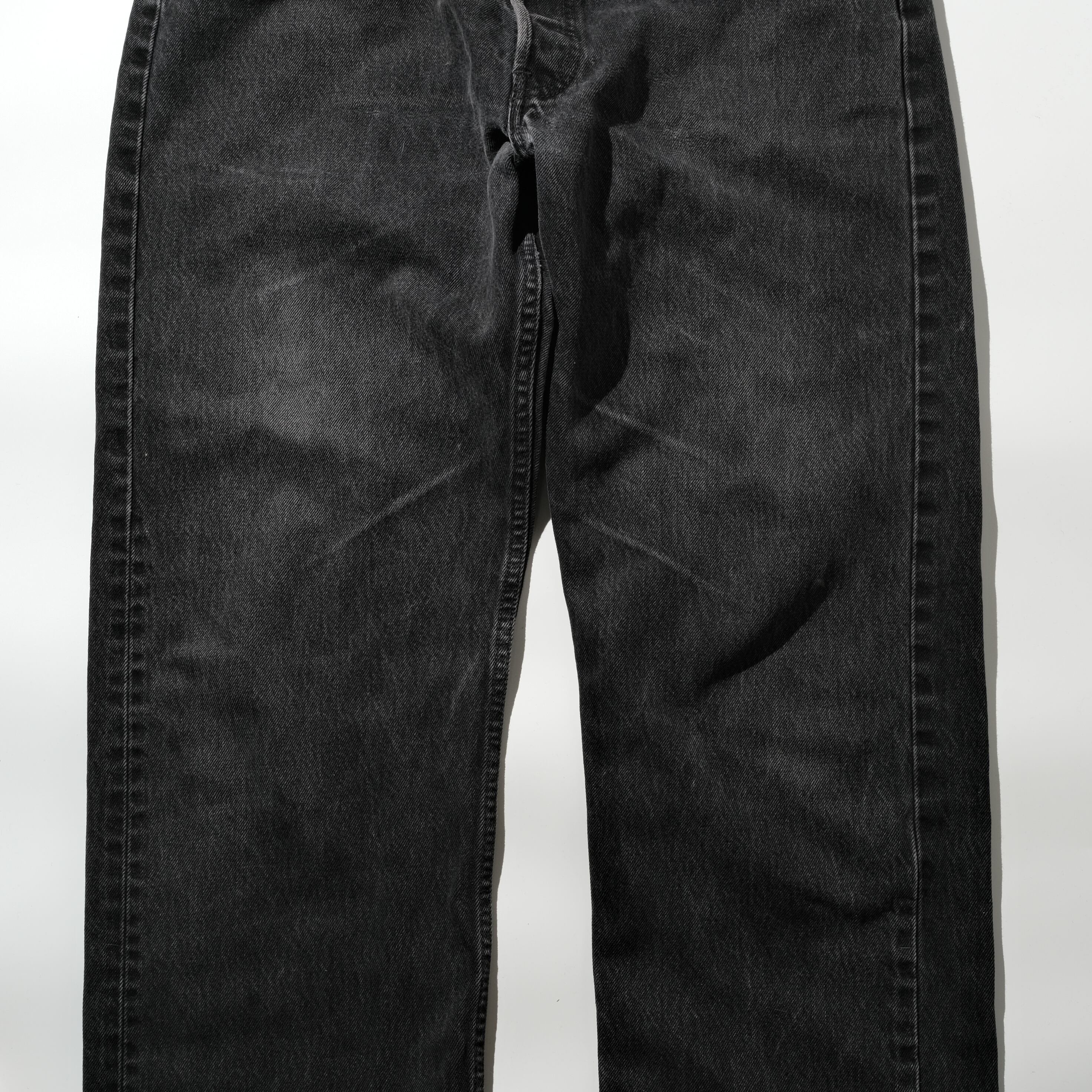 90年代、カナダ製の一本。USA企画のものにくらべヴィンテージデニムに近い凹凸のある生地感のカナダ製ですが、ブラック、そして501で見てみるとやはりそれを顕著に感じることができます。大きなダメージなどもなく、フェードの具合も良い個体ですが、裾部分に激しいダメージがあったため、そこをカットして裾上げを施しました。