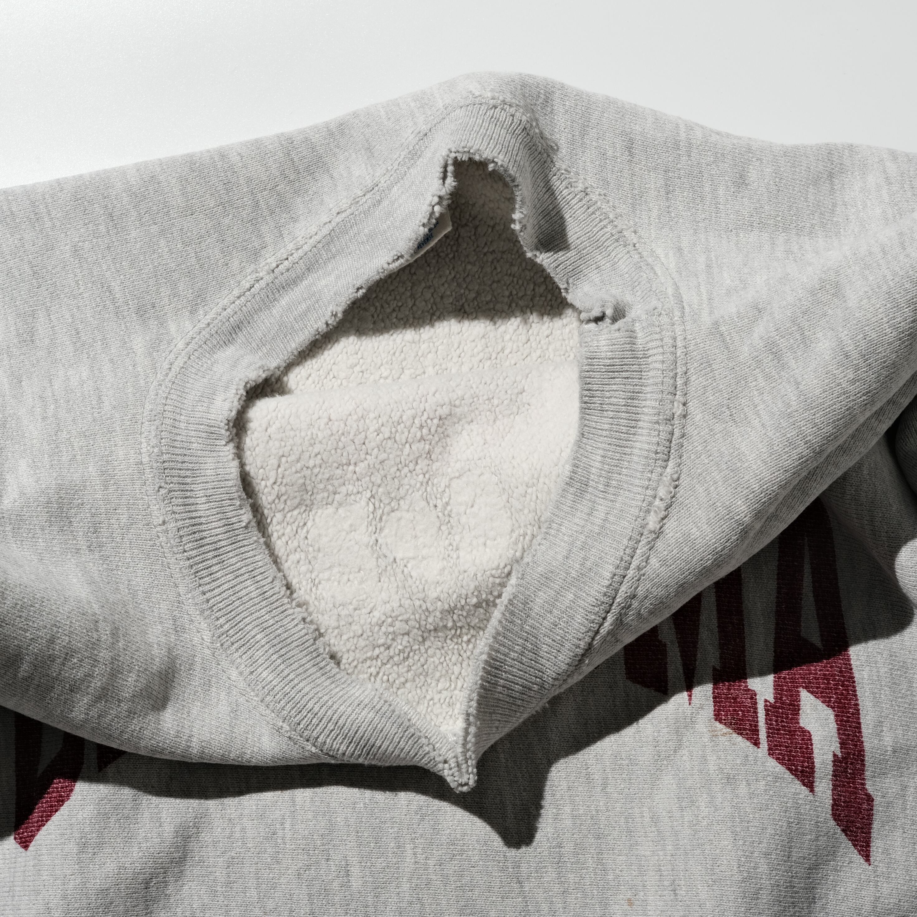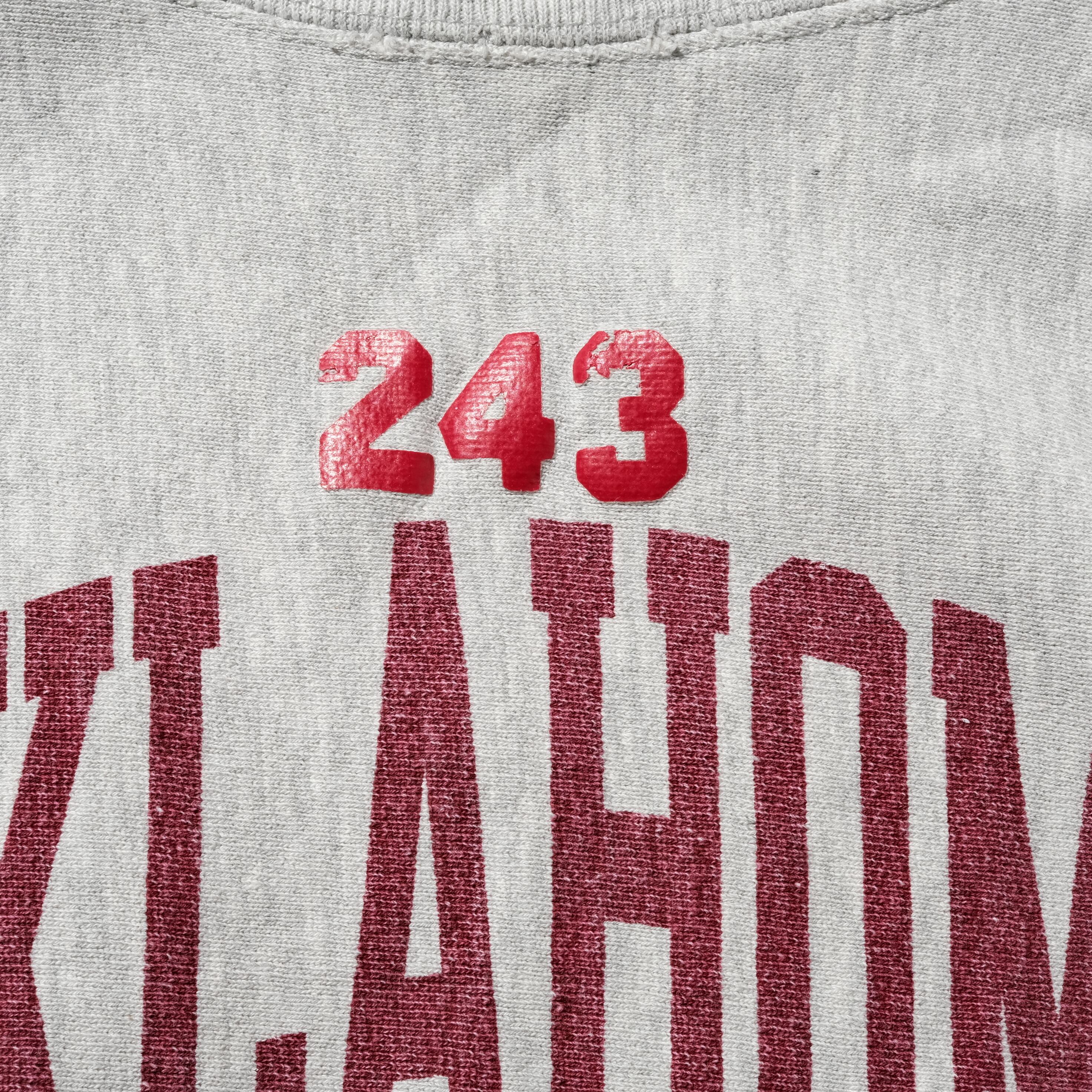 80'sのプリントタグのつくUSA製の一枚。全体的に入ったヨゴレ、ダメージがプリントの通りオクラホマ大のフットボール部でハードに着用されていたことを思わせます。