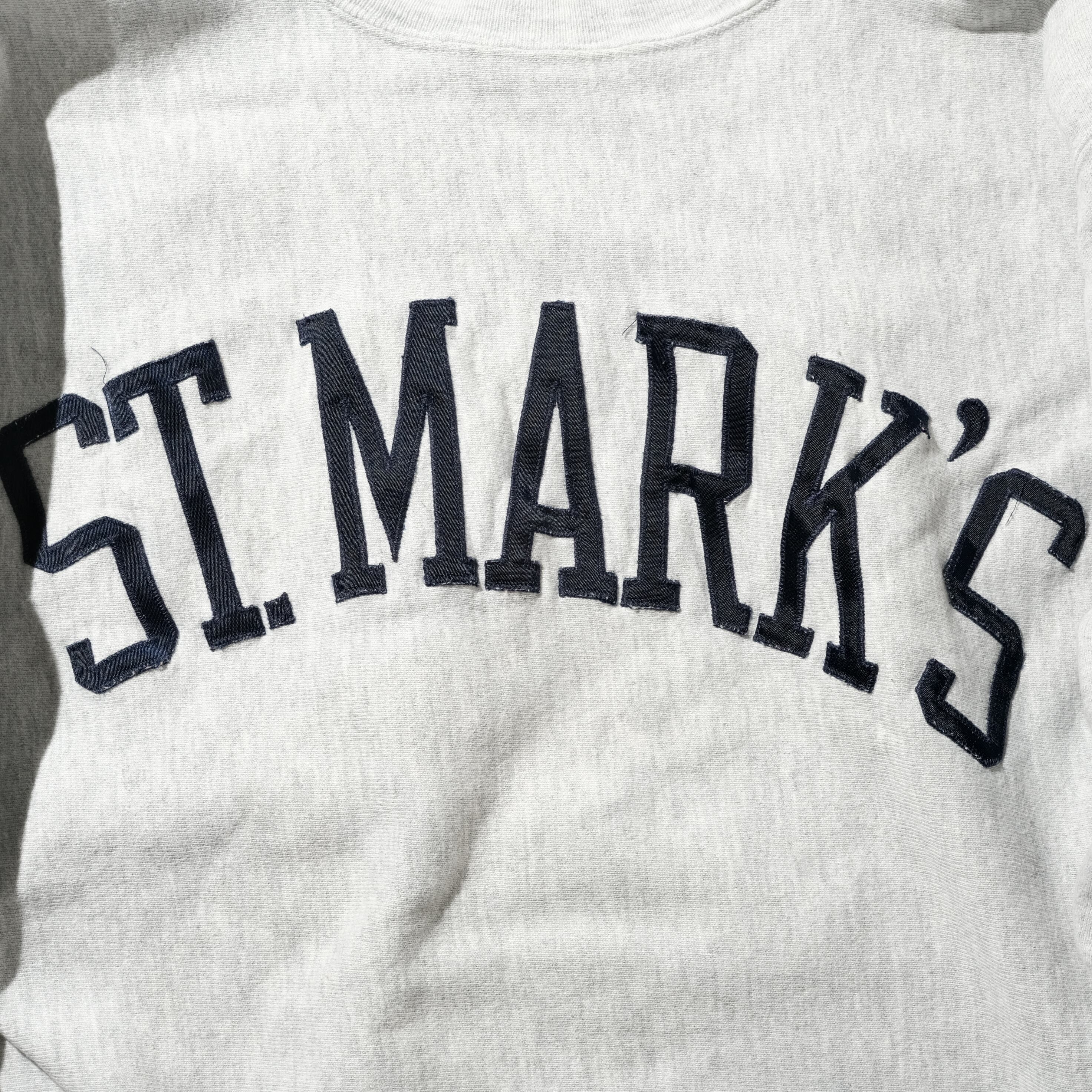 ST.MARKSとワッペンでアーチ状に入る良いデザイン。デニムのインディゴでしょうか、ブルーの色移りがある分サイズもL、リブにダメージがないもので刺繍タグとしては久しぶりに税抜の価格が10000円以下で出せたかと思います。