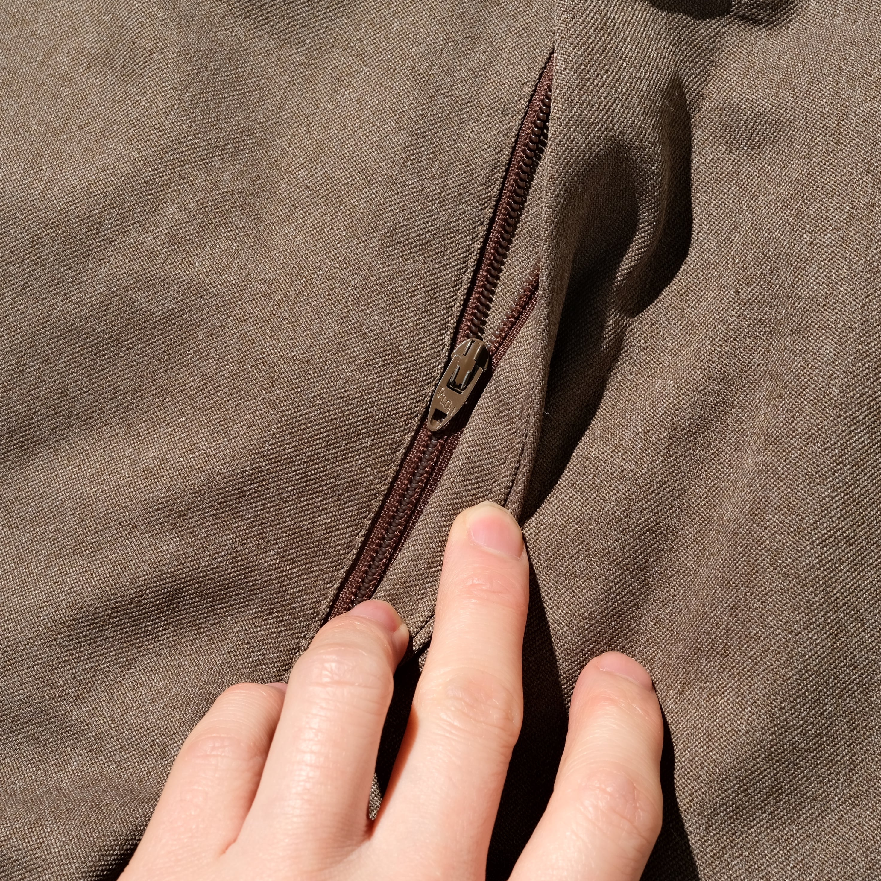 こちらのアイテムやスタプレなどはフレアシルエットのものも多い中、こちらはストレートなシルエット。カラーも定番のブラウンで合わせやすそうです。