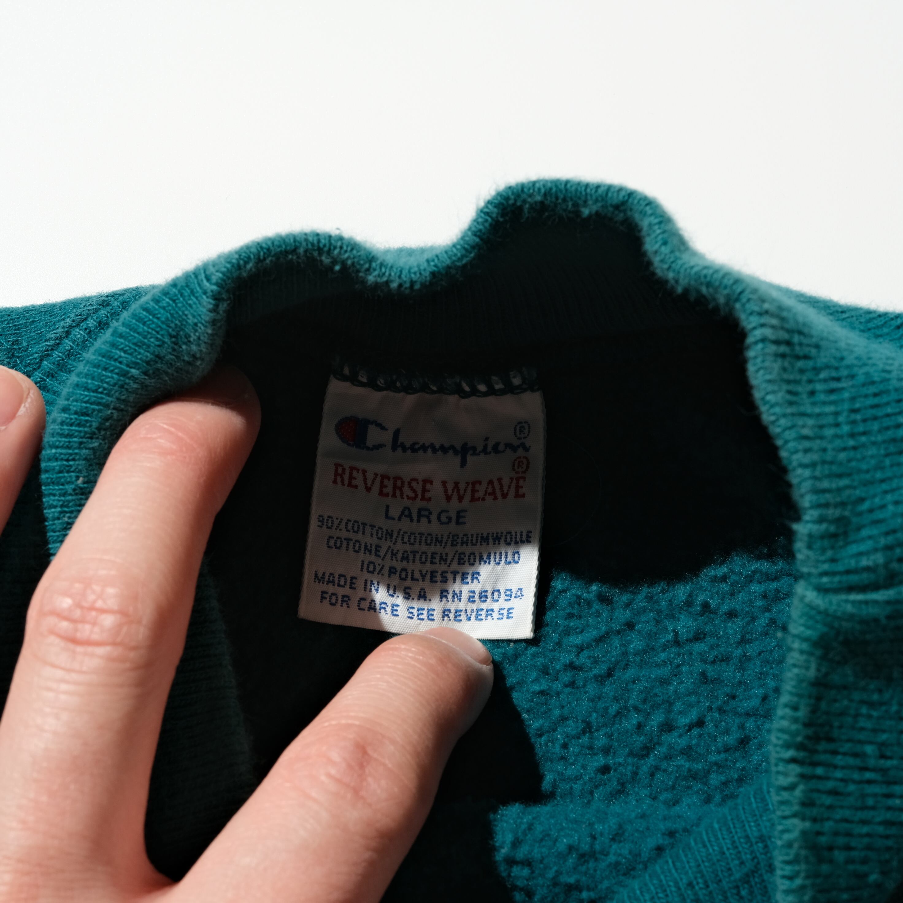 チャンピオンリバースウィーブの中でも数の少ない、ミドルネックの個体。このタイプはラグランスリーブ、脇下にリブ、そしてサイドにポケットのつくディテール。ミドルネックのものは基本的には目ありのタイプを多く見かけますが、こちらはUMASS DARTMOUTHのいいデザインのワッペン/プリントのタイプ。カラーもレアカラーのシーグリーンです。