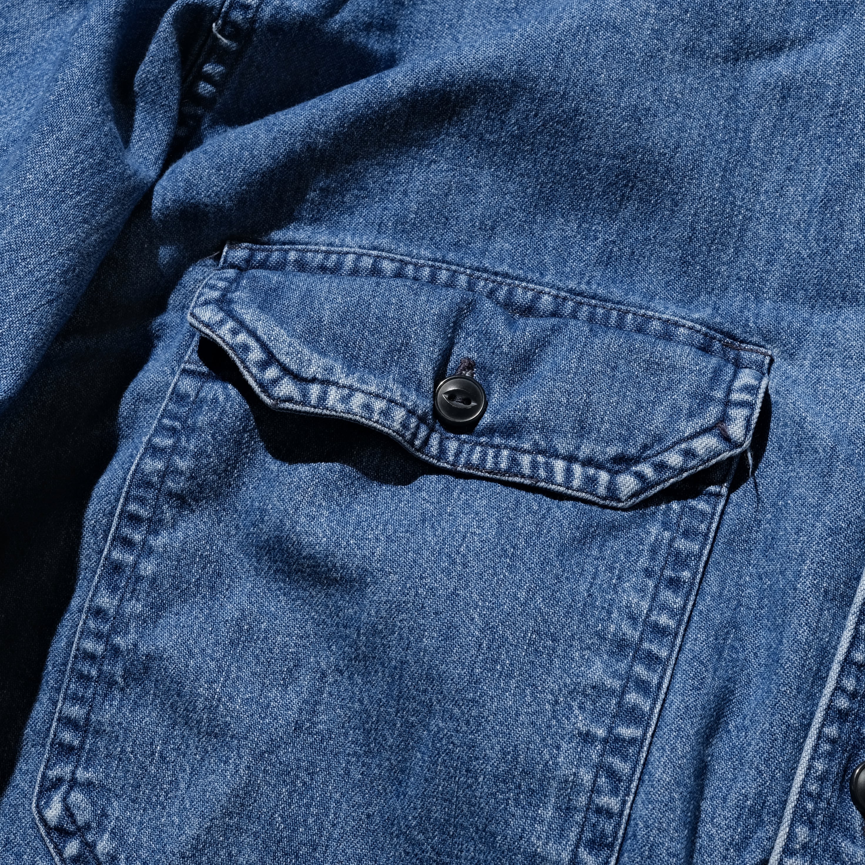 90'sごろのタグのつく、オールドの年代の一枚。フラップ付きのポケットや猫目のタイプのボタンなど、ワーク感のあるデザインが魅力的です。