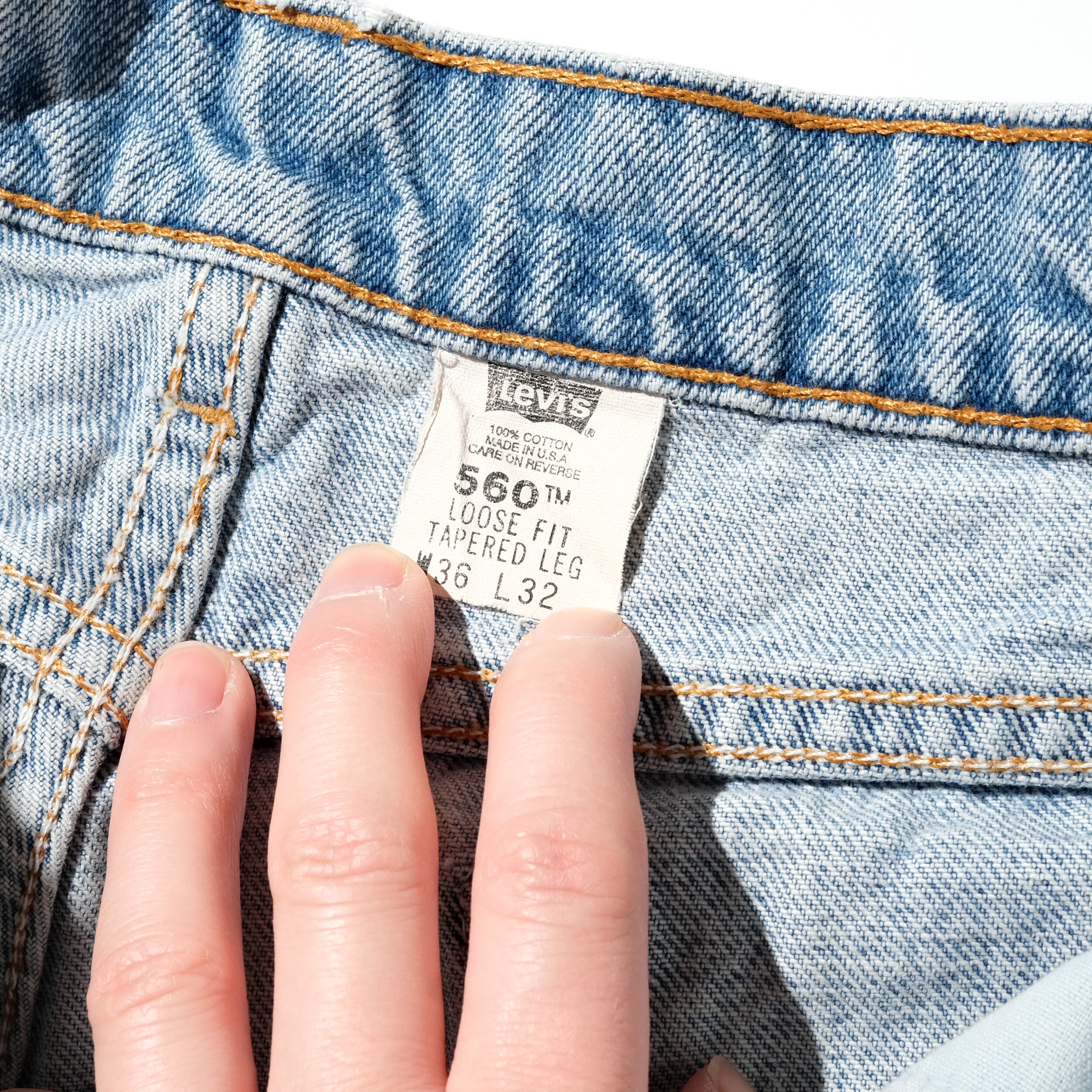 すそ幅19cm、ワタリは実寸で36cmと急激なテーパードが特徴的な560品番。ボリュームのあるスニーカーなどとの合わせも気分ですね。