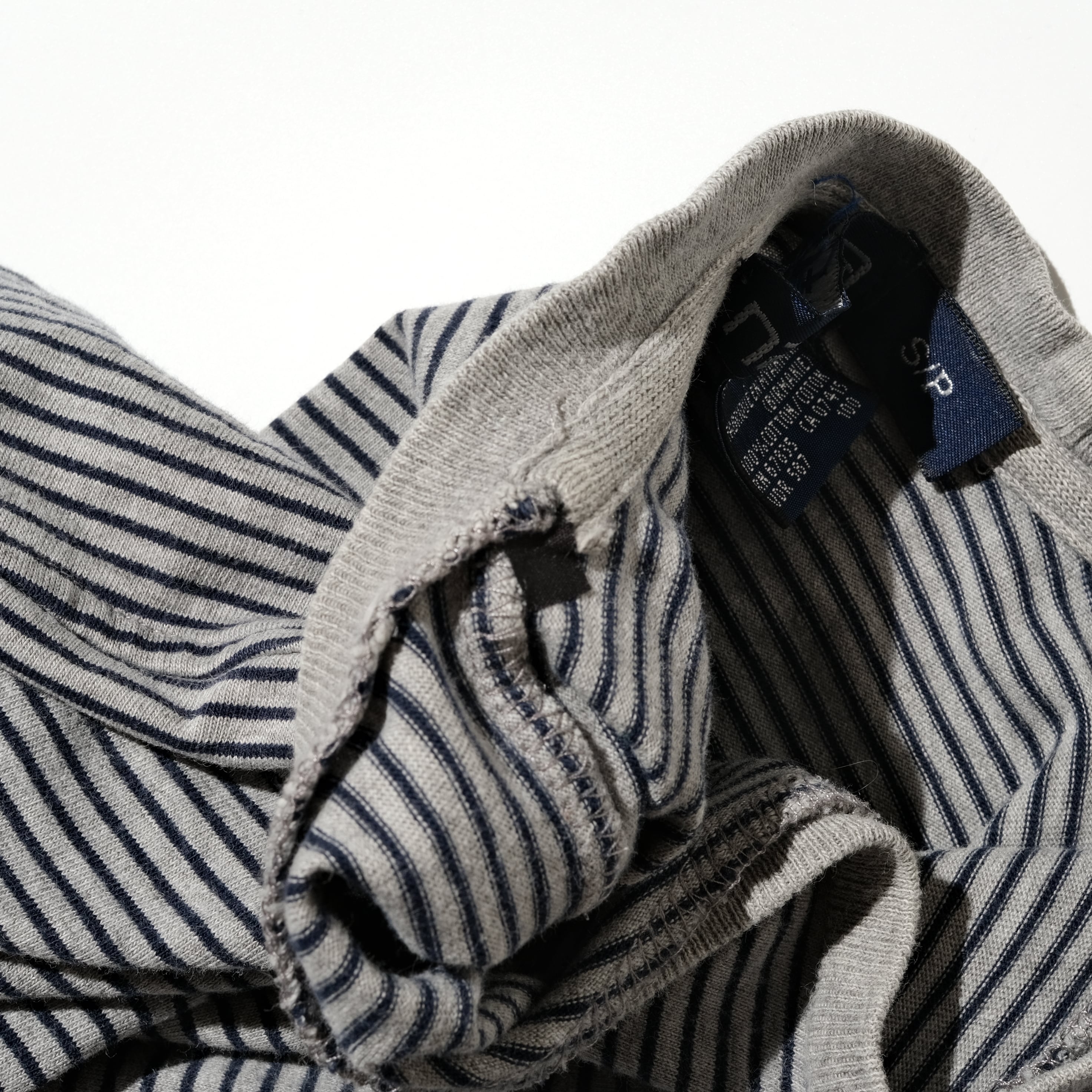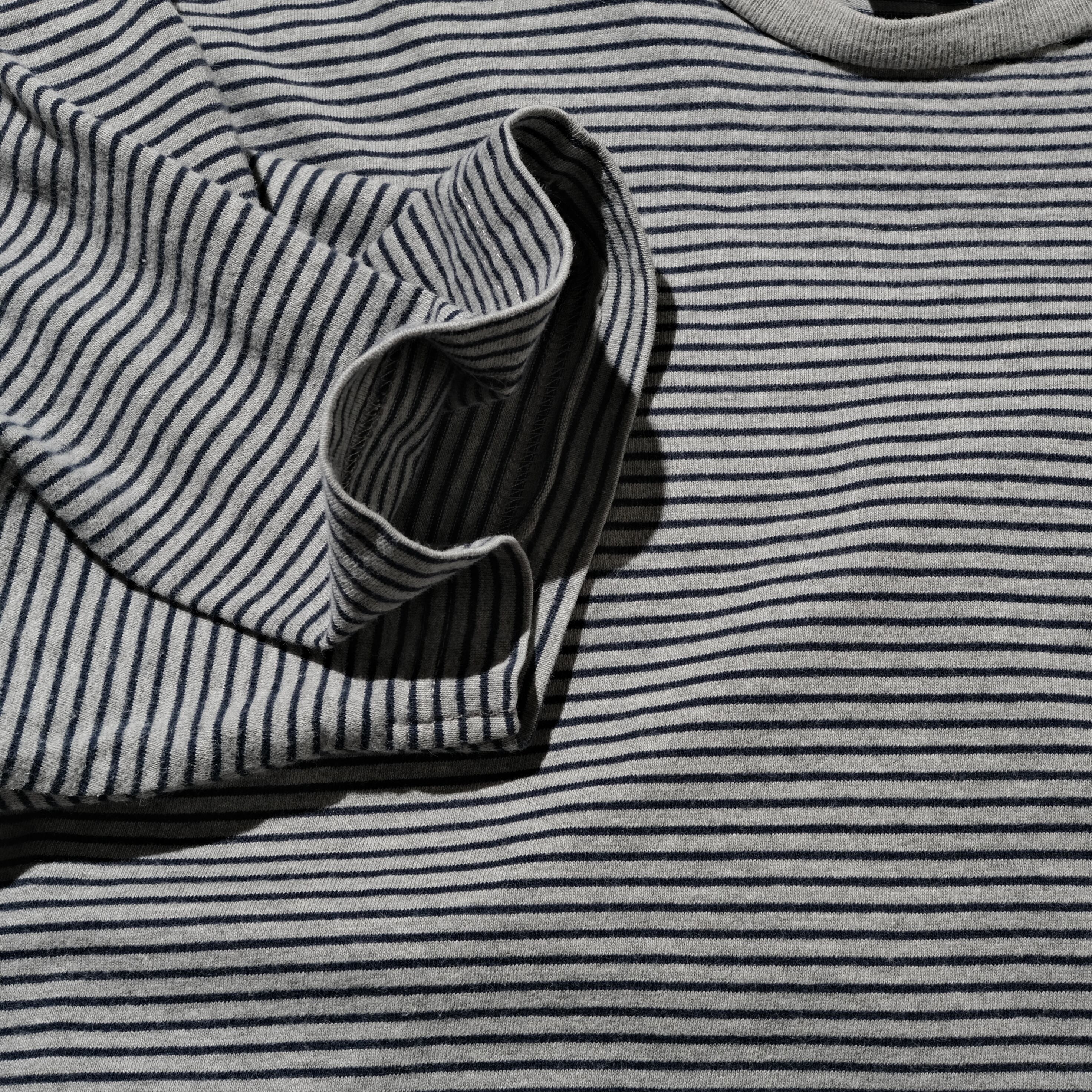 左胸ブランドロゴの刺繍の入る一枚。細めのピッチのボーダーでグレー/ブラックと良い配色です。