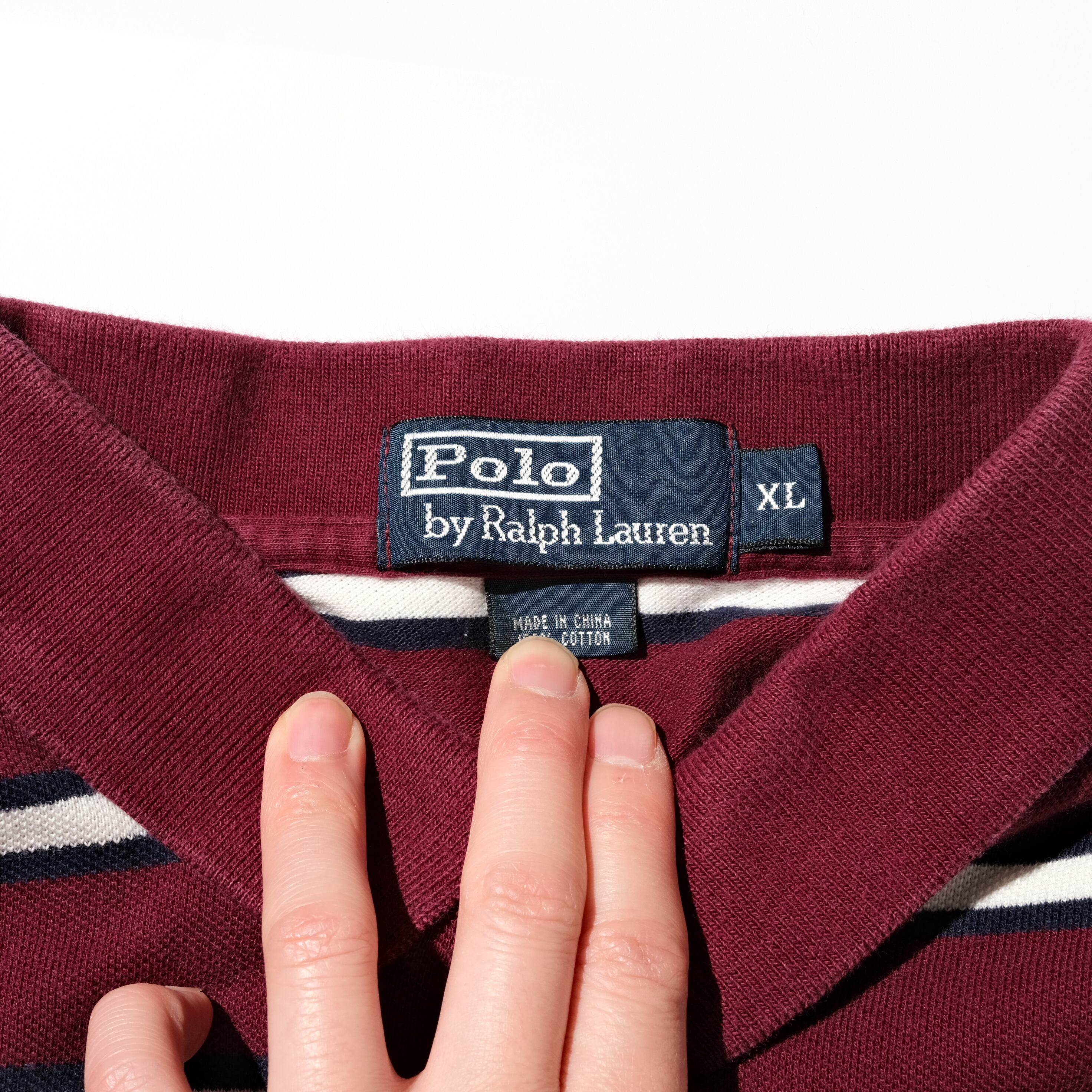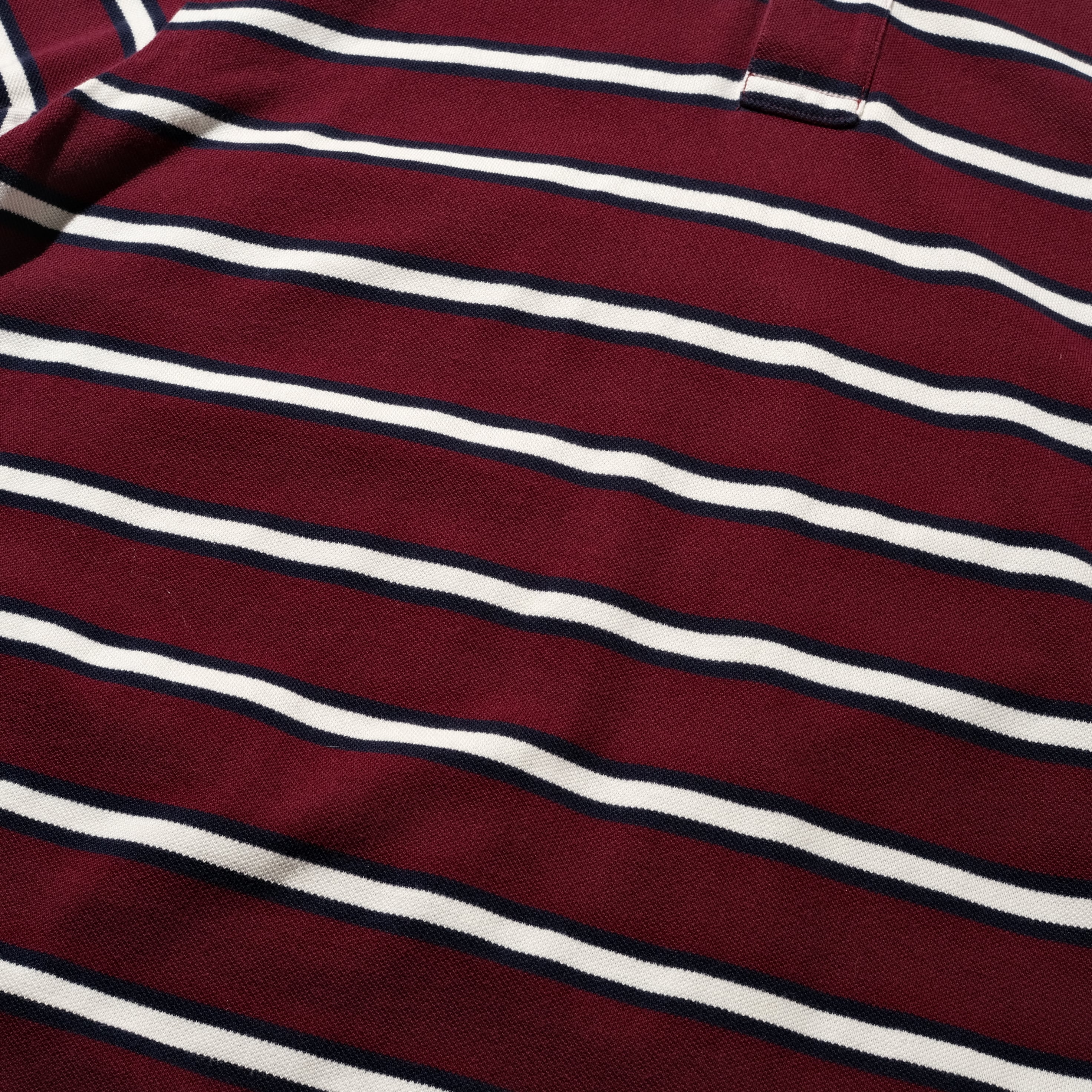 こちらはバーガンディベースの上品な配色が魅力的な一枚。通常古着で出てくるポロは少なからずスリット部分にキズのあるものも多いですがこちらはノーダメージでコンディションの良いと言える個体。