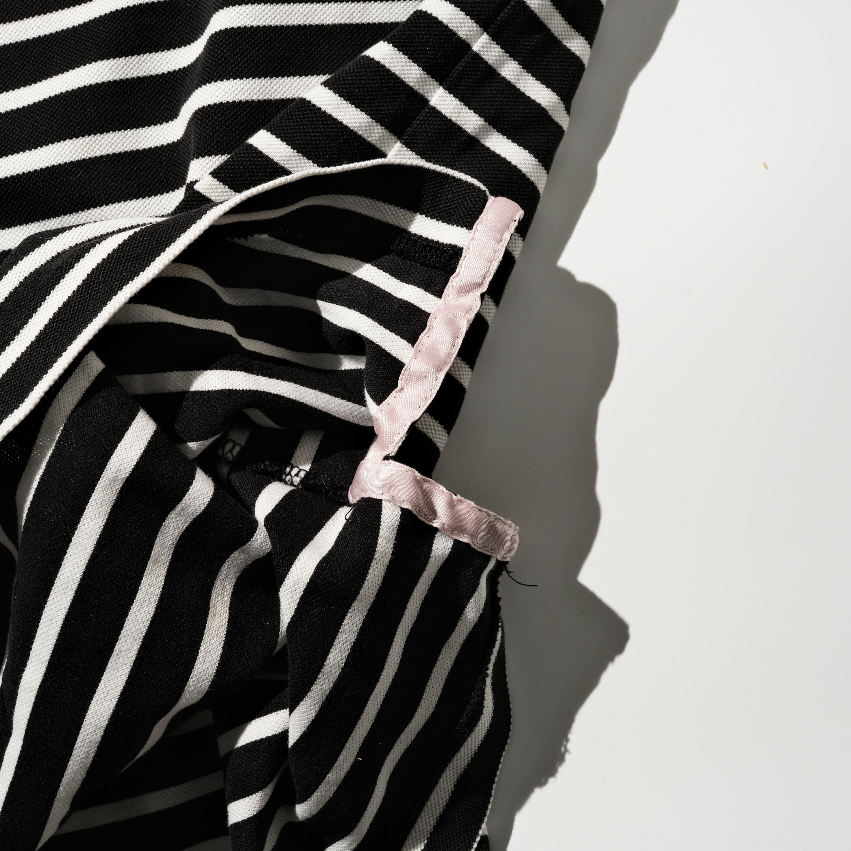 ブラック/ホワイトの気の利いたボーダー柄。通常のものより目の細かい鹿の子素材が使用されています。またボタンもスナップの仕様で首元に出てきませんので綺麗なコーディネートにまとめたい方にはおすすめです。