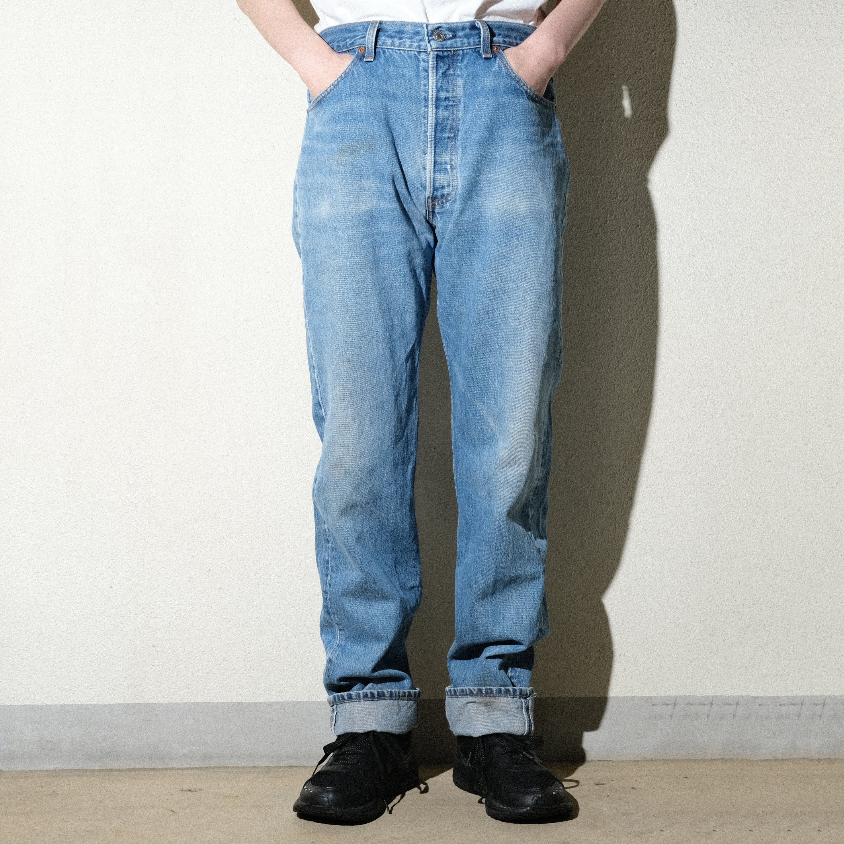 34×34の表記サイズからややチヂミが入ったサイズ感、レングスがすこし長めですのでその分抑えたプライスに設定いたしました。ツラは良い個体かと思いますので501でお探しだった方にはおすすめです。
