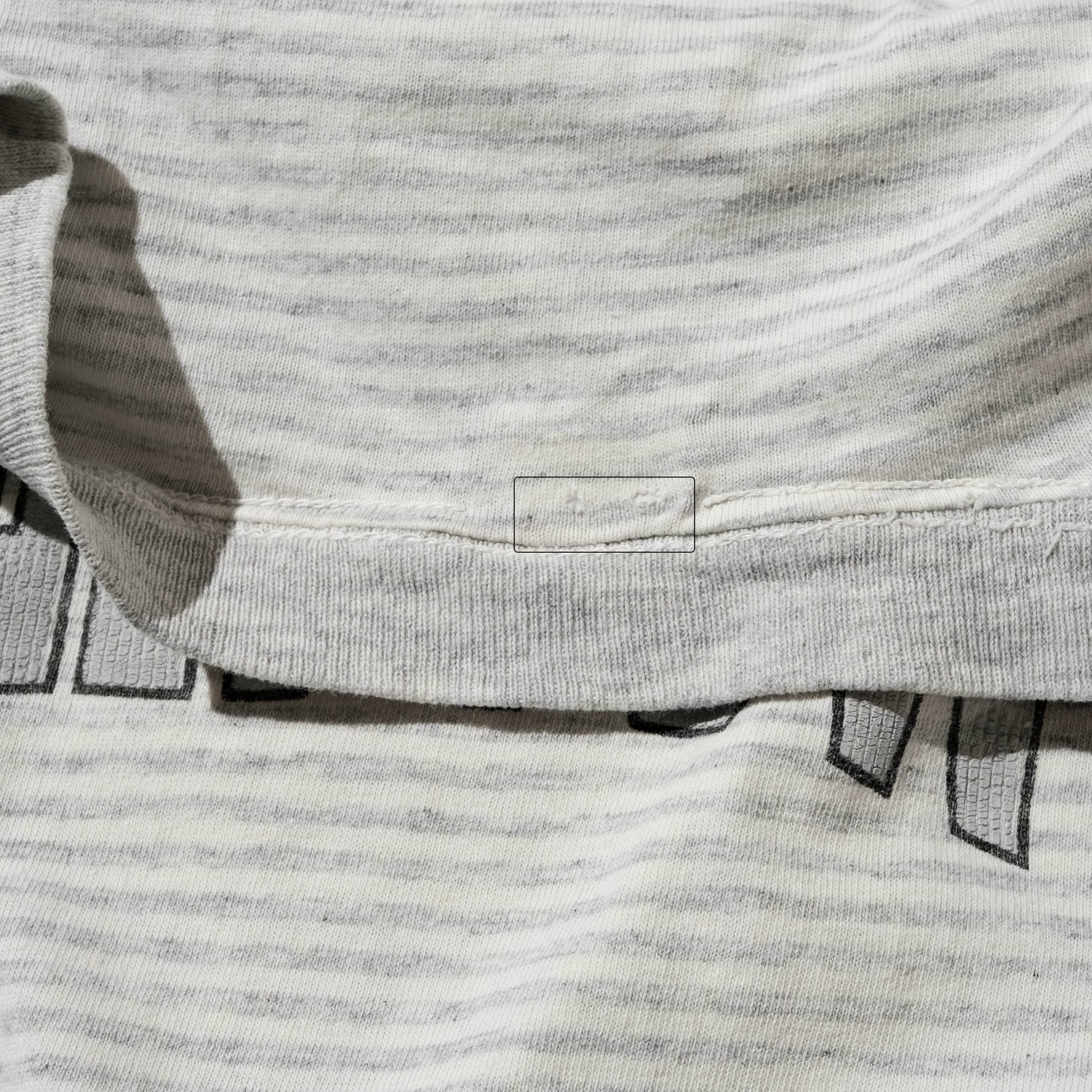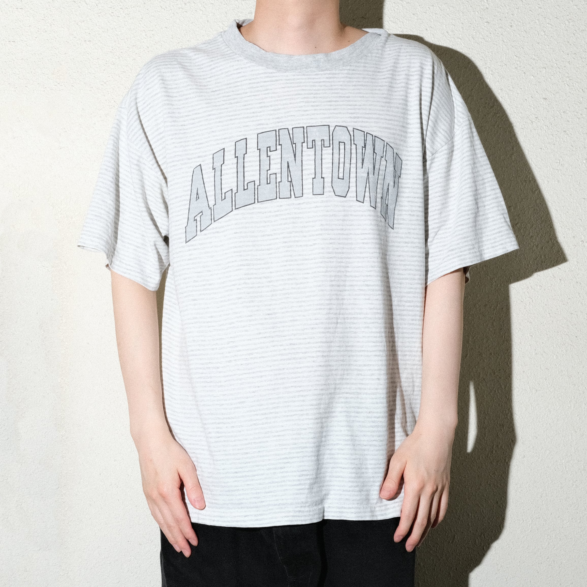 グレー/ホワイトの柔らかな雰囲気のボーダー柄の一枚。胸元にはペンシルバニアの町の名前がアーチ状に入るデザインが魅力的です。タグが欠損しておりますので詳細不明ではありますが、縫製がシングルステッチであることからおそらく90'sごろのものになるのではないかと思います。