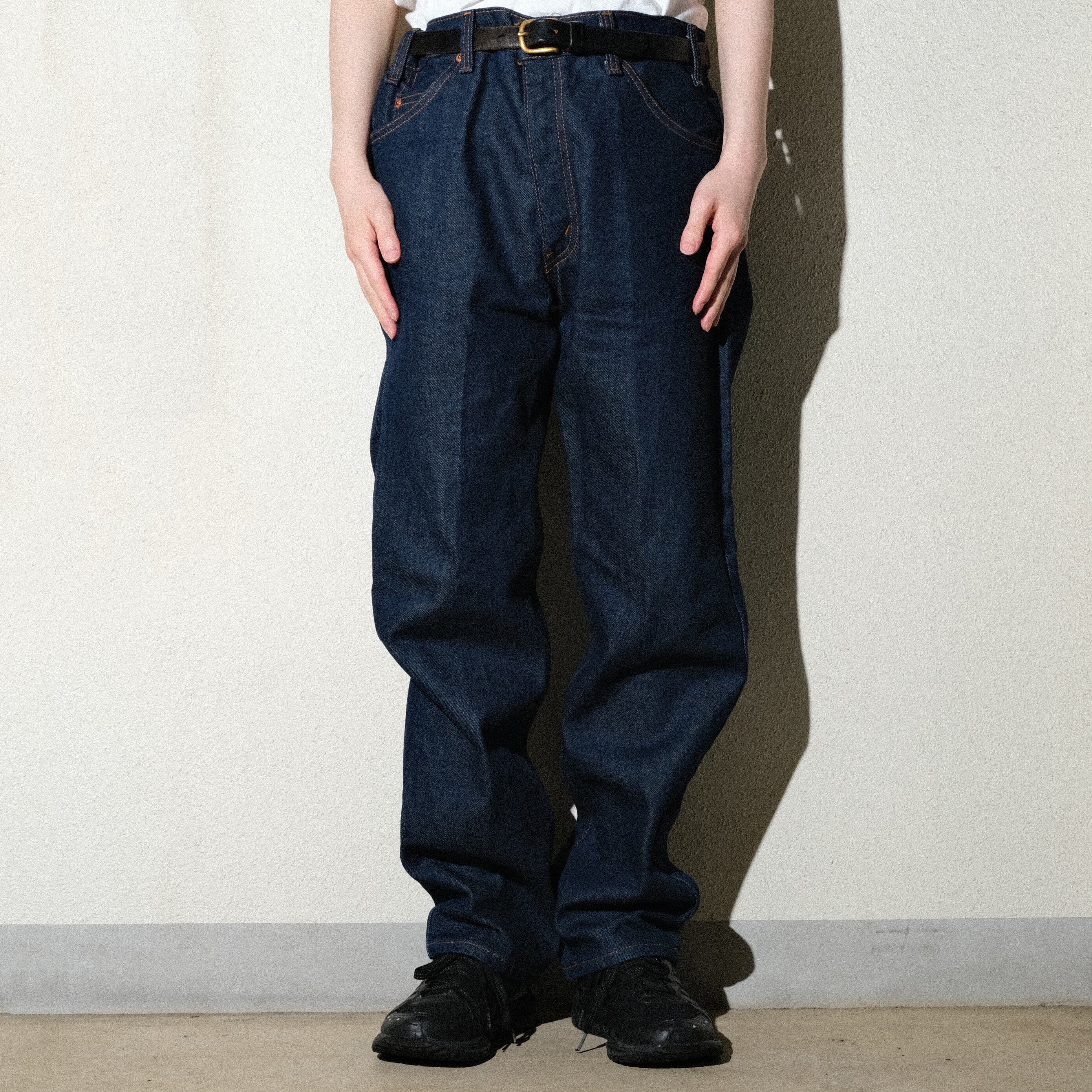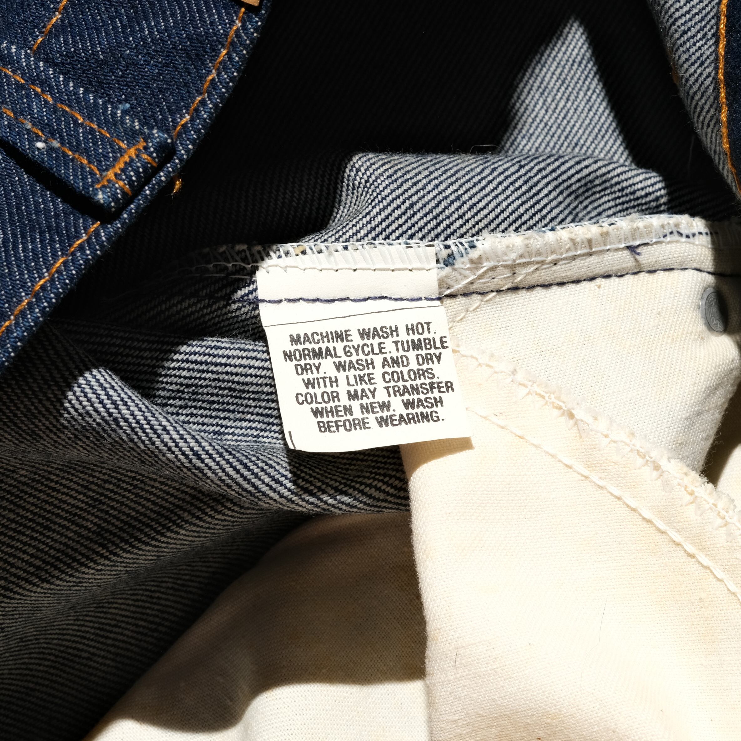 この年代のものですとワンウォッシュされて販売されていたものとノンウォッシュで販売されていたものがございますが、こちらは前者にあたる個体。お客様の方で一度洗いをかけていただきますと少しチヂミも出て表記程度のサイズになるかと思います。