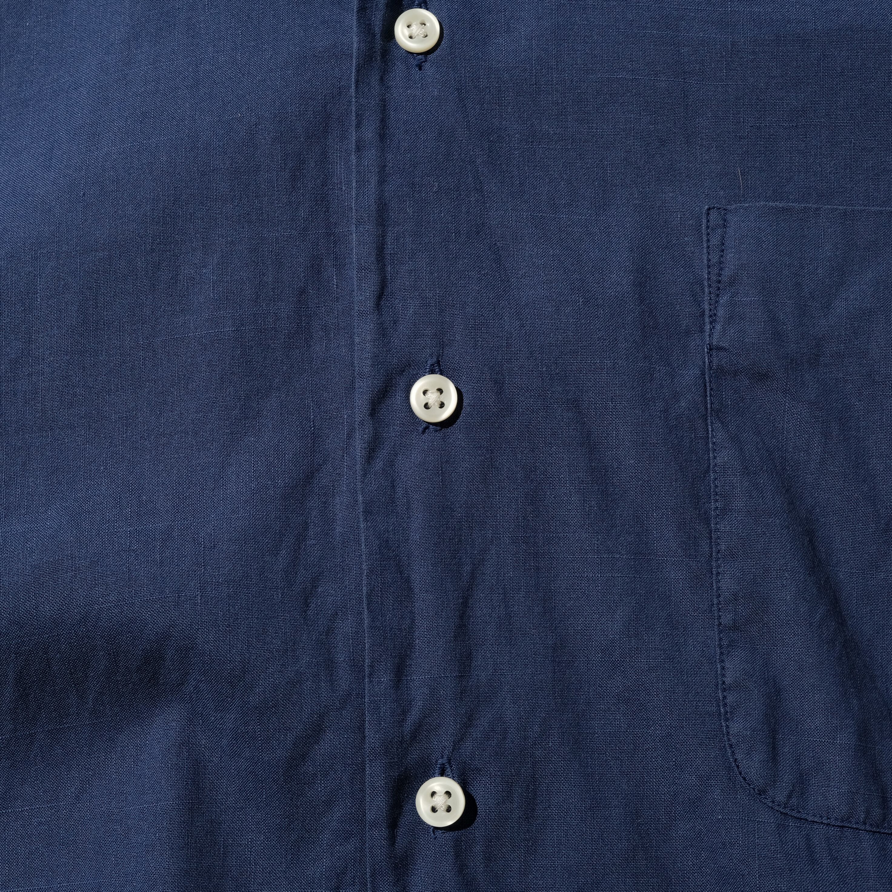 こちらは落ち着いたネイビーのカラーが印象的な一枚。重くなりすぎないカラーとリネンコットンの生地感、一枚あれば合わせやすく重宝していただけるアイテムです。