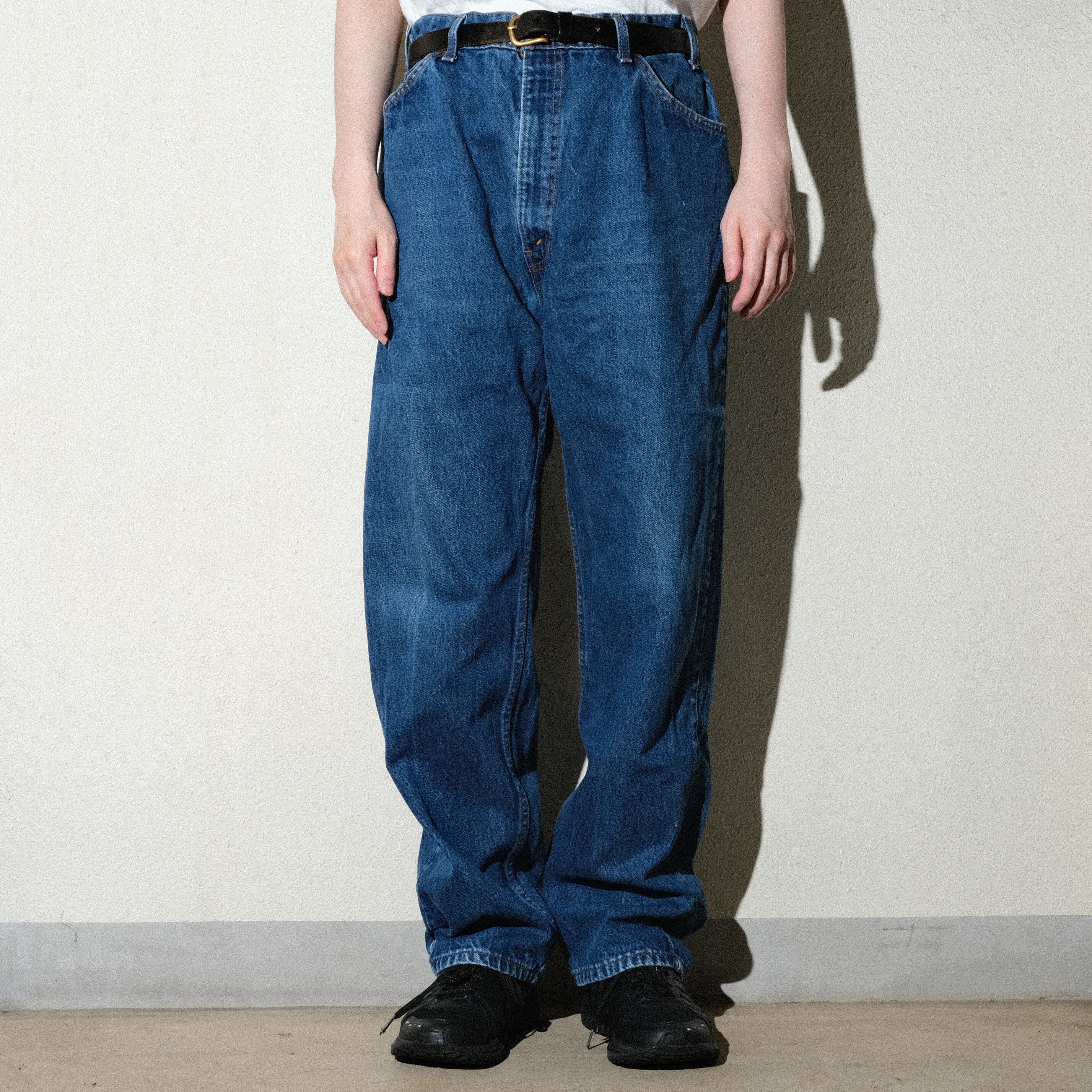 表記でW40のサイズからチヂミが入りW38となった個体、元々が細身のシルエットですのでベルトで絞って着用されると今気分な感じかと思います。