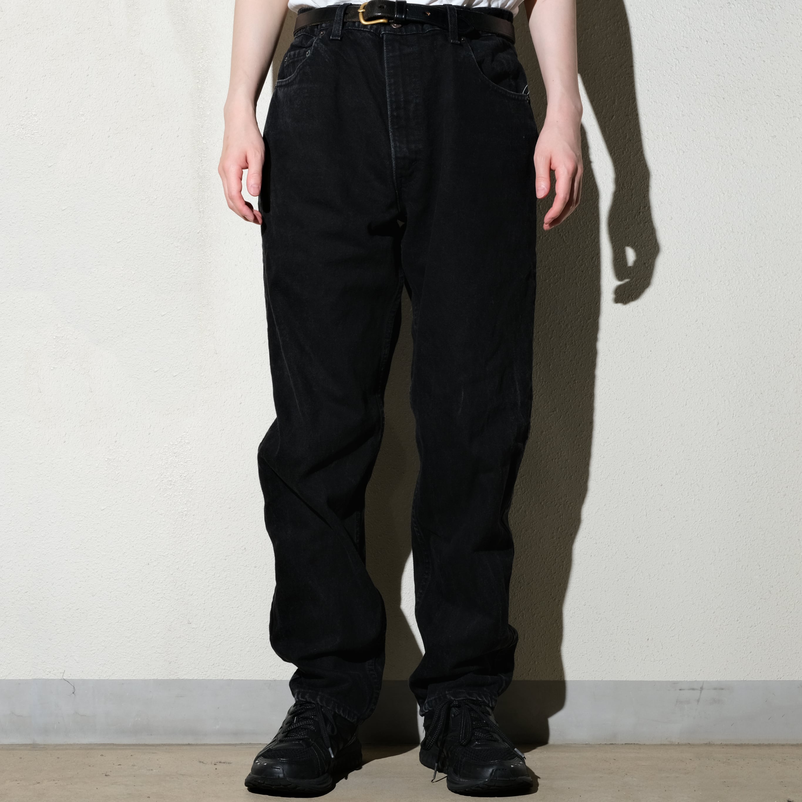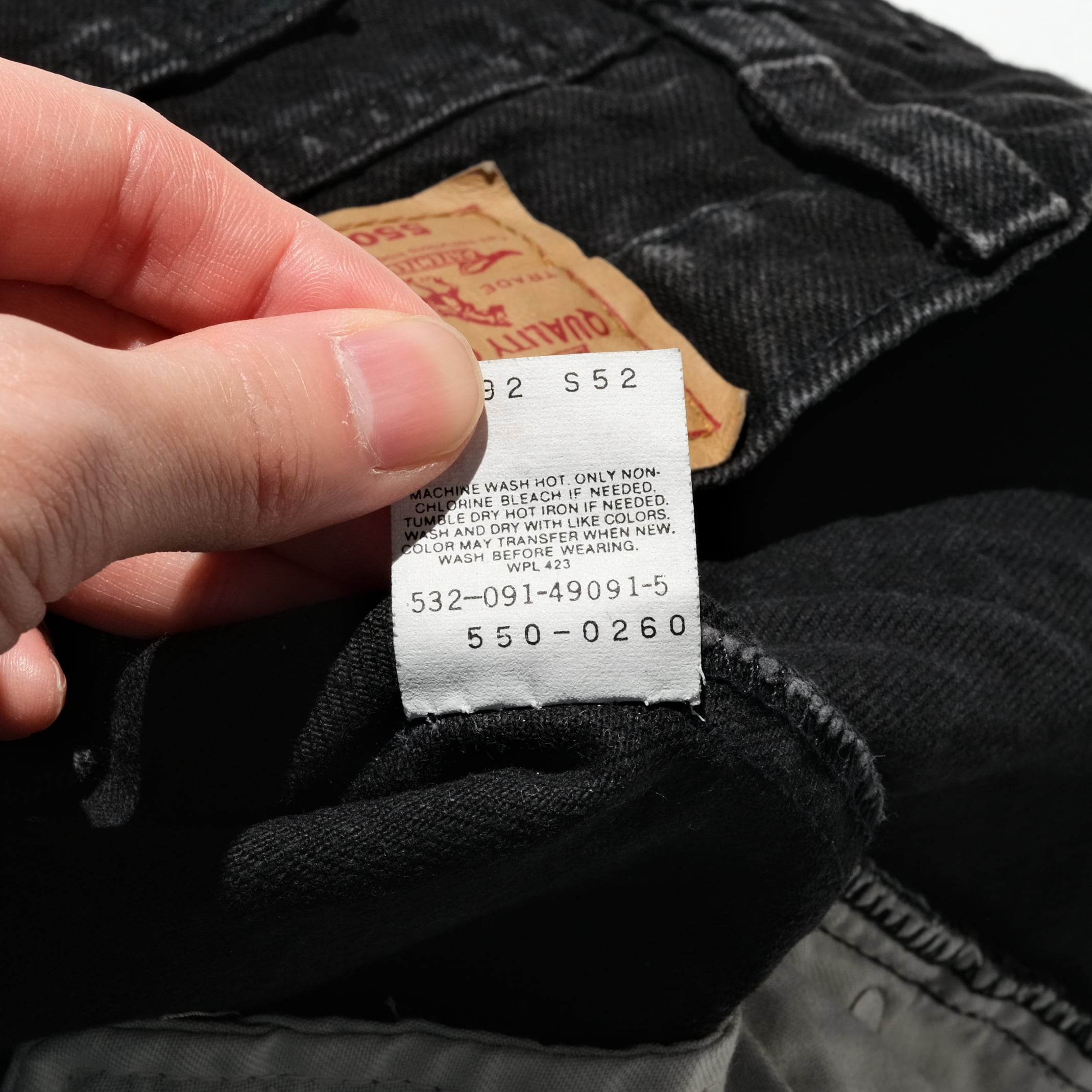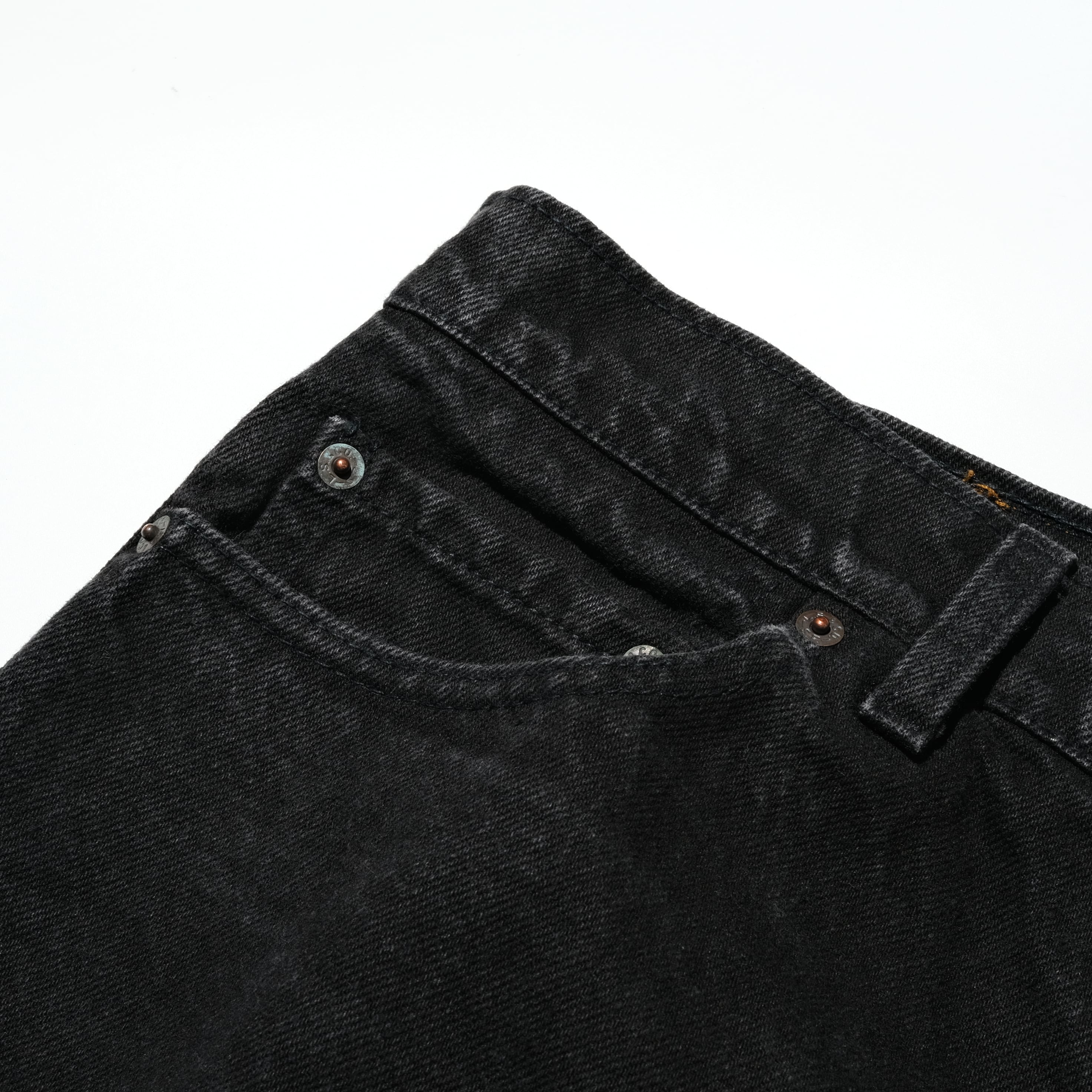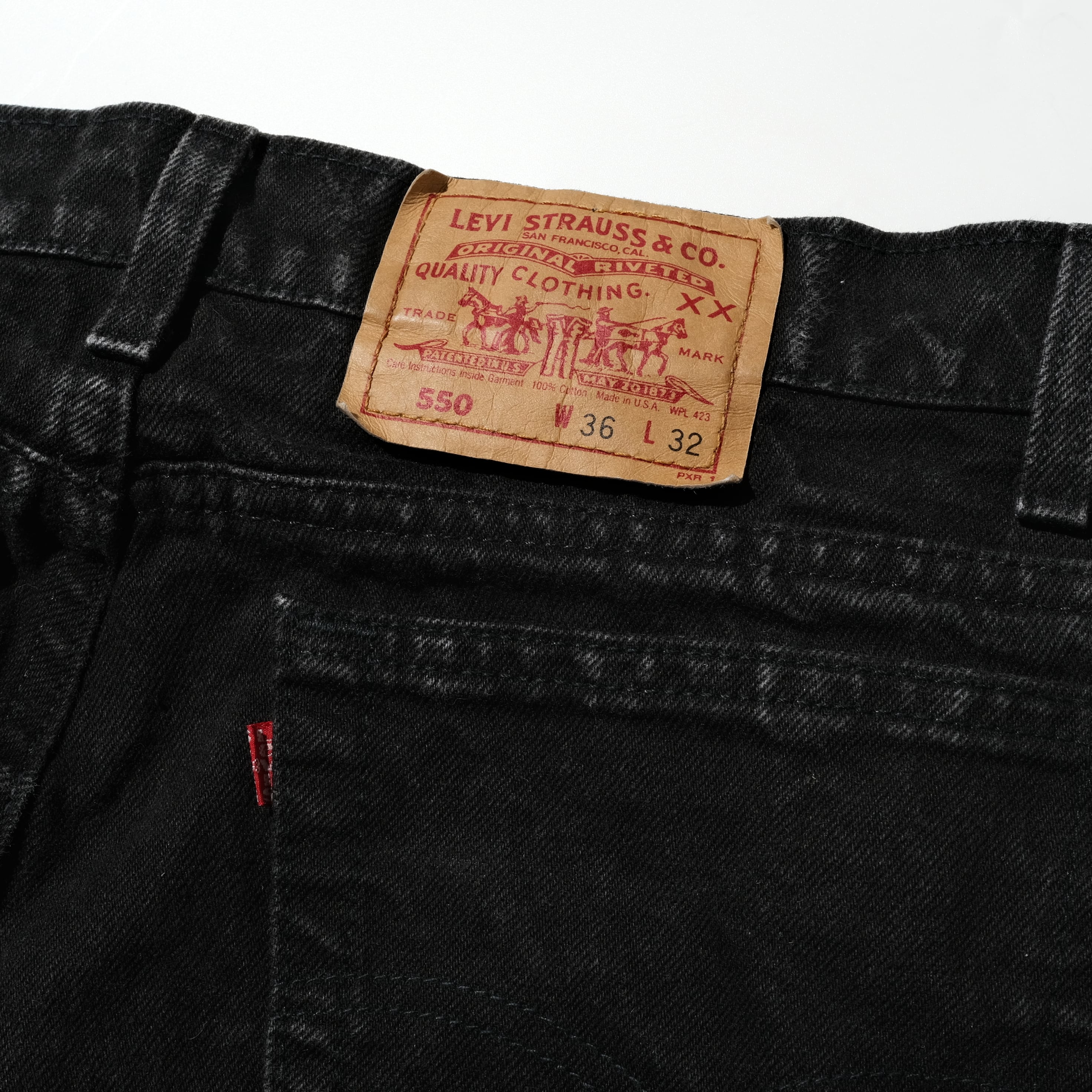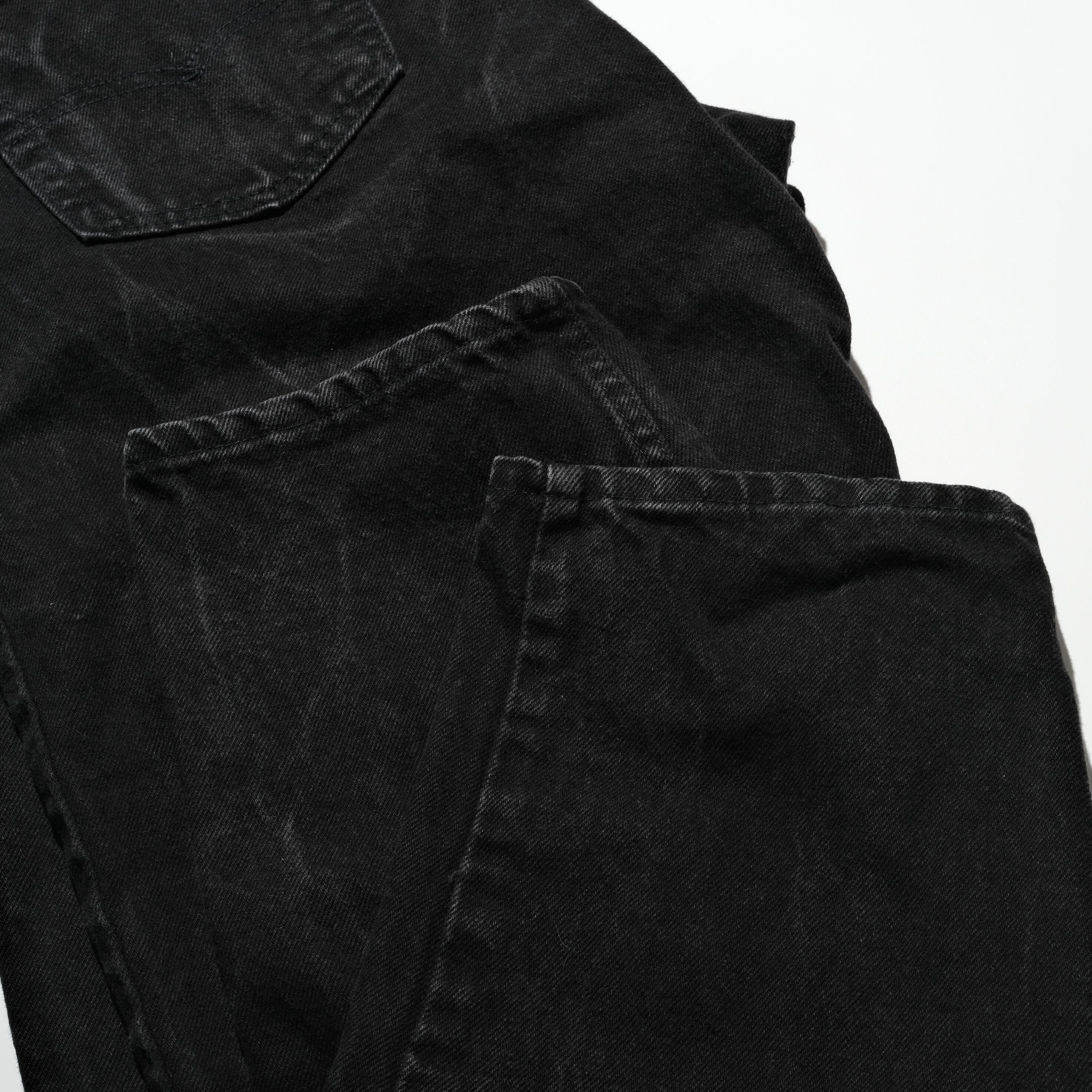 91年、USA製の個体。オレンジタブになる前の個体ですので550ブラックとしては初期の個体になります。この後の年代のものと比べるとしっかりとテーパードしたシルエットに、リベット裏もアルミですしトップボタンもブラスであったりと違ったディテールが魅力的です。