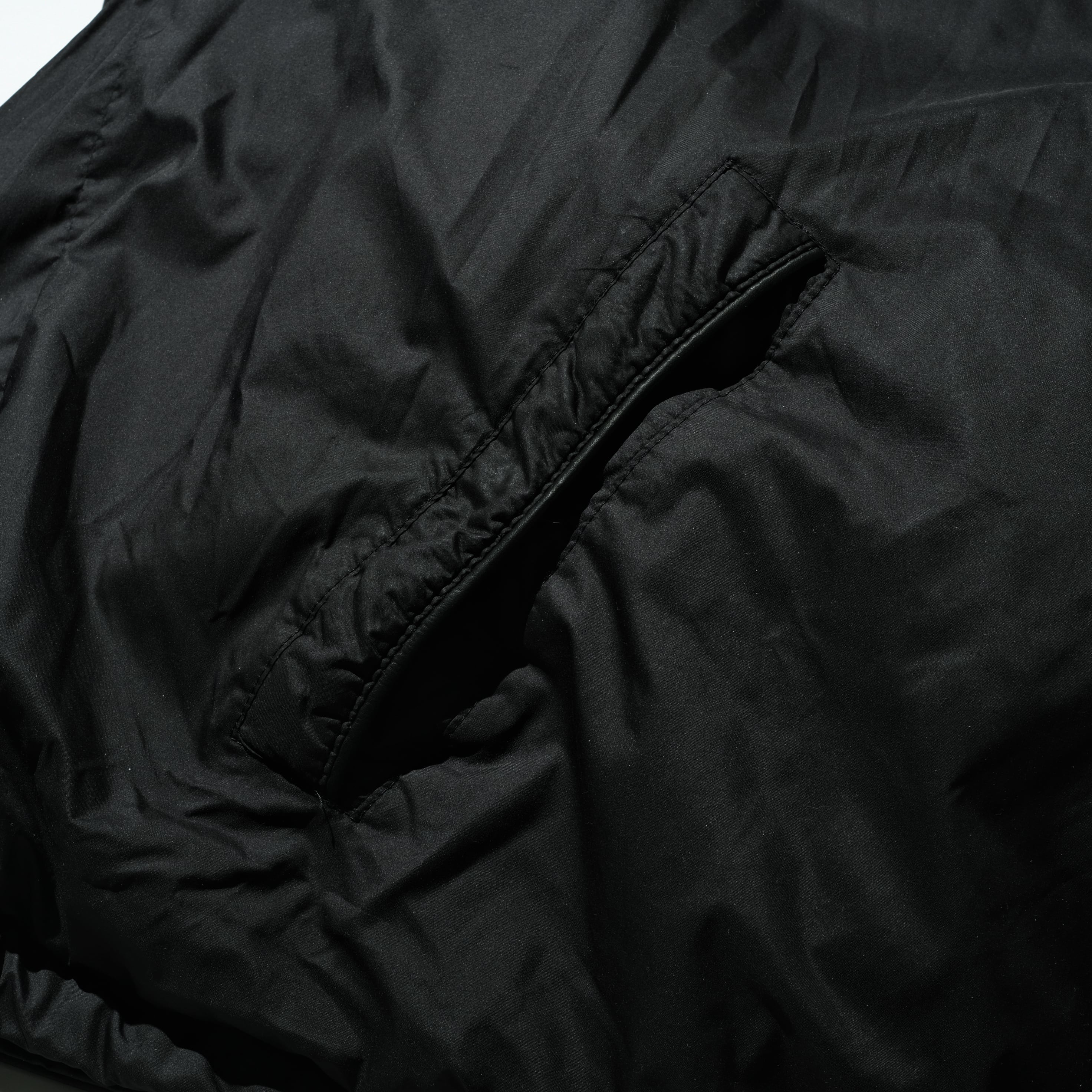 襟部分にフードを収納可能、そしてポケットやフード部分のジップにレザーが使用された高級感の漂う一枚です。