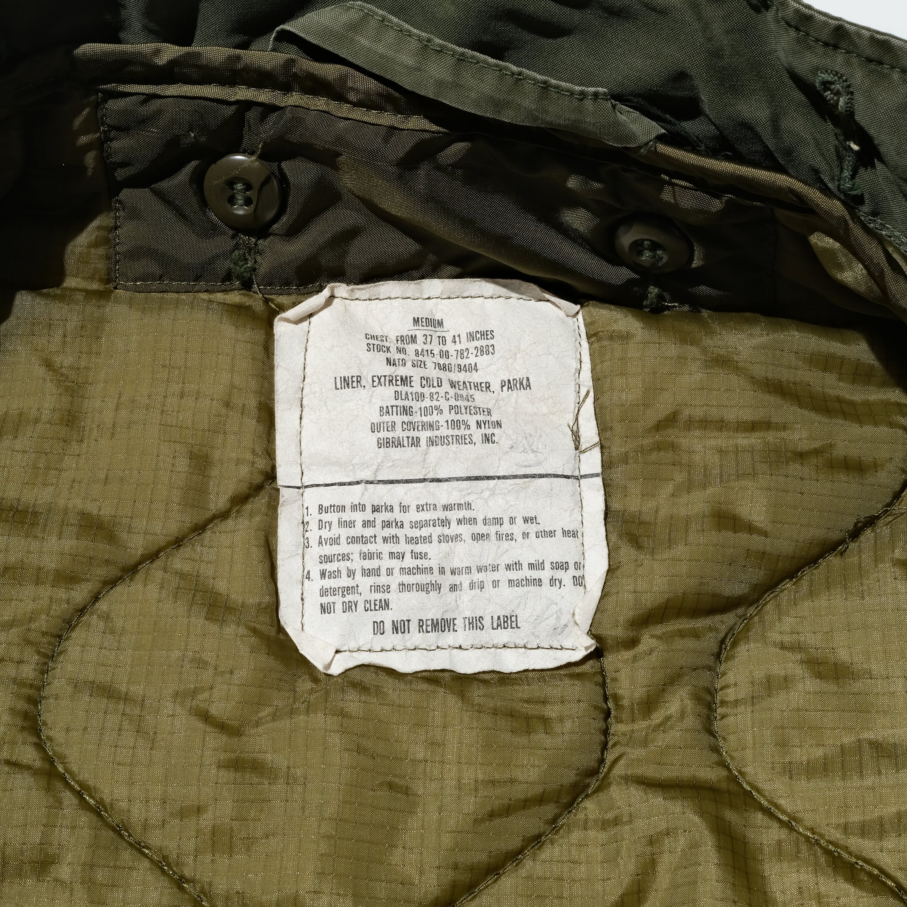 中でも筆頭格と言えるのがこちらのアイテム、M-65フィッシュテイルパーカー。買い付けた時からライナーは会計年度の違うものが装着されており、シェルは74年、ライナーは82年のものとなります。
