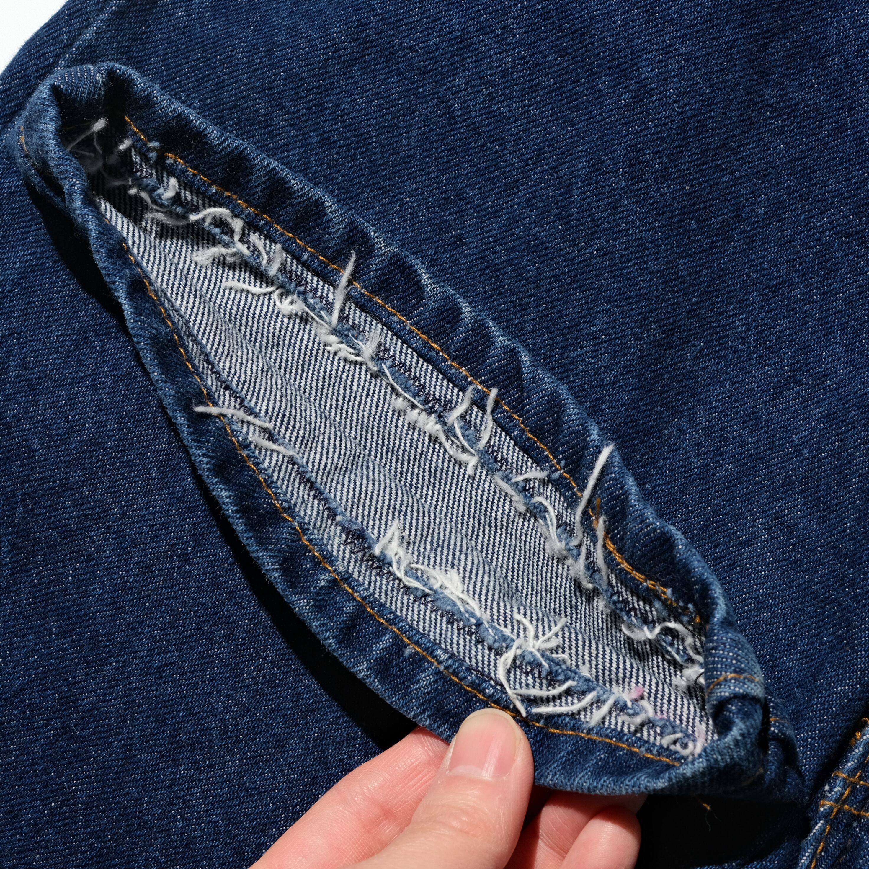 なおかつこの濃紺コンディション、素晴らしい個体です。38×31の表記サイズ、裾直しが入っておりますがもとの裾のアタリを活かす形で丁寧に上げられており、前所有者のこだわりが感じられます。