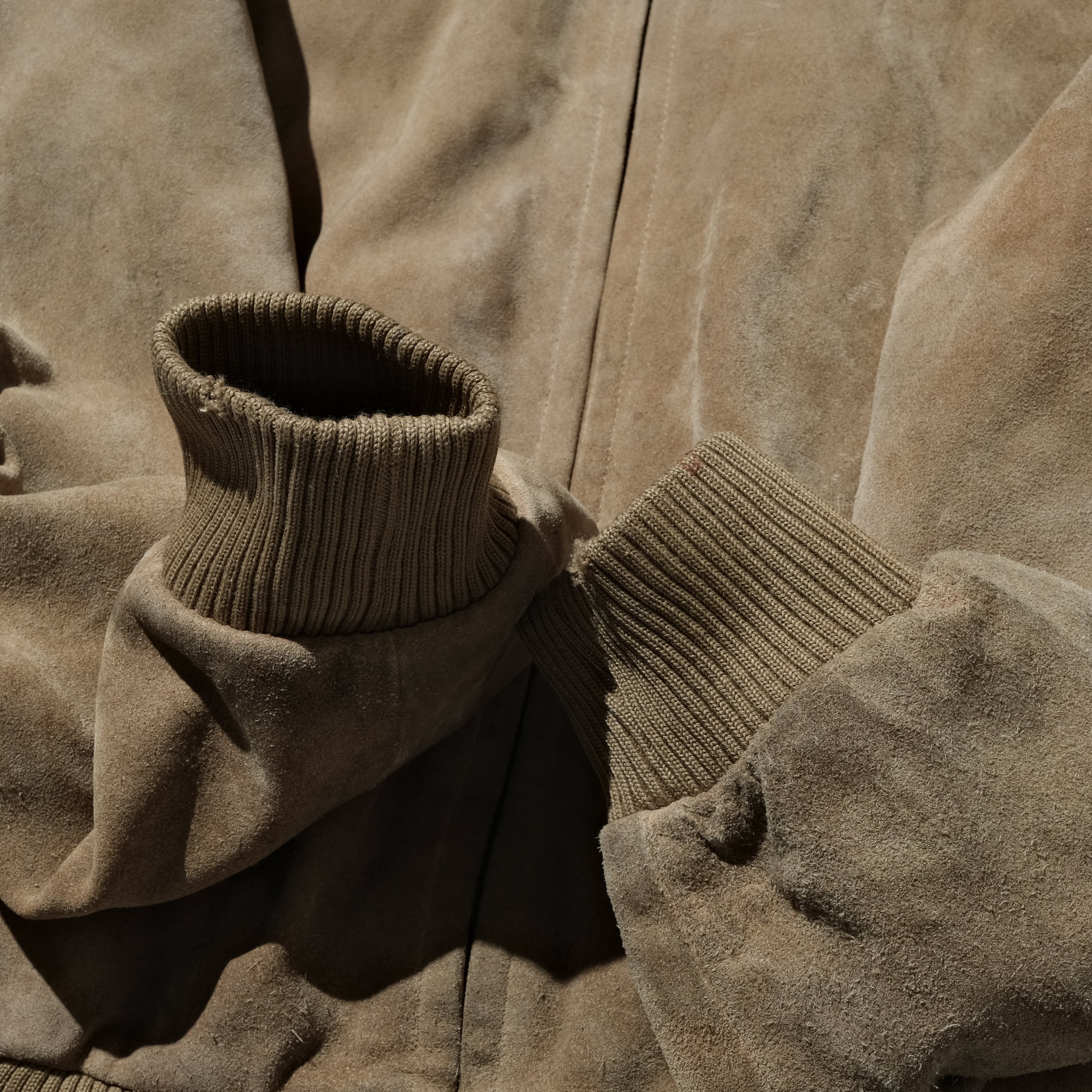 90'sのタグのつく香港製の一着。スエードタイプですのでヨゴレなどはみられますが非常にクールな一枚と言えるかと思います。