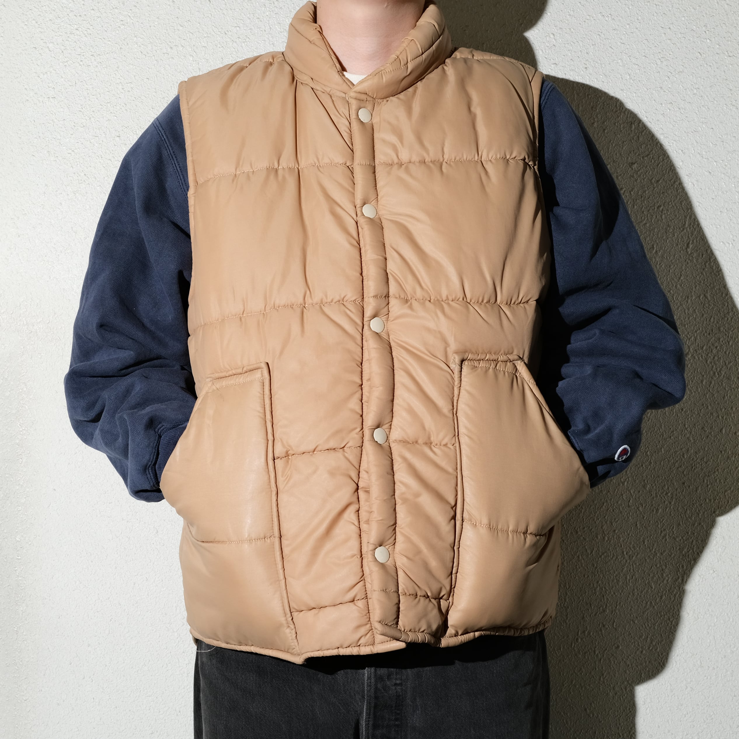 いわゆる中綿ベスト、こちらはおそらくポリエステルなどの保温性をもった中綿が詰まった一枚。オールドらしいルックスで、171cmがリバースウィーブの上から着用してもゆとりを持って着ることのできるサイズ感でした。