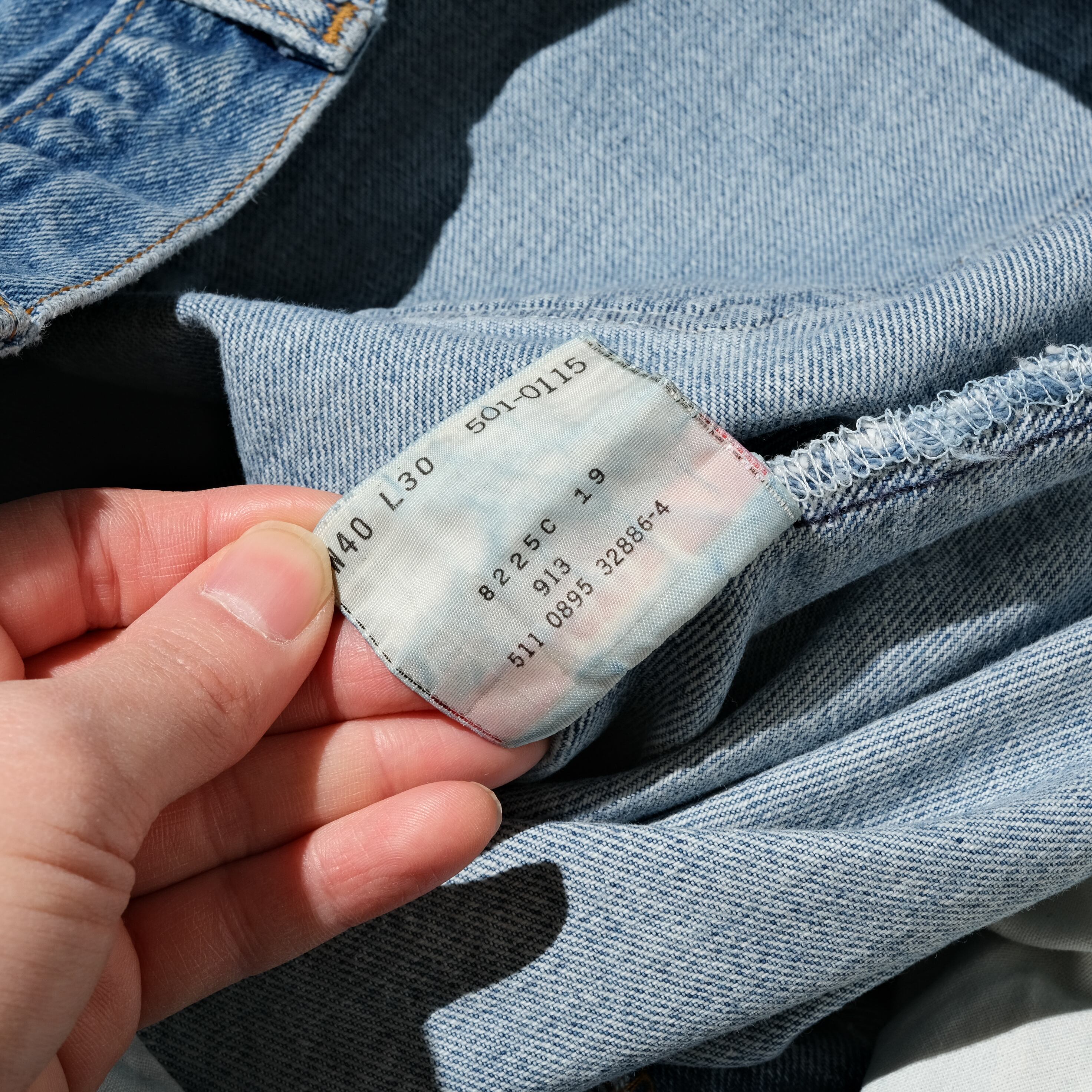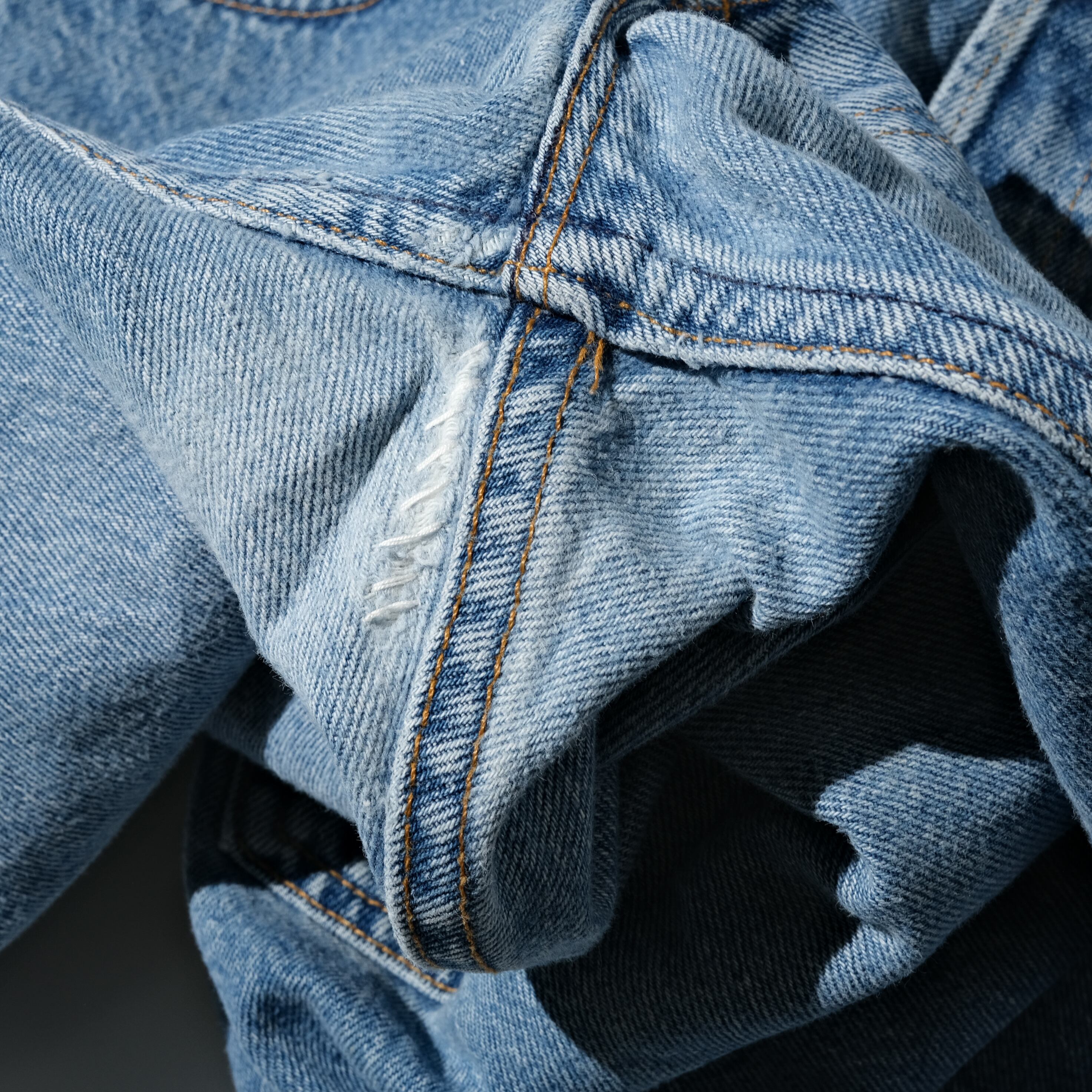 95年、USA製の一本。程よくフェードした表情が良い個体、W40の表記サイズではありますがそこは501ですのでチヂミが入り、実寸で37.5インチとベルトで絞って着用するのにはいいサイズになっております。