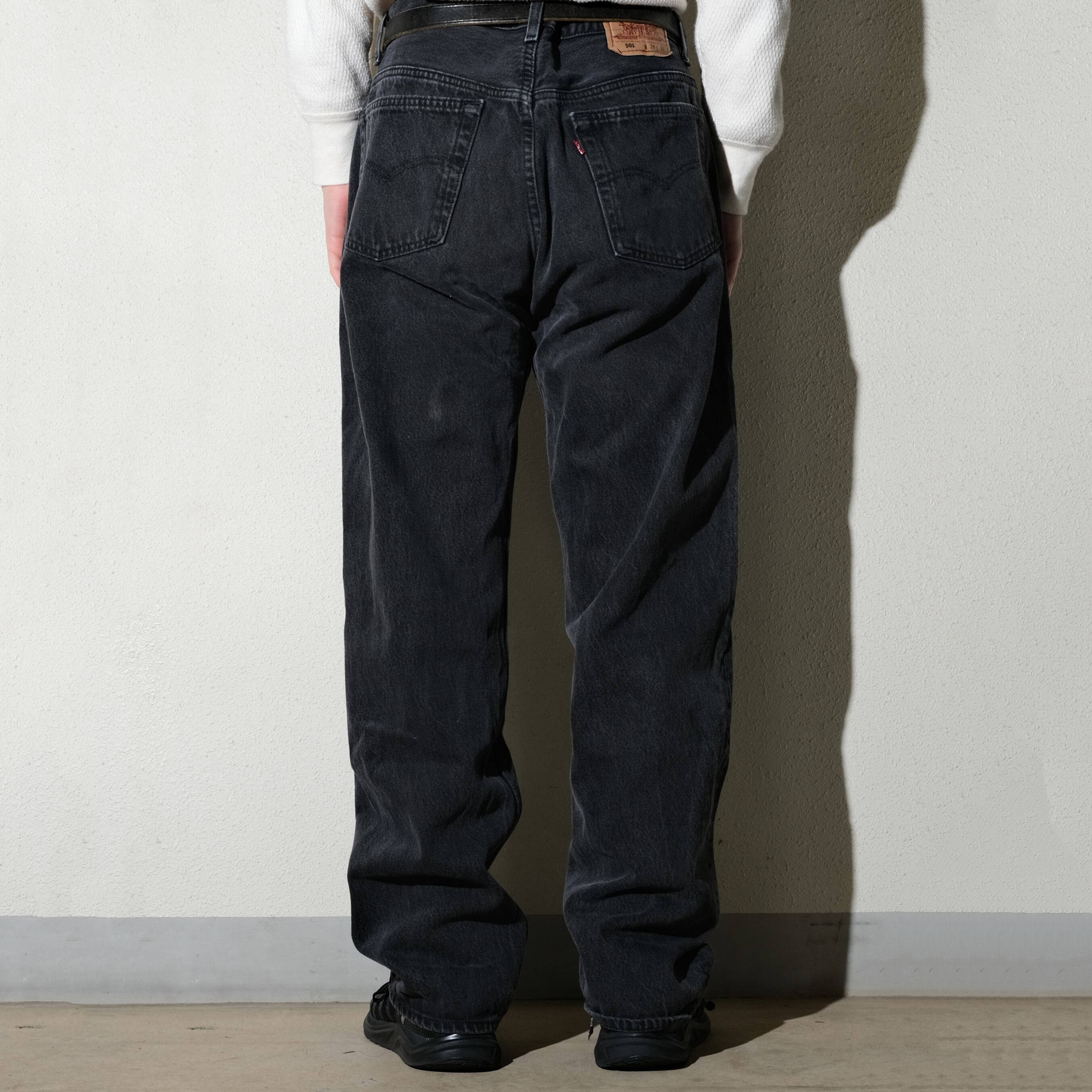 適度に穿き込まれ、フェードしたブラックインディゴがクールな一本。501特有のシュリンクで実寸36×31と良いサイズになっております。