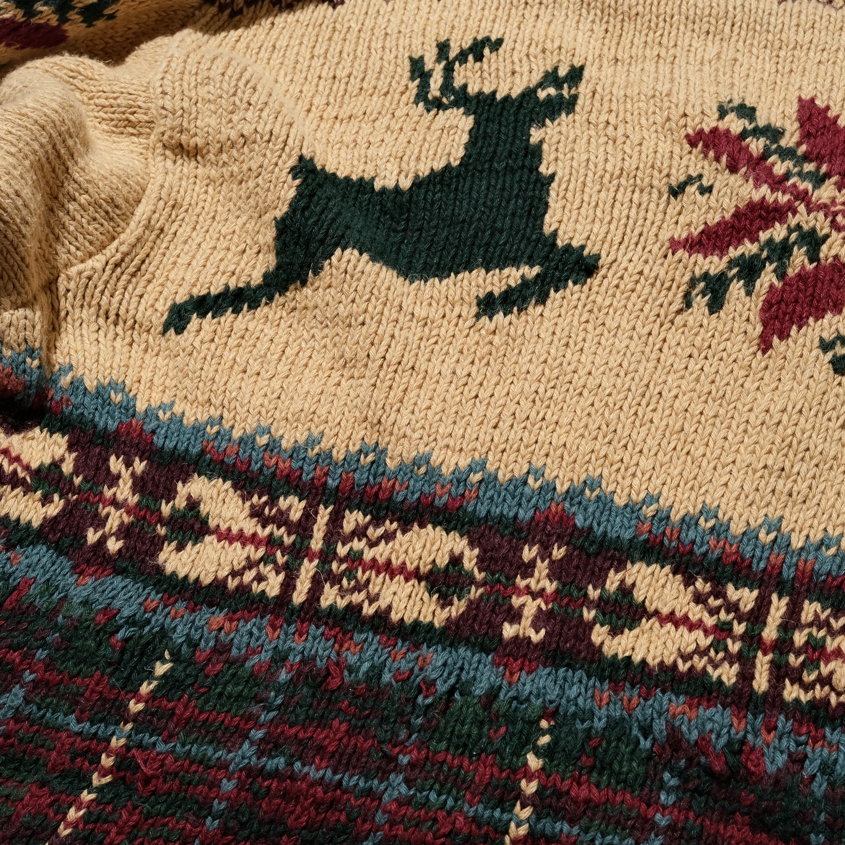 コットン/リネンの梱包素材、肌触りの良い上質な個体です。手編みならではの柄の凹凸感や生地の質感、やはり当時の定価が高かったアイテムですからこのプライスで手に入るのも古着の醍醐味と言えるでしょう。