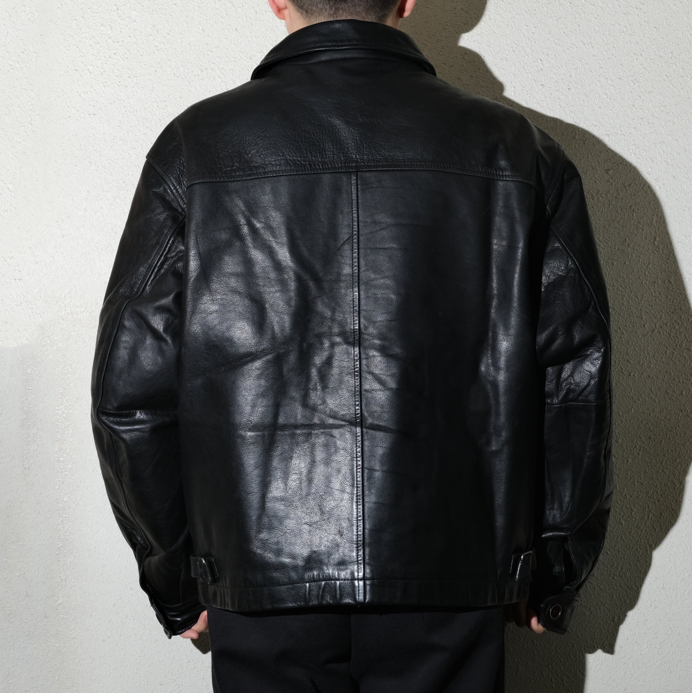 しっかりと身幅の取られたシルエットに肉厚なレザーの質感が非常にクールです。