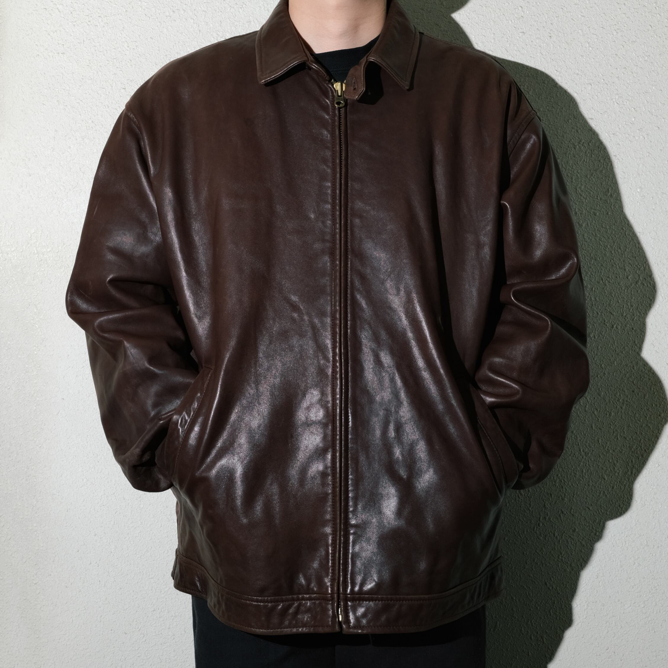 定番のダークブラウンのカラーの一枚。当店でも人気かつ定番的に仕入れているアイテム、こちらはまだまだレザー自体にはツヤの残るいい状態の個体です。
