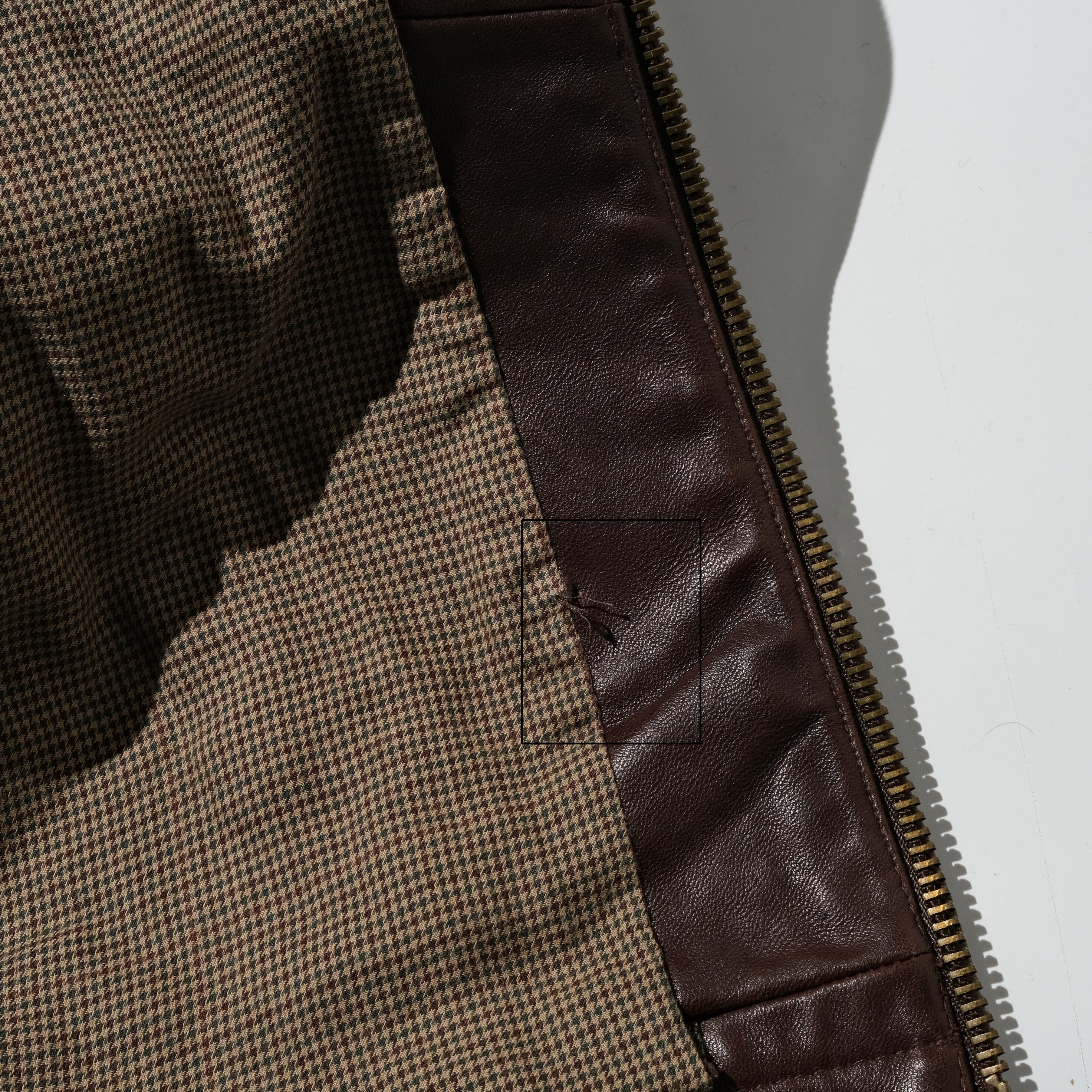 【状態】全体的にレザー特有の着用感、スレがございます。フロント右側に微かなシミ。右腕部に微かなヨゴレ。バック左側の腰部ボタンが1つ欠損、1つ欠損ののち付け替えられているかと思われます。付け替えられたものの裏ボタンは欠損しております。スペアのボタンが付いていた部分に微かな傷がございます。