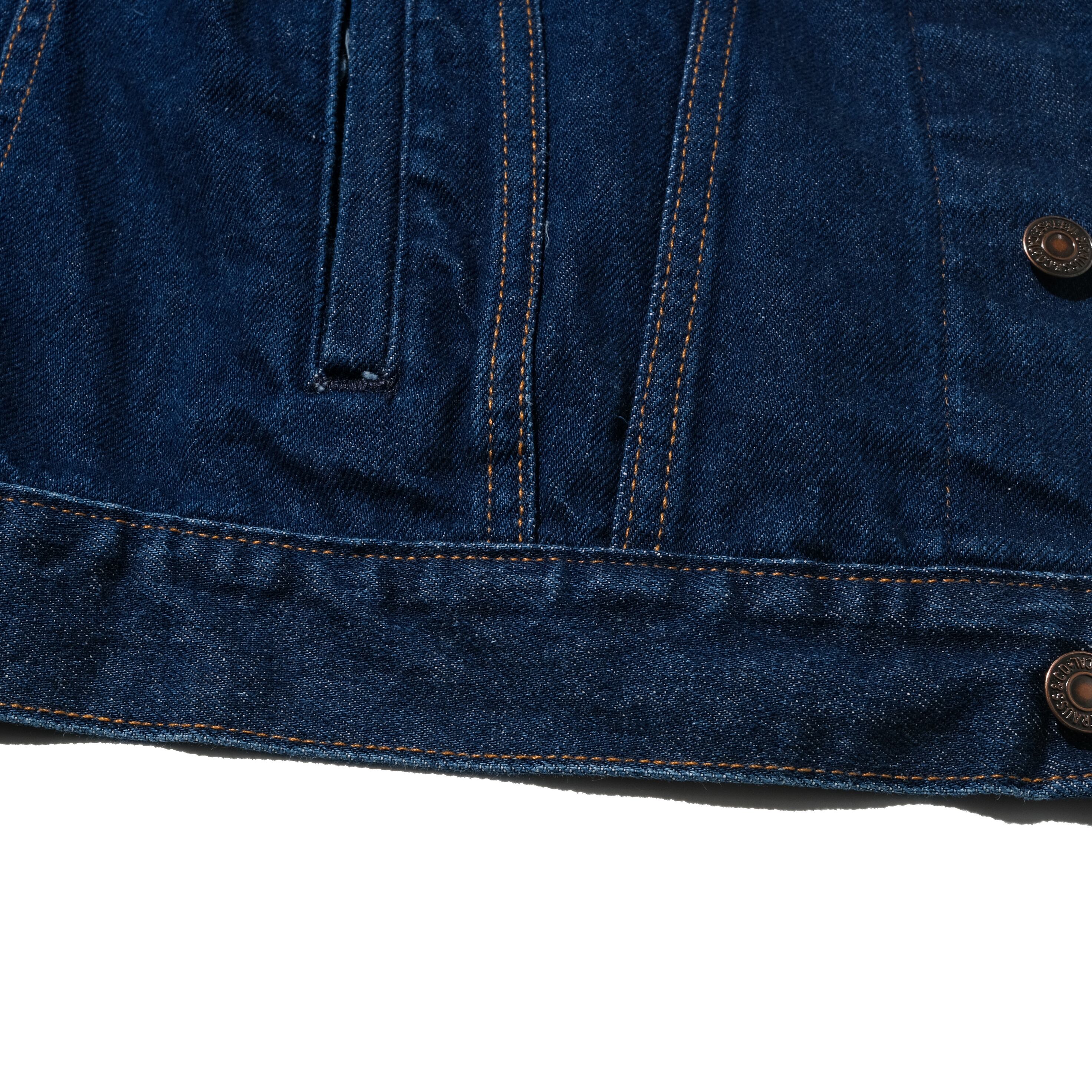 【状態】全体的に着用感、スレ。インディゴの濃く残る素晴らしい状態です。赤タブ、パッチ欠損。右袖にヨゴレ(濃紺のためあまり目立ちません)