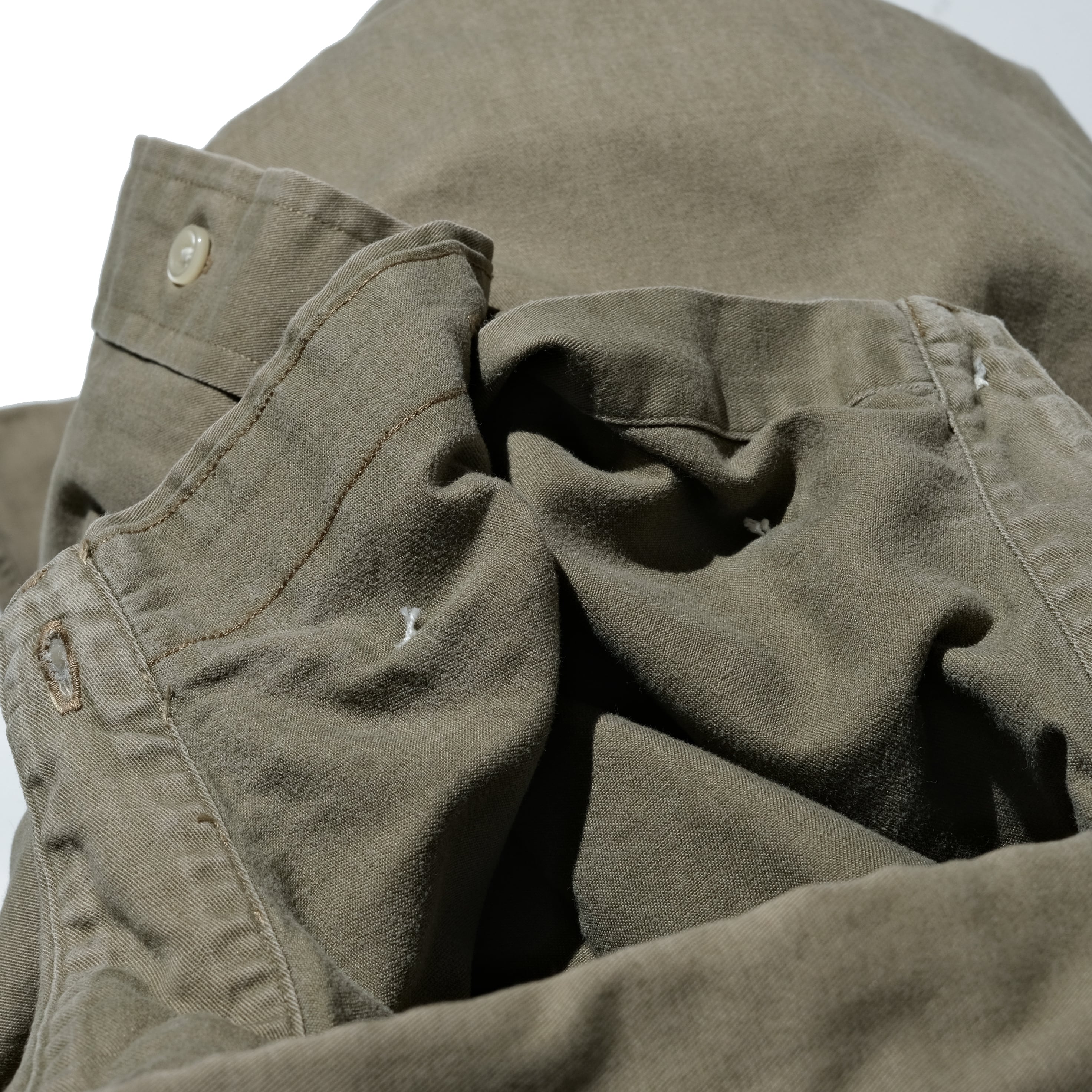 こちらはオリーブのカラーの無地のBDシャツ。オックスフォードよりは目が細かいクロスが使用されており、ガシガシ着用いただくことで経年変化も楽しんでいただけそうです。