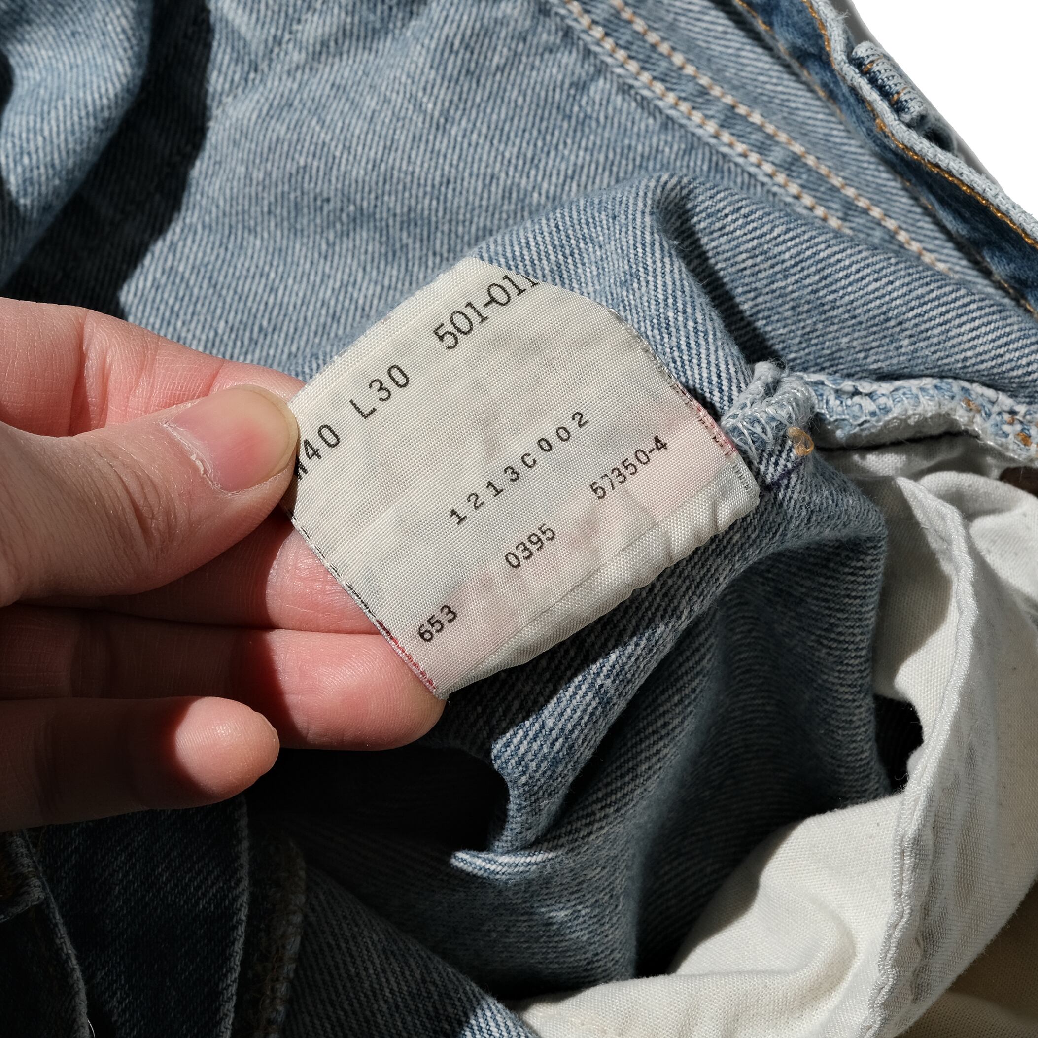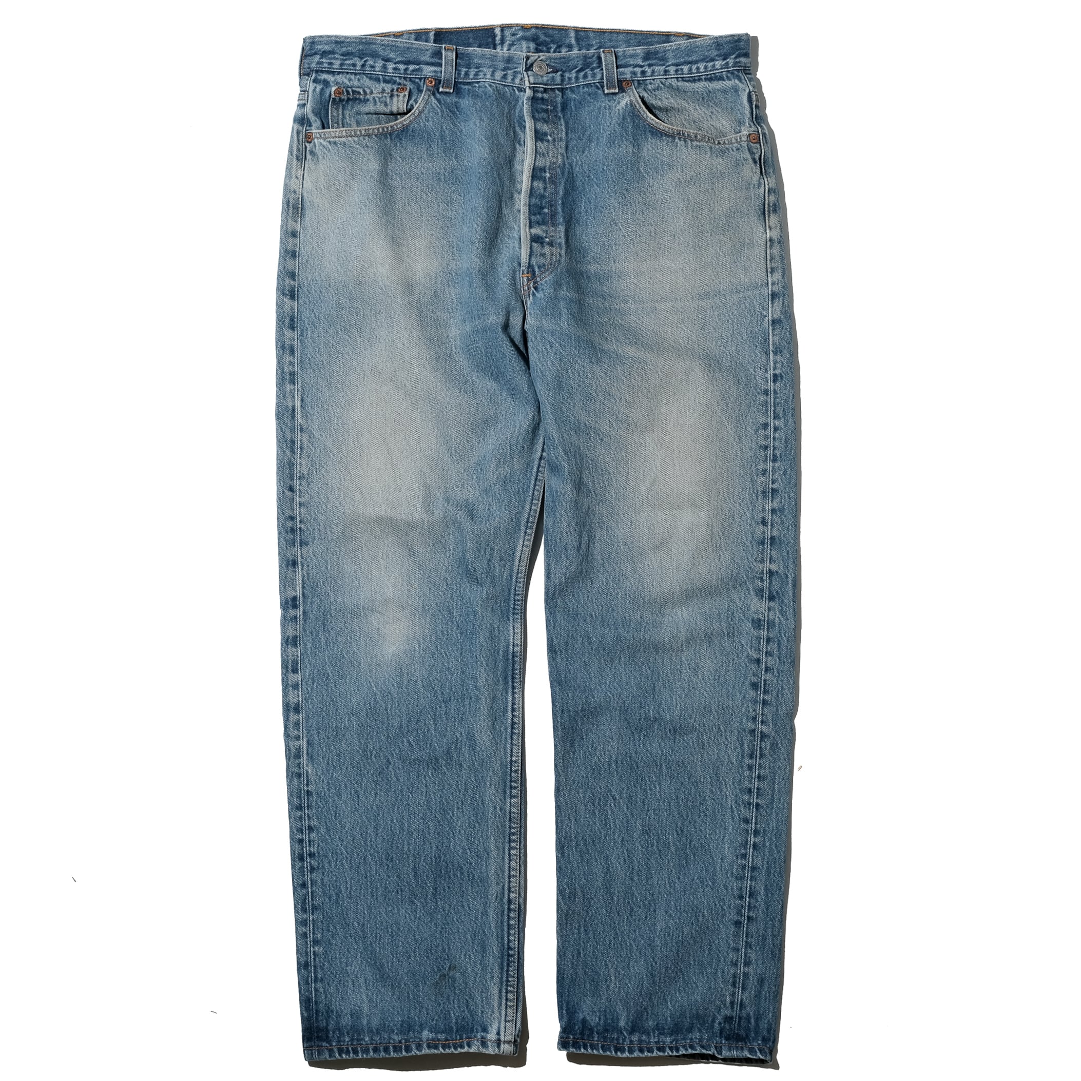 95年、USA製の一本。表記でW40のサイズですがシュリンクして実寸で37.5×29.5と良いバランスになった個体。ベルトで絞ることを前提とする場合、ウエストサイズは40表記程度であれば腰に溜まりも少ない印象。それよりもこのレングス30表記というほうが重要そうです。