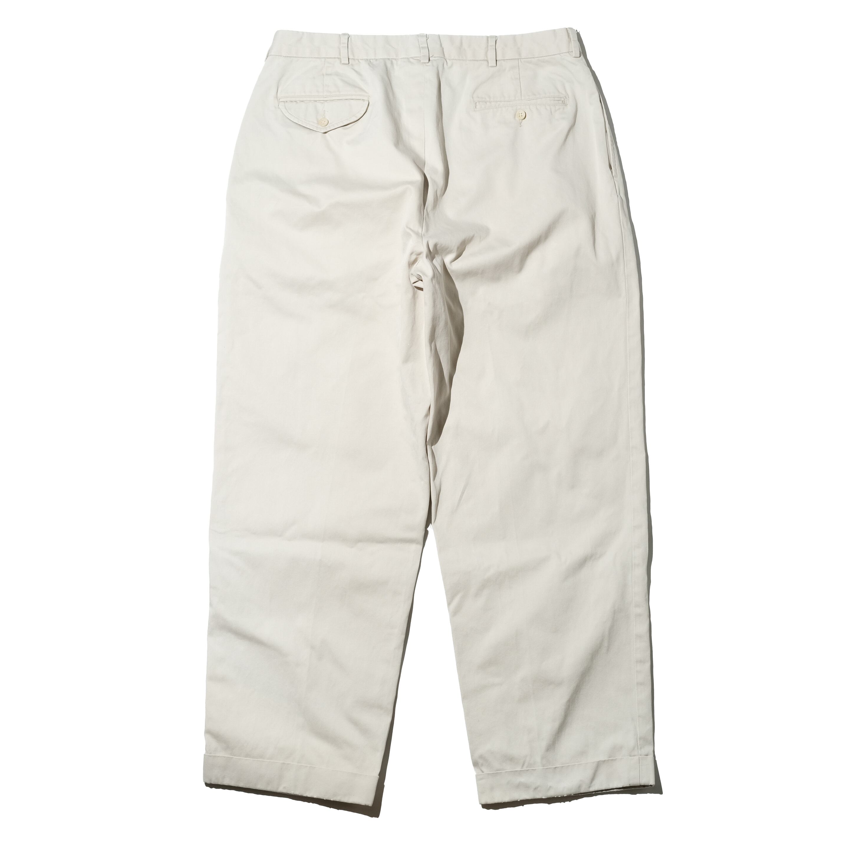 90'sのタグのつく古い一本。フロントはボタンではなくフックの仕様、2タックが入る少しドレッシーな雰囲気もある個体です。