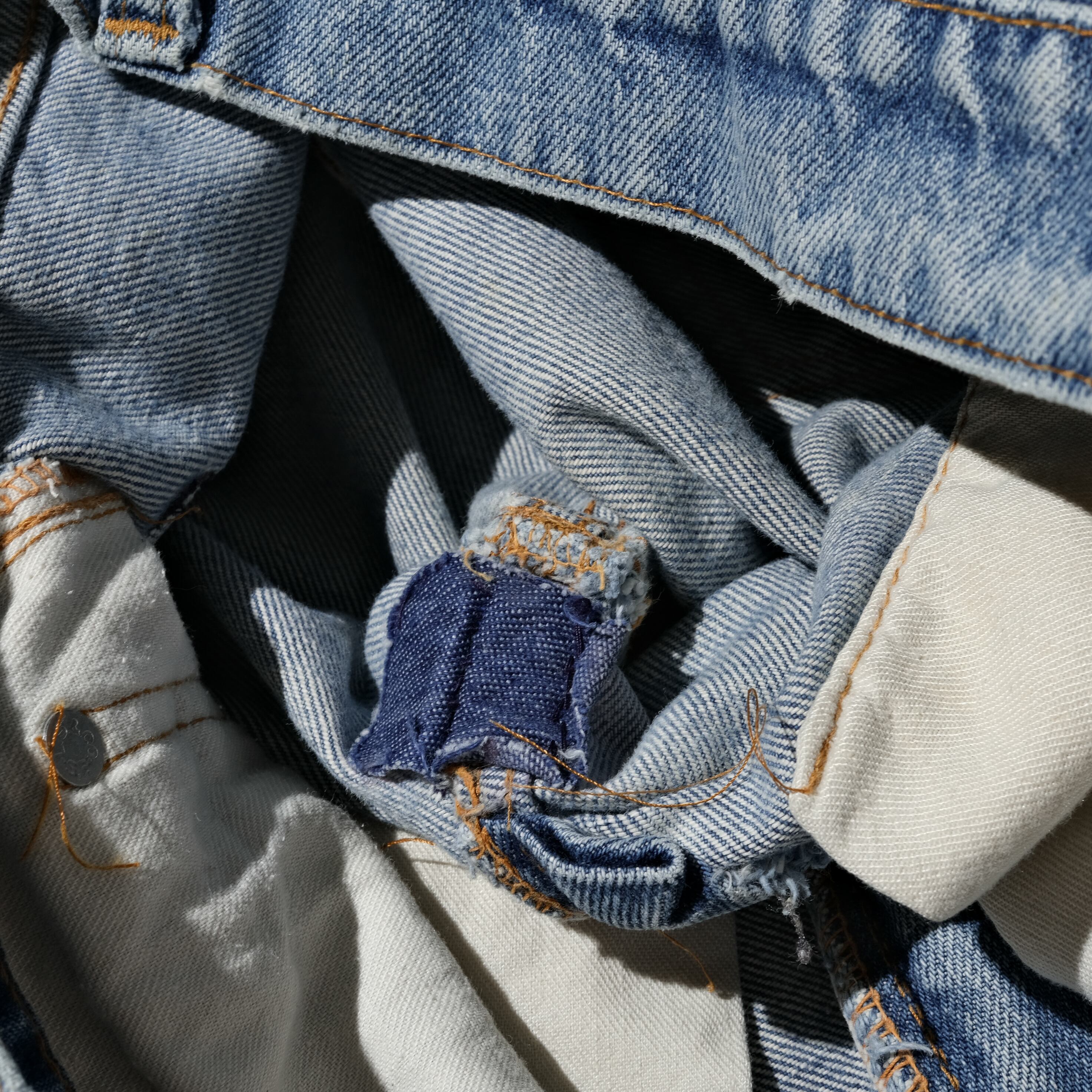 【状態】全体的に着用感、スレ。フェード。フロントにヨゴレ、キズ。右太ももに織りキズ。股部にリペア。裾部スレ、キズ。着用に支障のある大きなダメージやヨゴレなど見当たりません。