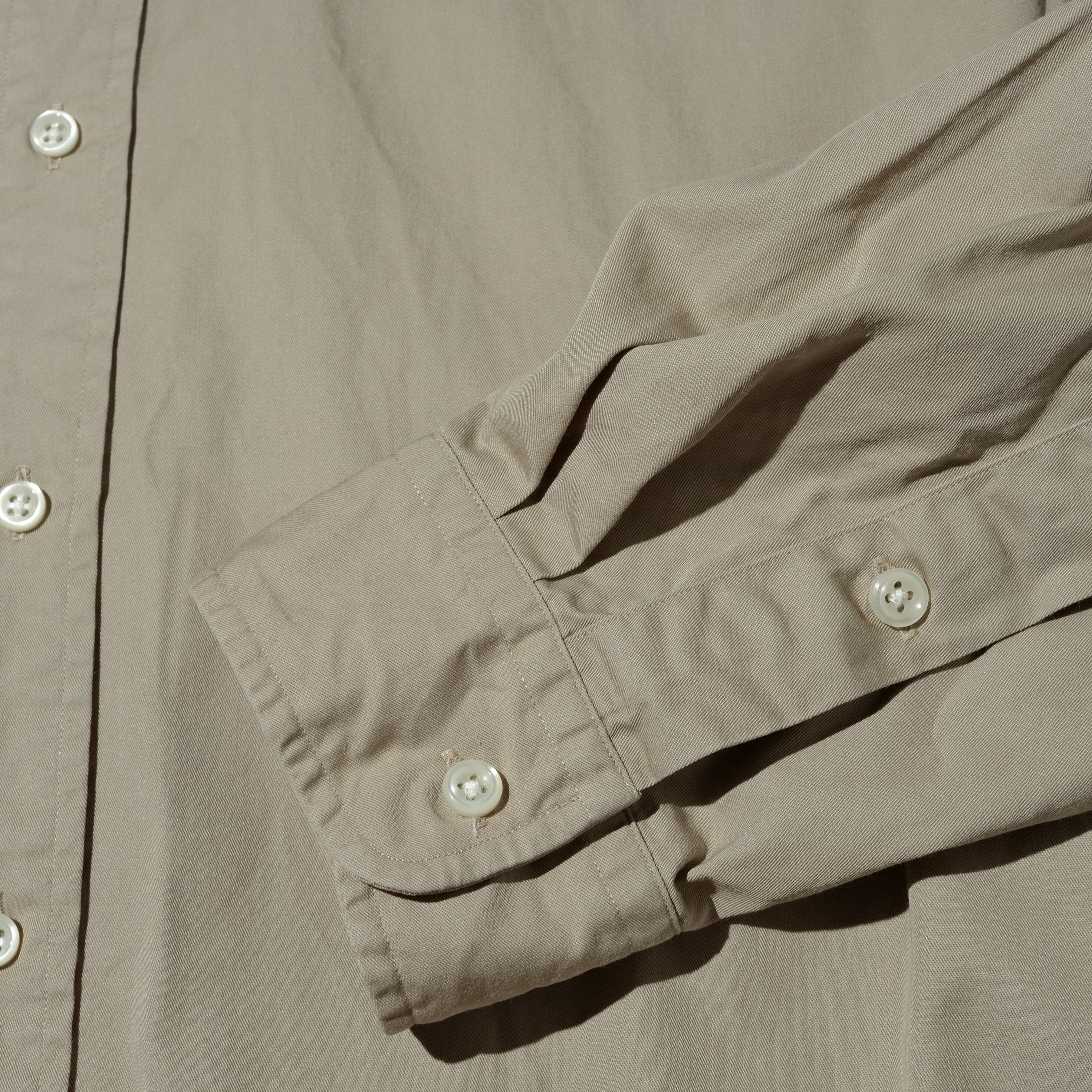 無地のツイル生地でこのベージュっぽいカラーというのは通年使えるカラーですので持っておいて損はないかと思います。長袖シャツのシーズンになりますと一気に見つからなくなりますので、今時期の室内ふくめた羽織としてぜひ。