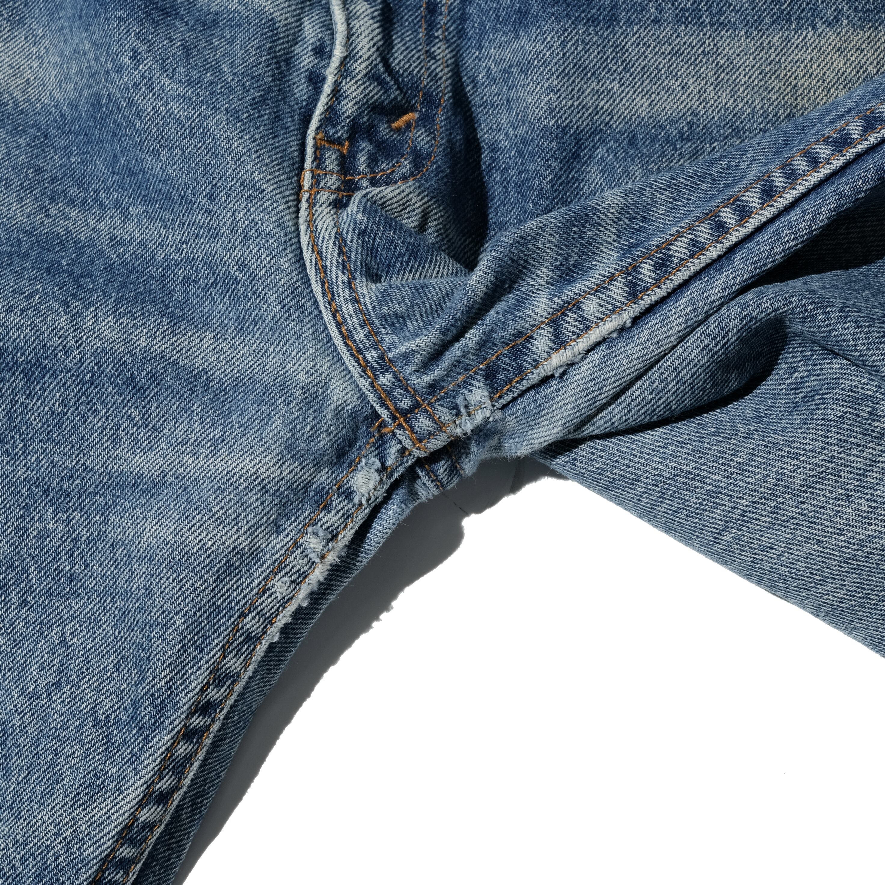 【状態】全体的に着用感、スレ。右側フロントポケット、スレーキにダメージ。裾部キズ。バックポケット右に小傷。左足裾付近にダメージ。股部キズ(貫通なし)。フロントにヨゴレ。着用に支障のある目立つダメージやヨゴレなど見当たりません。