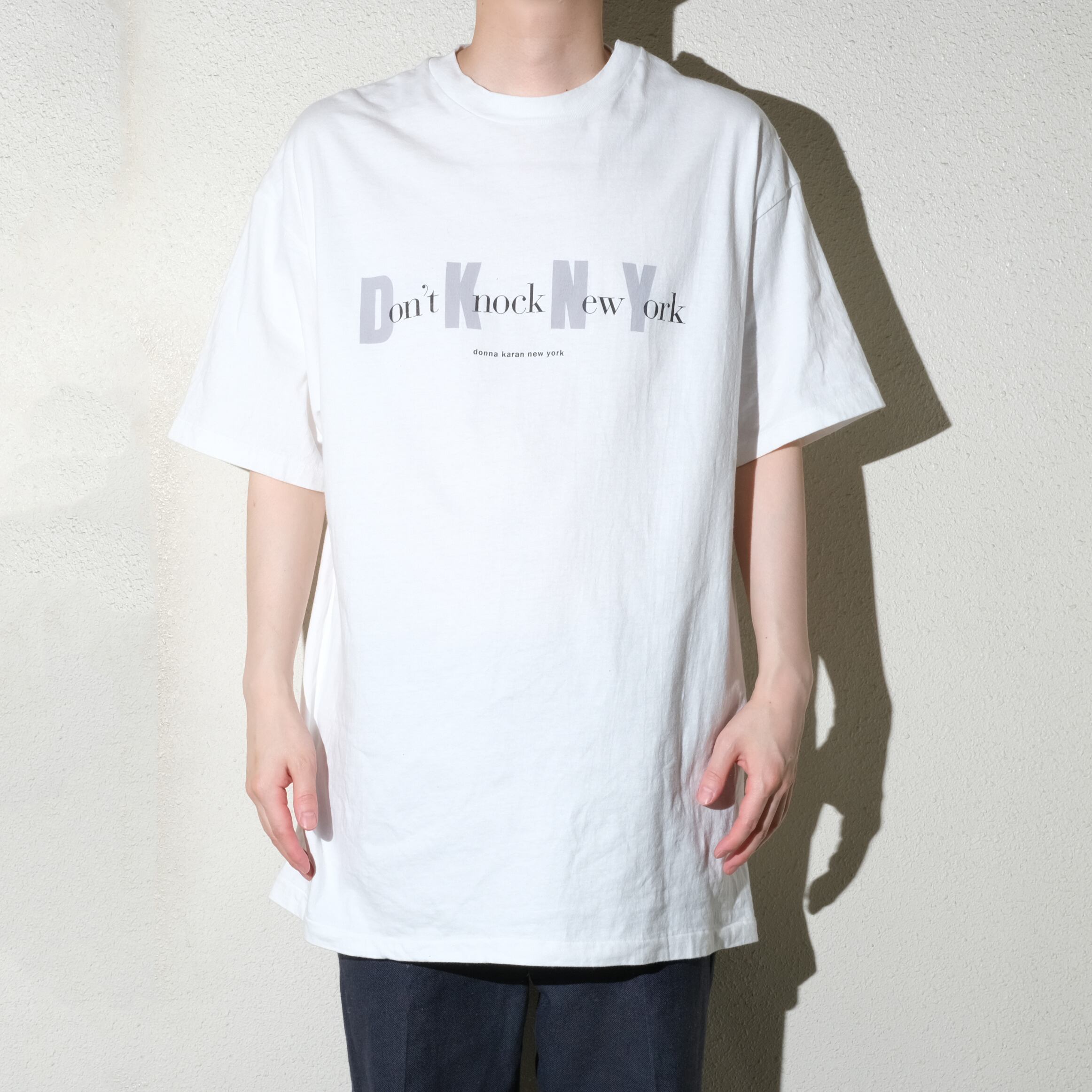 90'sの古着、いわゆるデザイン古着と呼ばれるジャンルで見かけることの多いDKNY。ご存知の通りダナキャランニューヨークと読みますがこちらはその頭文字にかけてDon't Knock Kew Yorkというプリントが入っております。