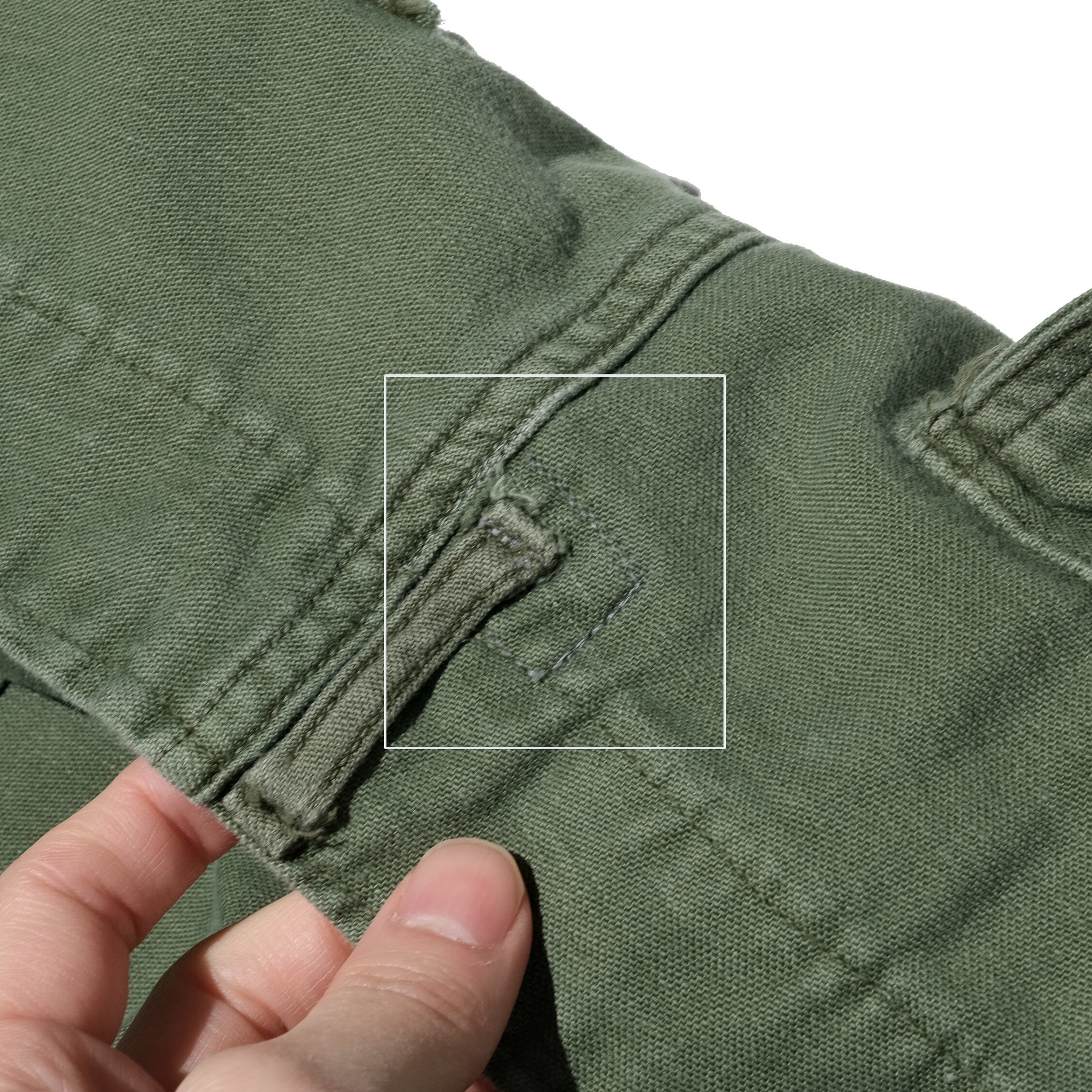 【状態】全体的に着用感、スレ。全体的にところどころキズ、ヨゴレ。ヒップ、裾部サイドにダメージがありましたので補修いたしました。バック部分ベルトループ付け根にリペア。右ポケットにダメージ。画像をご覧ください。