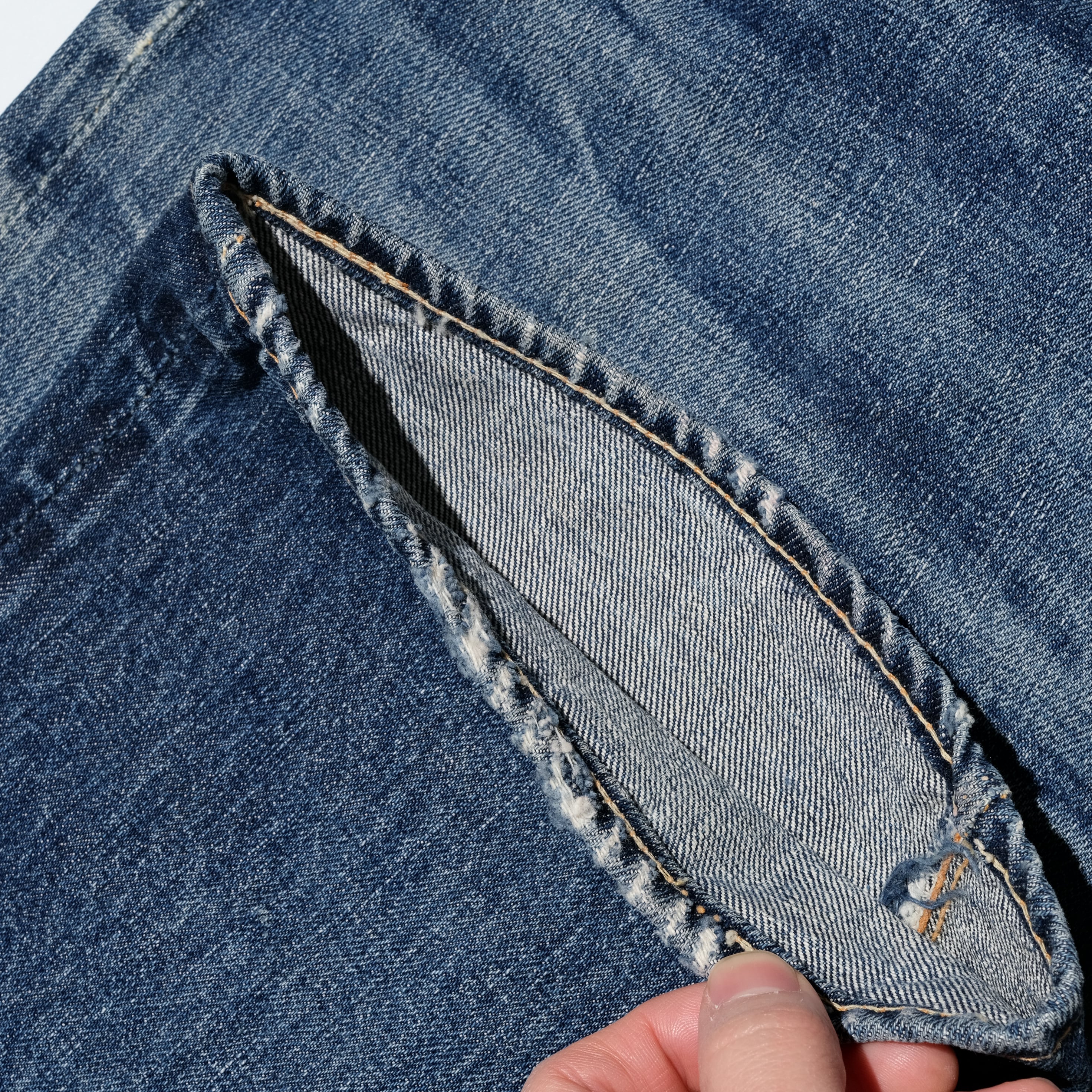やはり特筆すべきはこの色落ちでしょう。濃淡のクッキリとついたヒゲ、ハチノスなどのアタリ、ヴィンテージデニムらしい表情は格別です。
