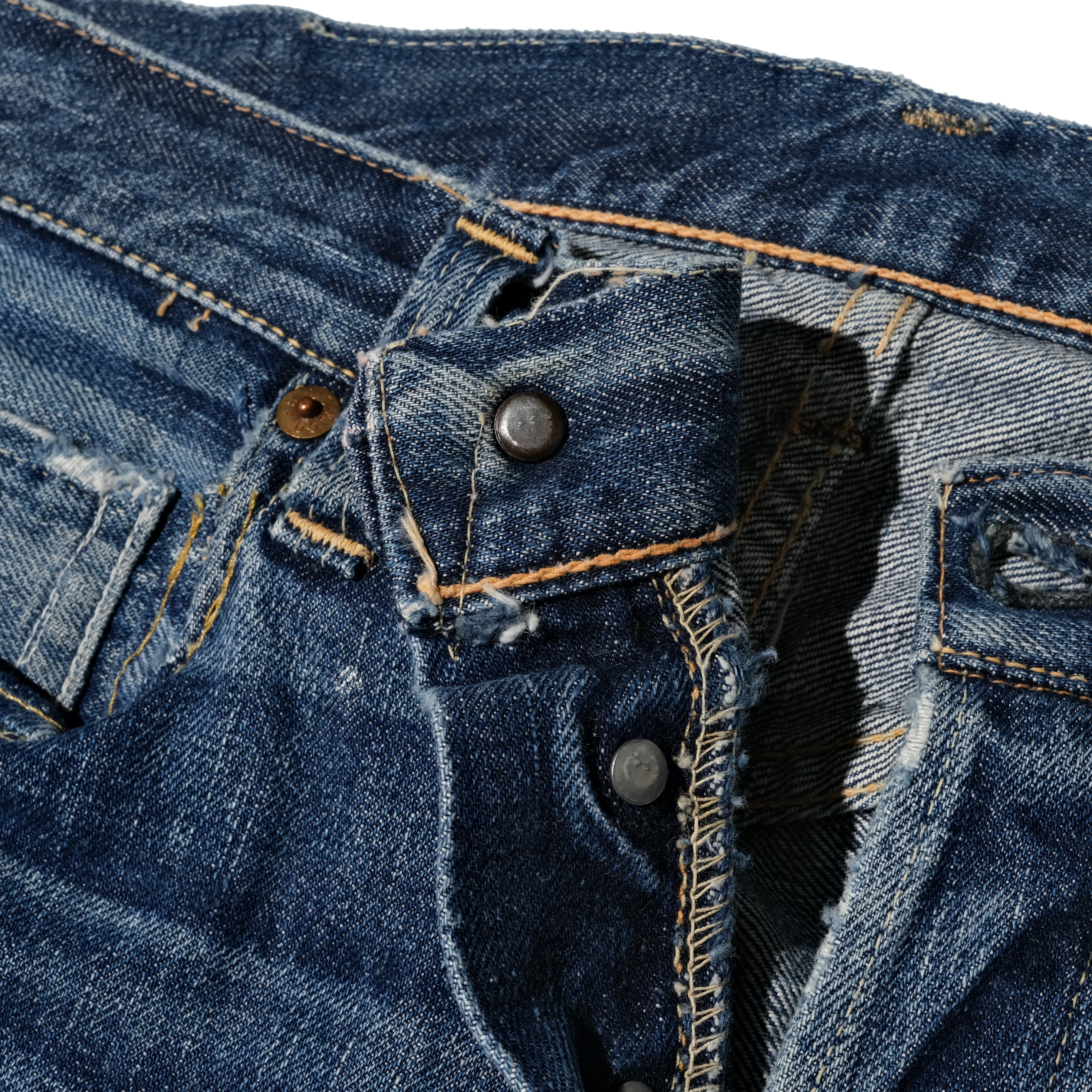 【状態】全体的に着用感、スレ。フェード。ところどころヴィンテージデニム特有のスレ、スリキレ、キズ、ステッチ抜け。フロントに若干のキズ。コインポケットリベット欠損。フロントポケット両方に前オーナーによるリペア(解いてもう一度リペアすることはできそうです)。パッチ欠損。ヒップに前オーナーによる小さなリペア。